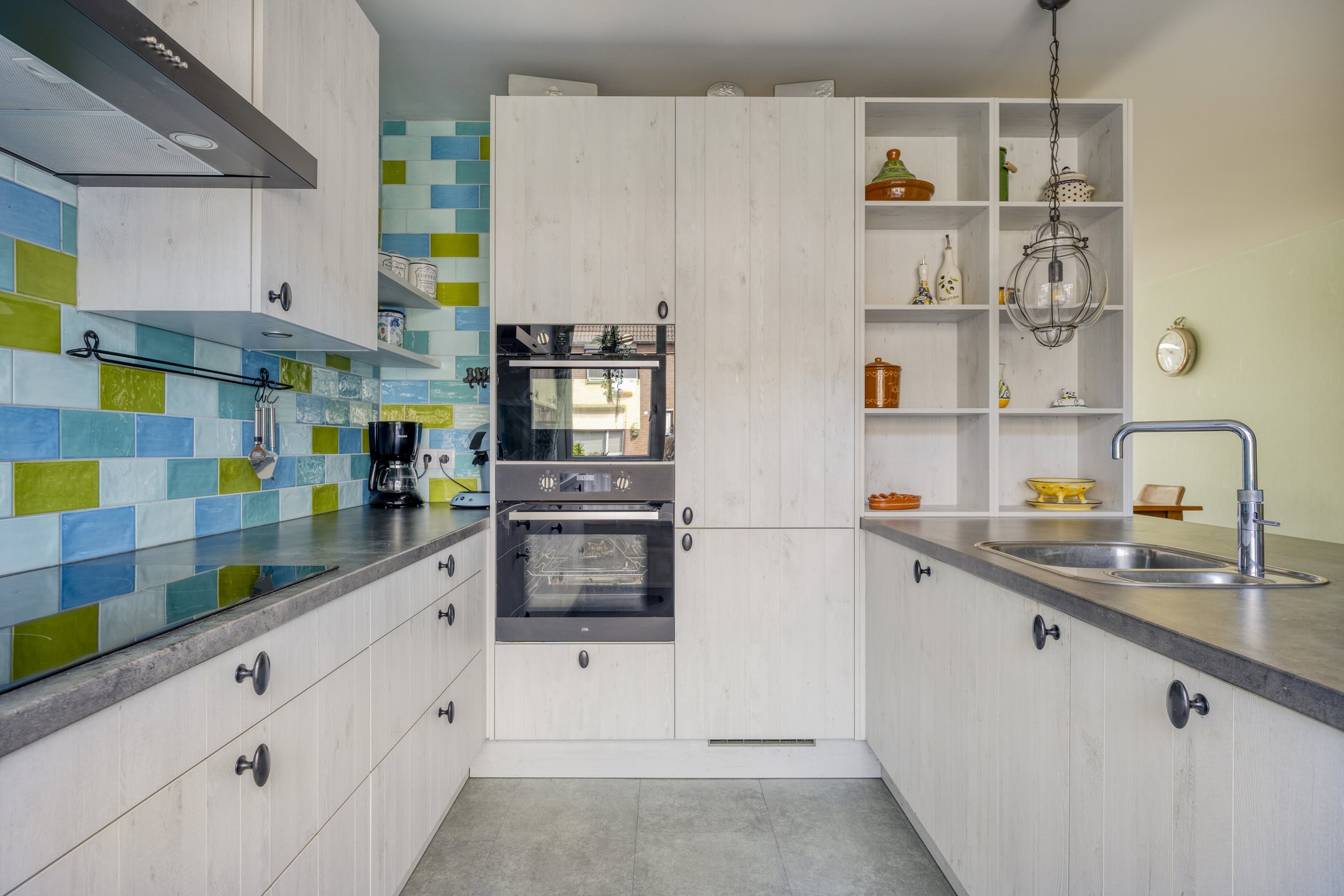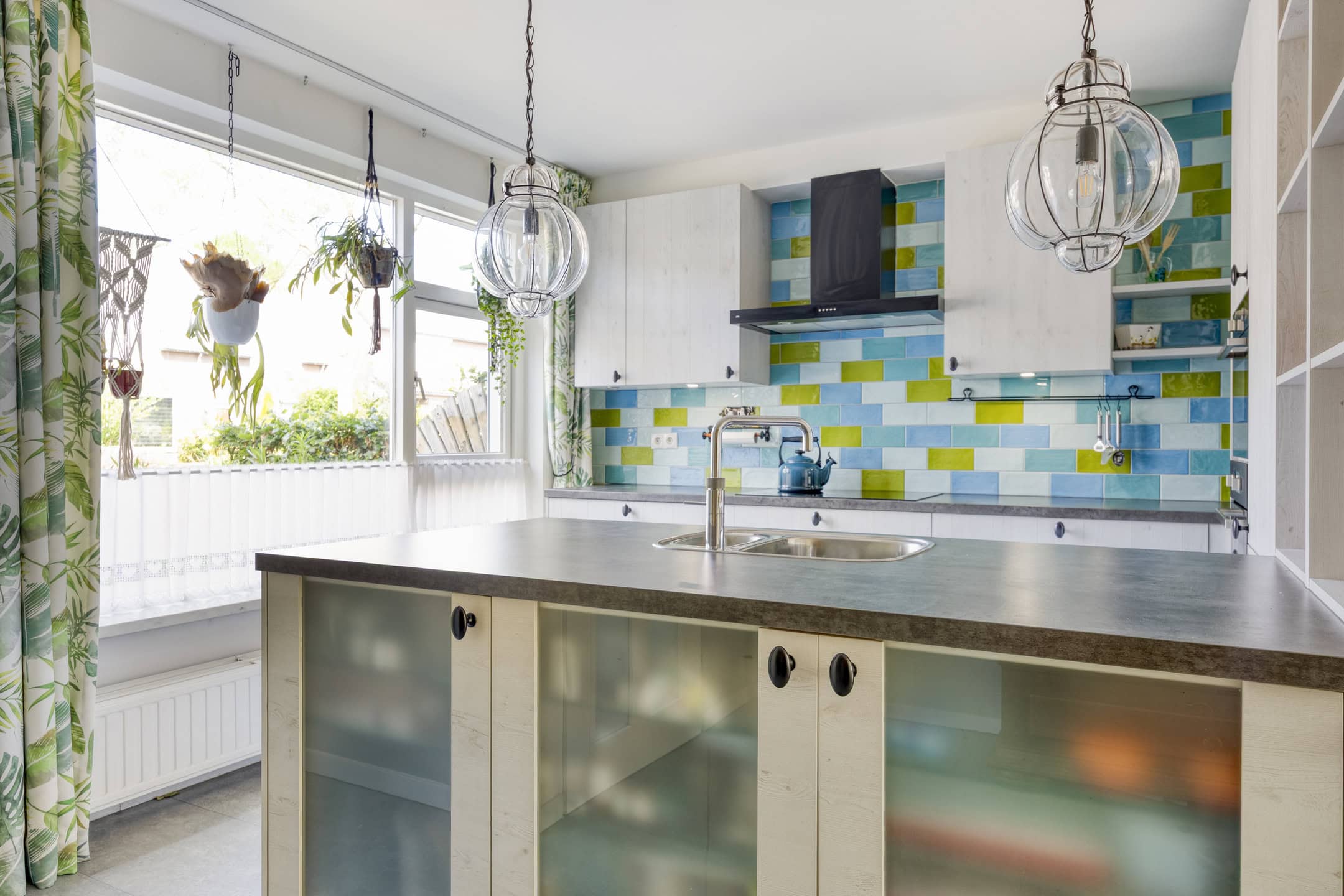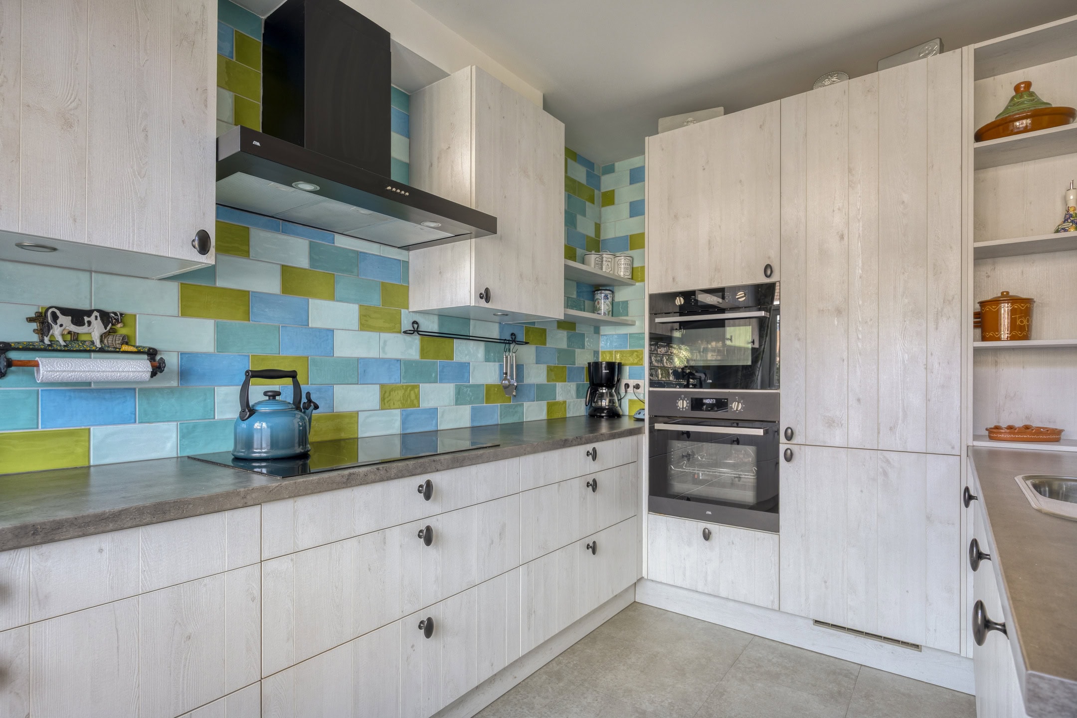 Aan de voorzijde ligt de moderne leefkeuken, vernieuwd in 2017. Dankzij het spoel(schier)eiland is er volop werkruimte en contact met de rest van het gezin of je gasten. De keuken is compleet uitgerust met een inductiekookplaat, vaatwasser, koel-vriescombinatie, afzuigkap en een Quooker kraan. Het elektrische rolluik aan de voorzijde zorgt voor extra comfort.