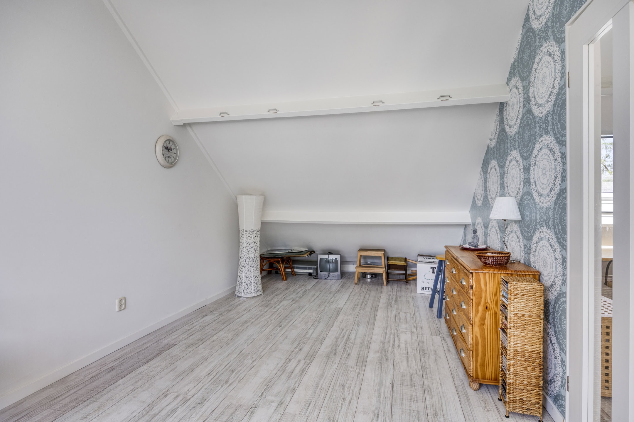 De derde slaapkamer is royaal en dankzij de dakkapel heerlijk licht. Onder de schuine kanten is volop bergruimte achter schuifpanelen.