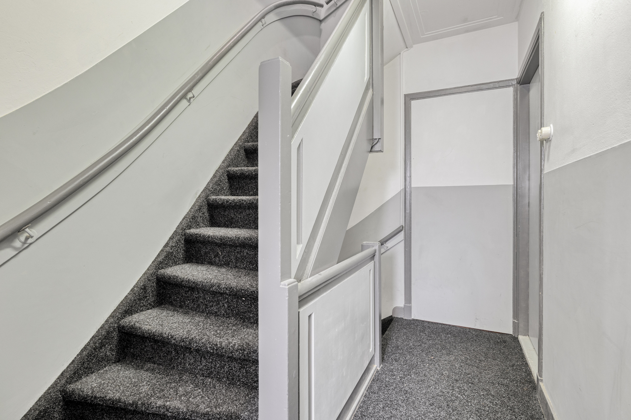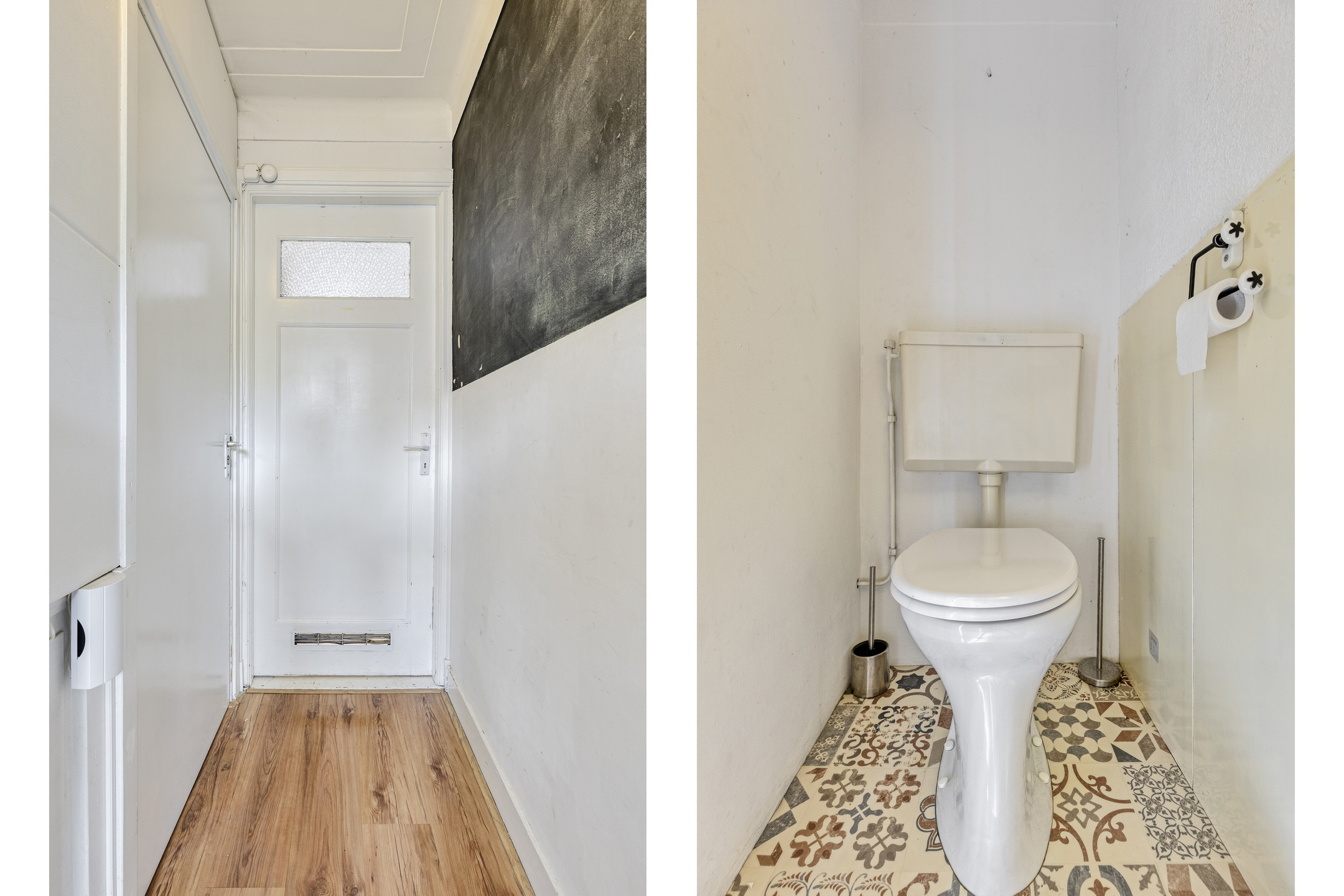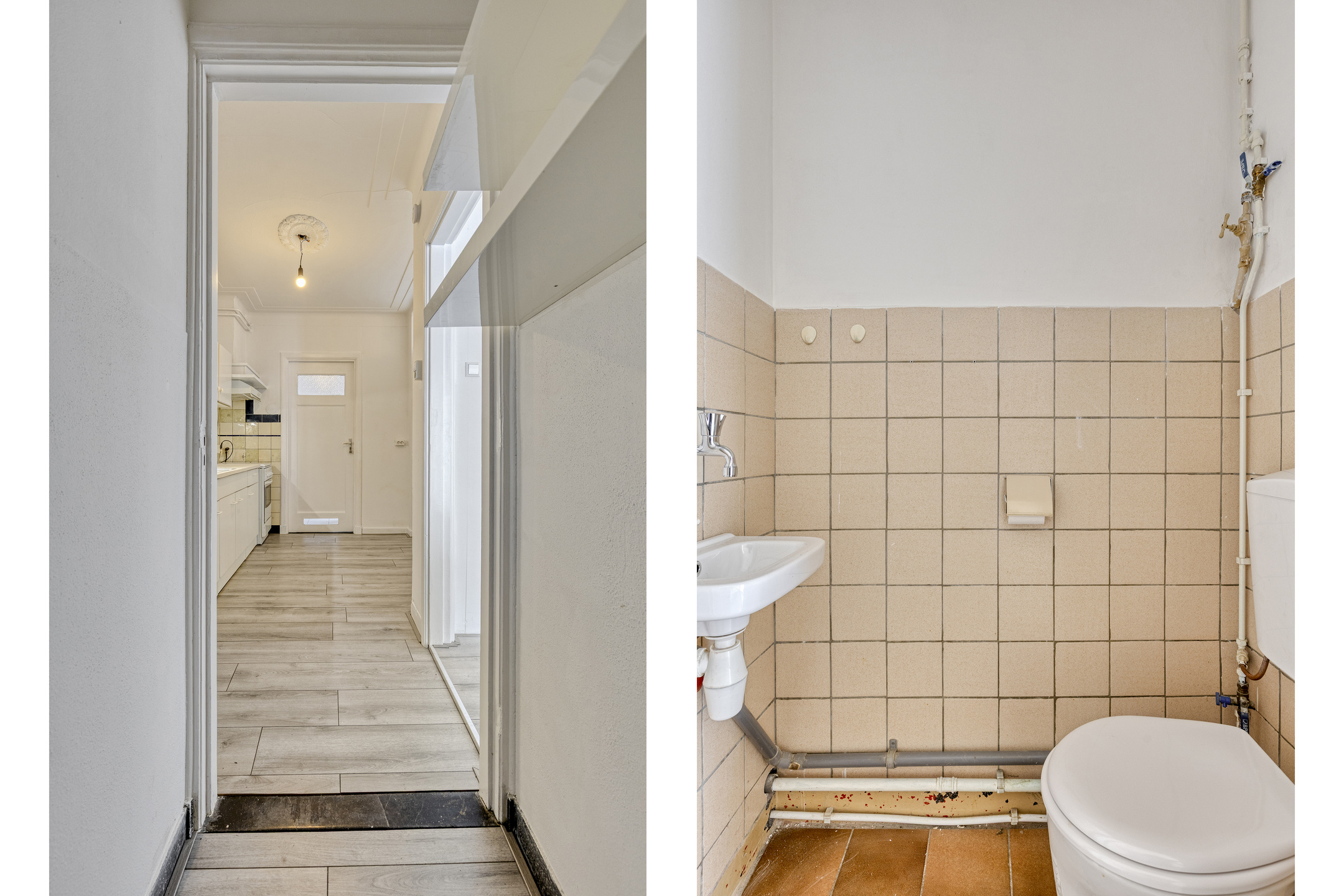 Via de hoofdentree kom je binnen in de hal, waar direct de klassieke opzet van de woning voelbaar is. Hier bevinden zich de trap naar boven, een praktische kelderkast en de toiletruimte. De begane grond heeft een zelfstandige entree. Ideaal wanneer je wonen en werken wil combineren.