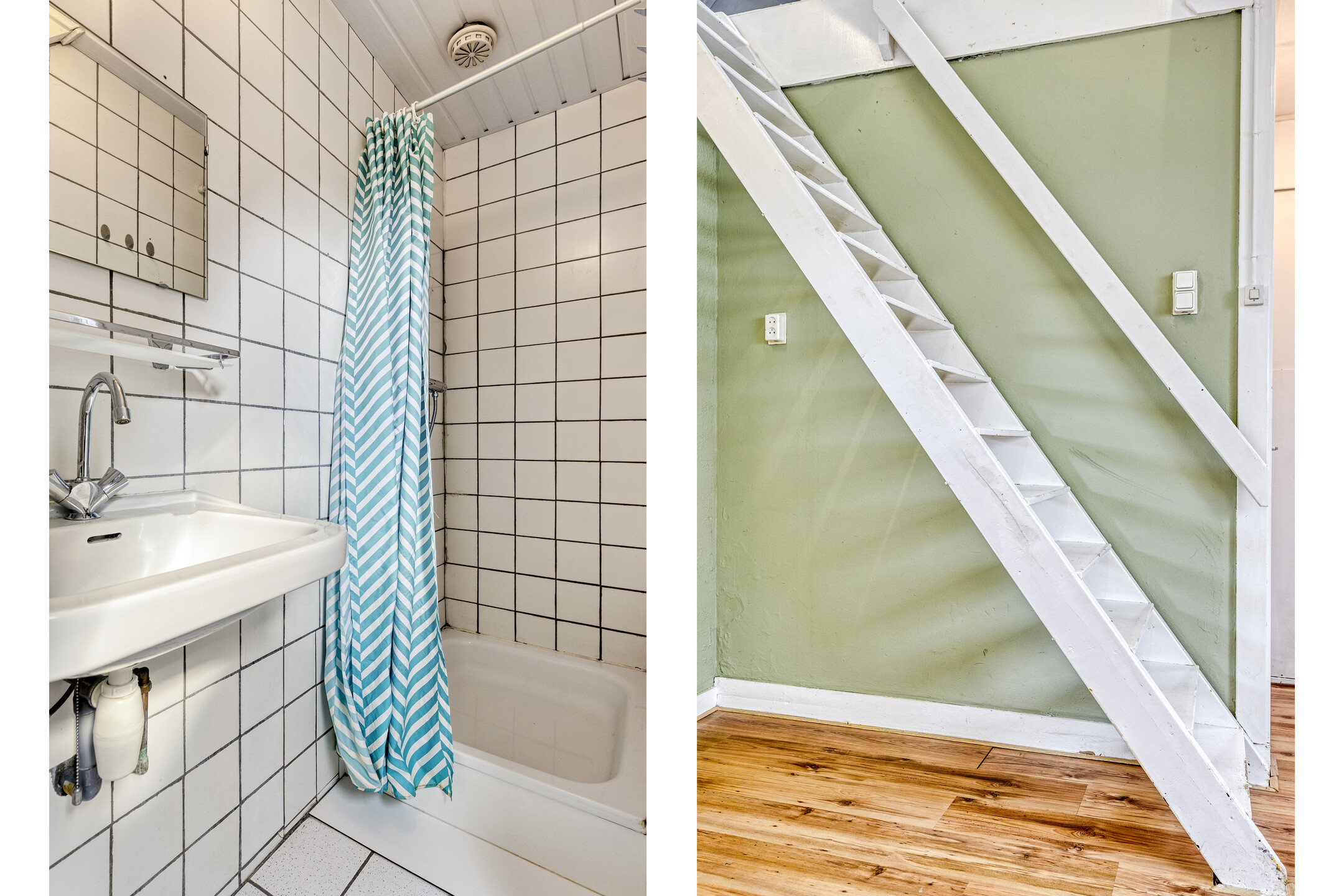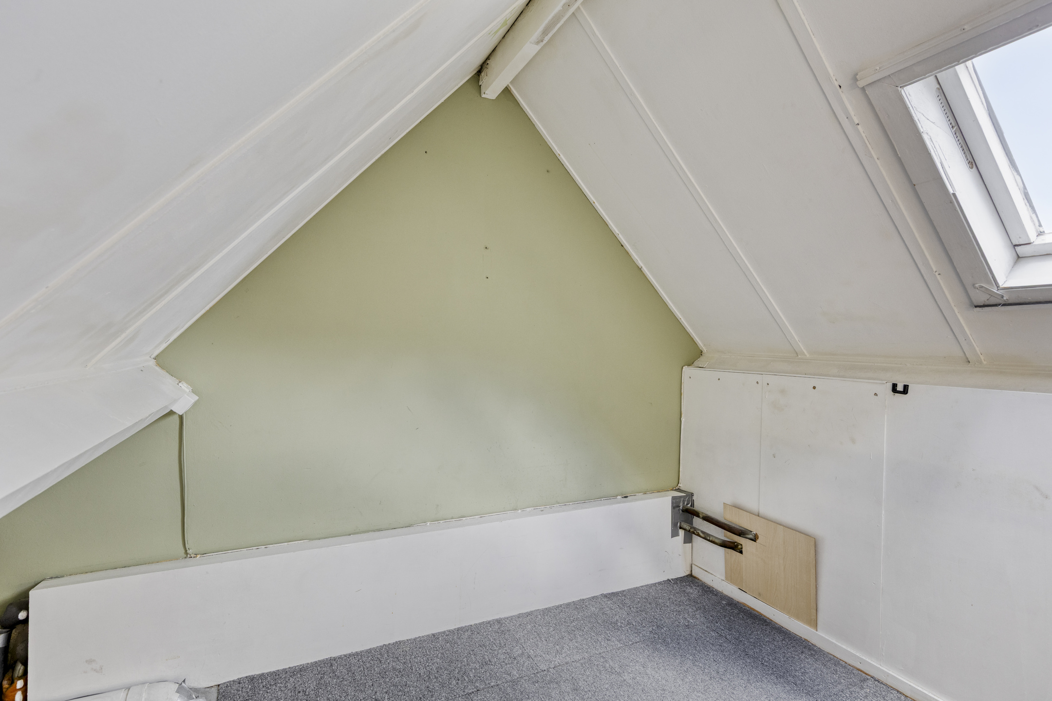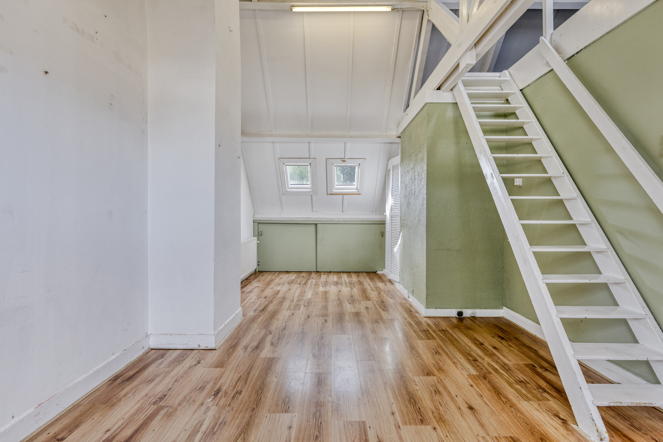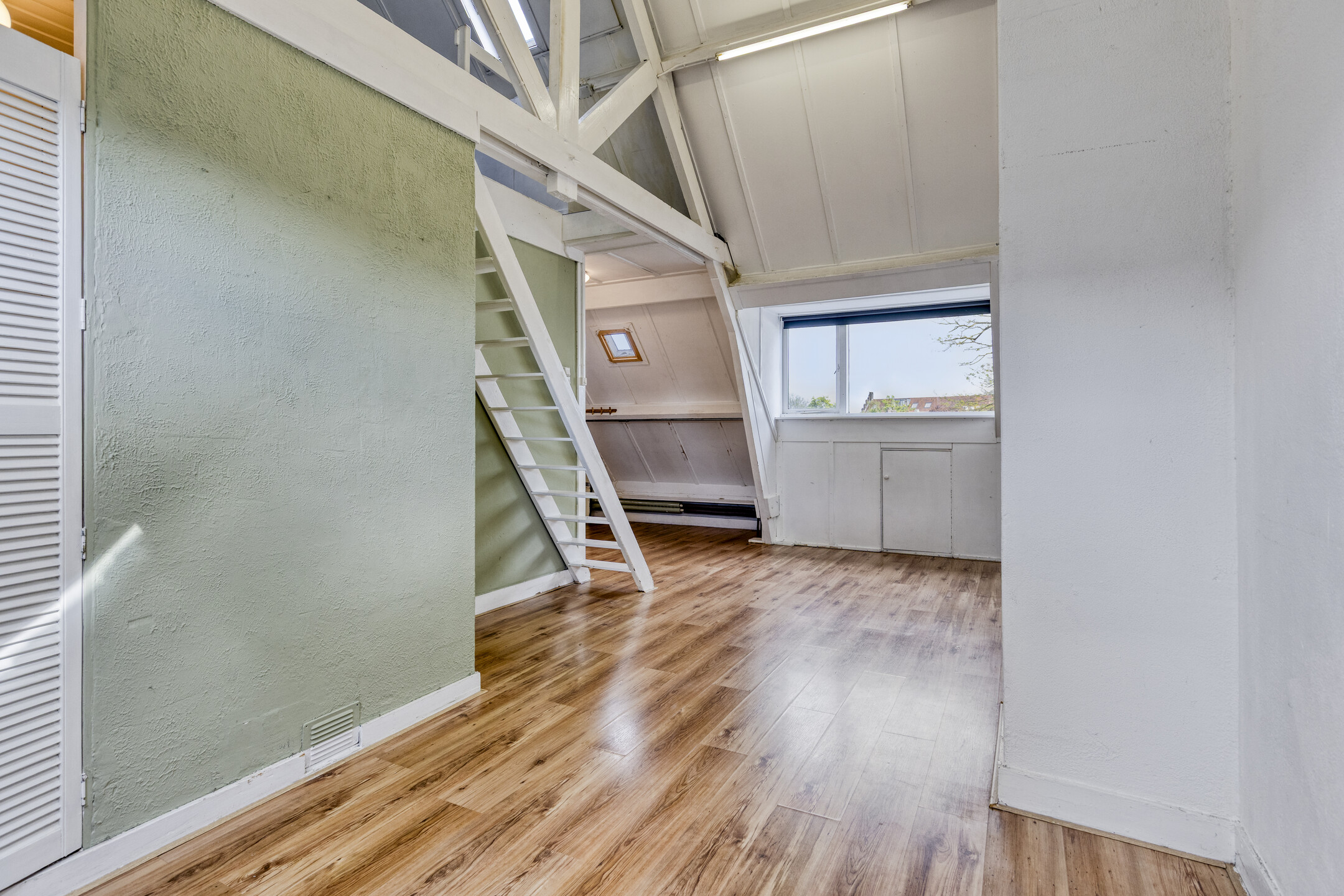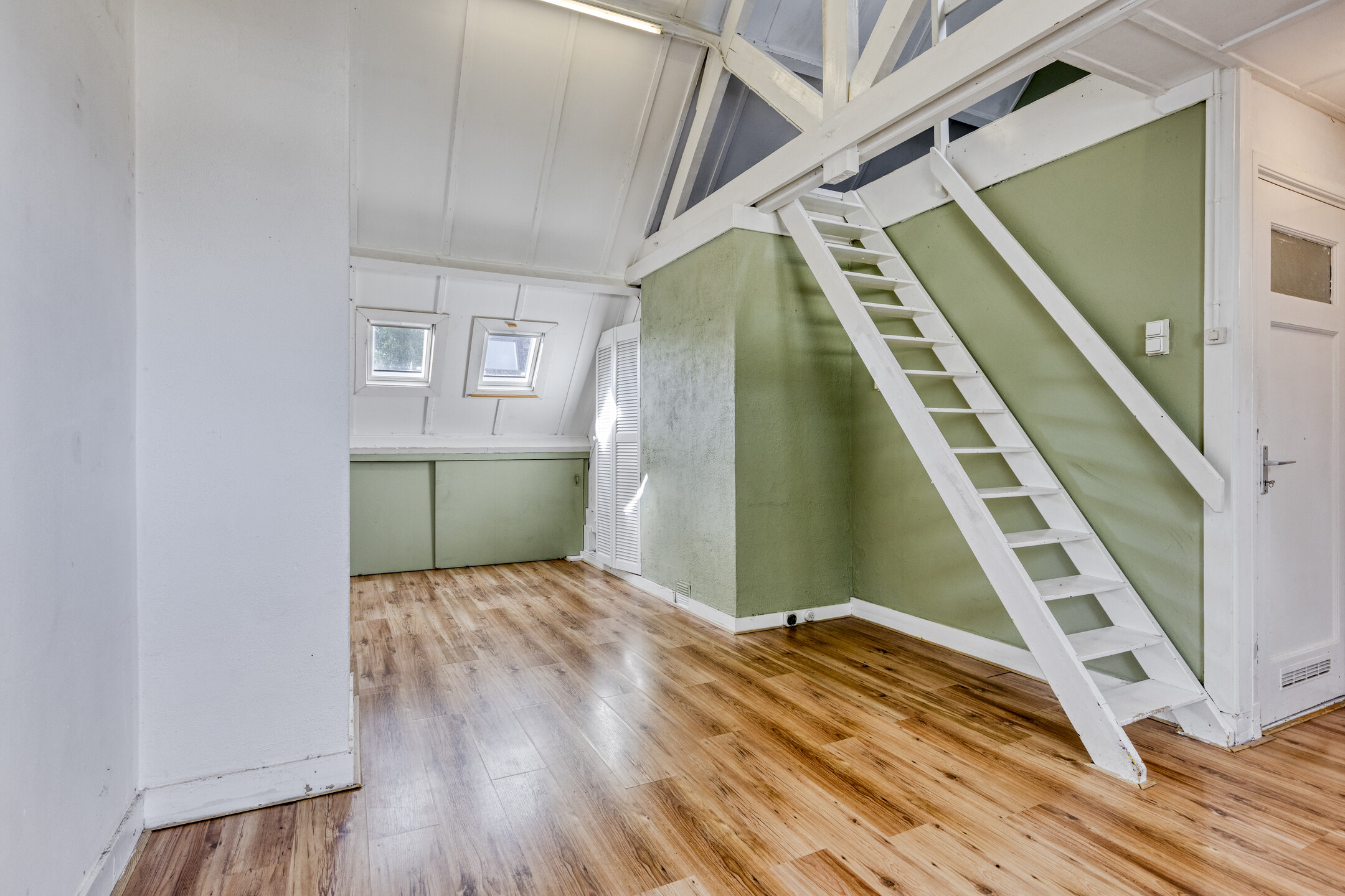 De tweede verdieping heeft een open en verrassend speels karakter. Op de overloop bevindt zich een klein keukentje met dakkapel, evenals de opstelling van de cv-ketel en een aparte toiletruimte. De open leefruimte voelt licht en veelzijdig aan en kan worden gebruikt als woonkamer, werkruimte of extra slaapkamer. Via een interne trap bereik je de slaapvide, die zich perfect leent als rustige slaapplaats, hobbyruimte of thuiswerkplek.