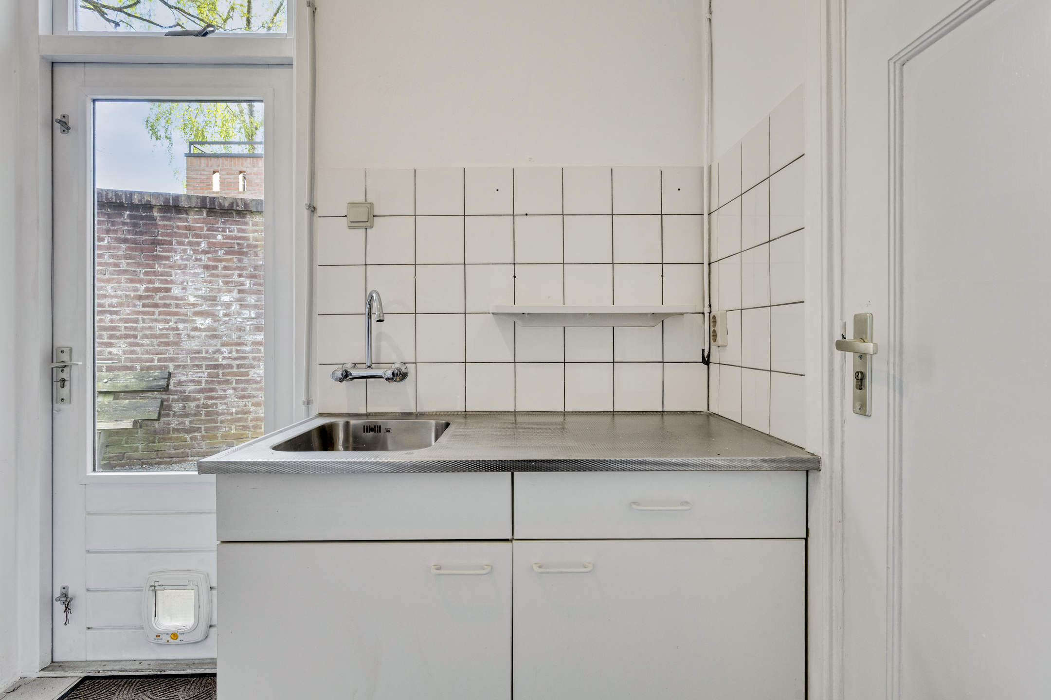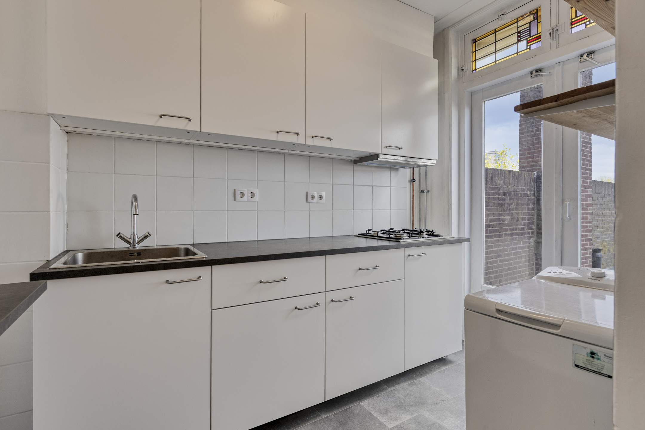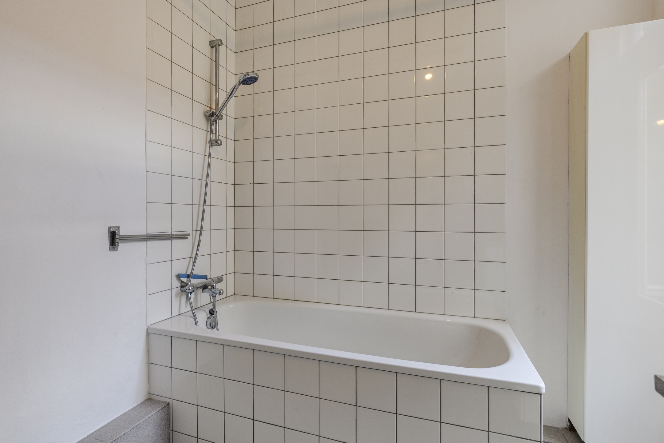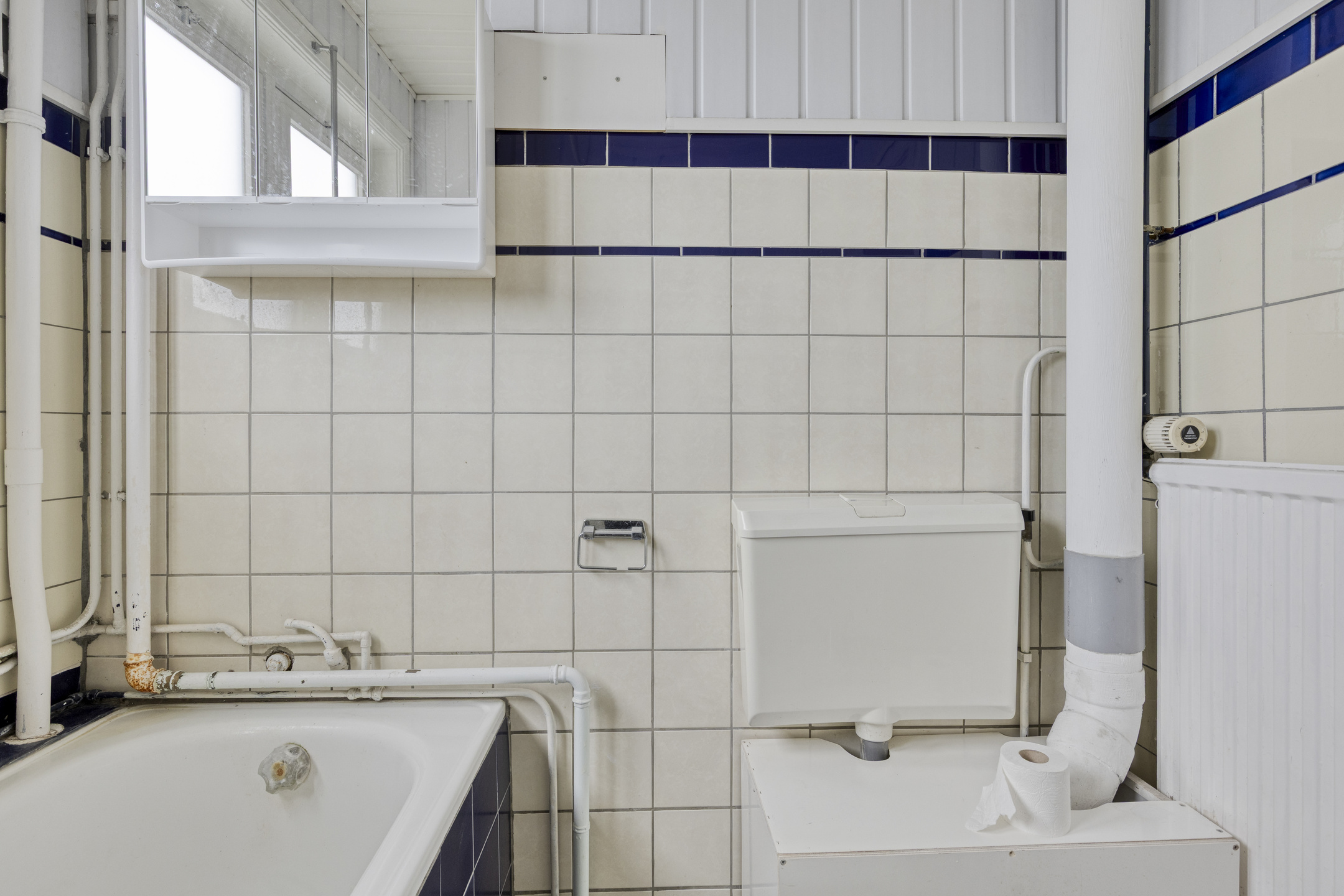 Op de begane grond bevindt zich ook een badkamer met ligbad/douchecombinatie en een compact keukenblokje. Vanuit deze ruimte stap je zo de achtertuin in. De tuin is overzichtelijk en praktisch ingericht, met een berging voor fietsen of extra opslag en een achterom die zorgt voor extra gemak in het dagelijks gebruik.