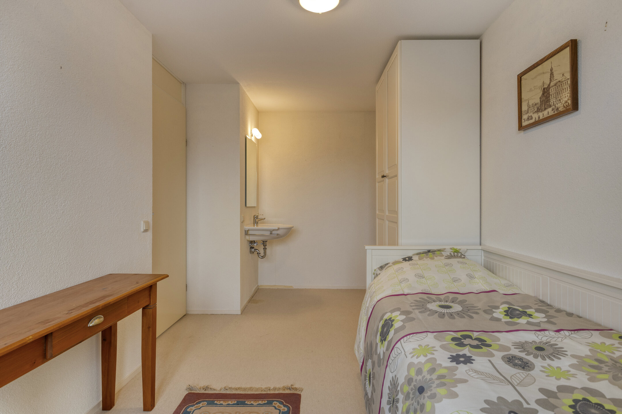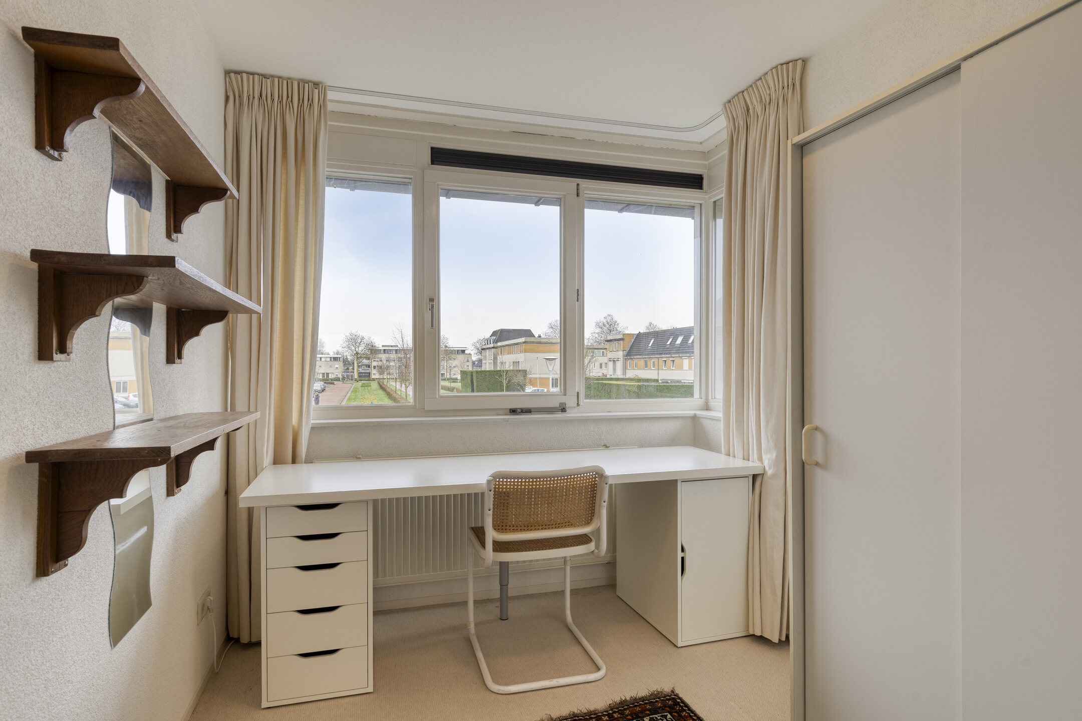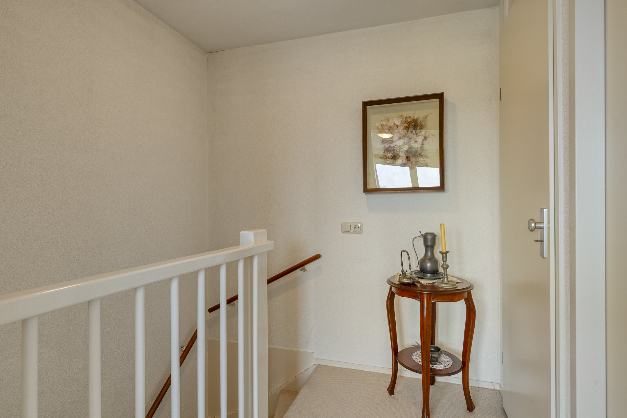 Via de open trap kom je op de overloop van de eerste verdieping. Hier bevinden zich in totaal twee slaapkamers. Eén slaapkamer beschikt over een vaste wastafel. De andere is in gebruik als hobby-/kantoorruimte. Beide kamers hebben prettige lichtinval en uitzicht op het groen in de wijk. De verdieping is voorzien van vloerbedekking en elektrische rolluiken.