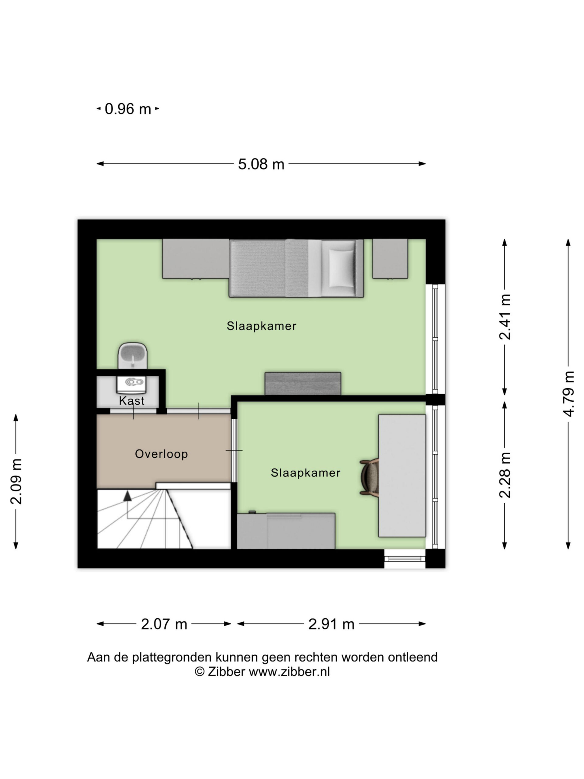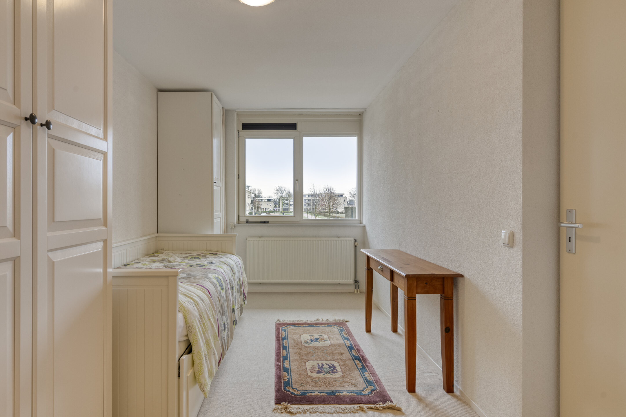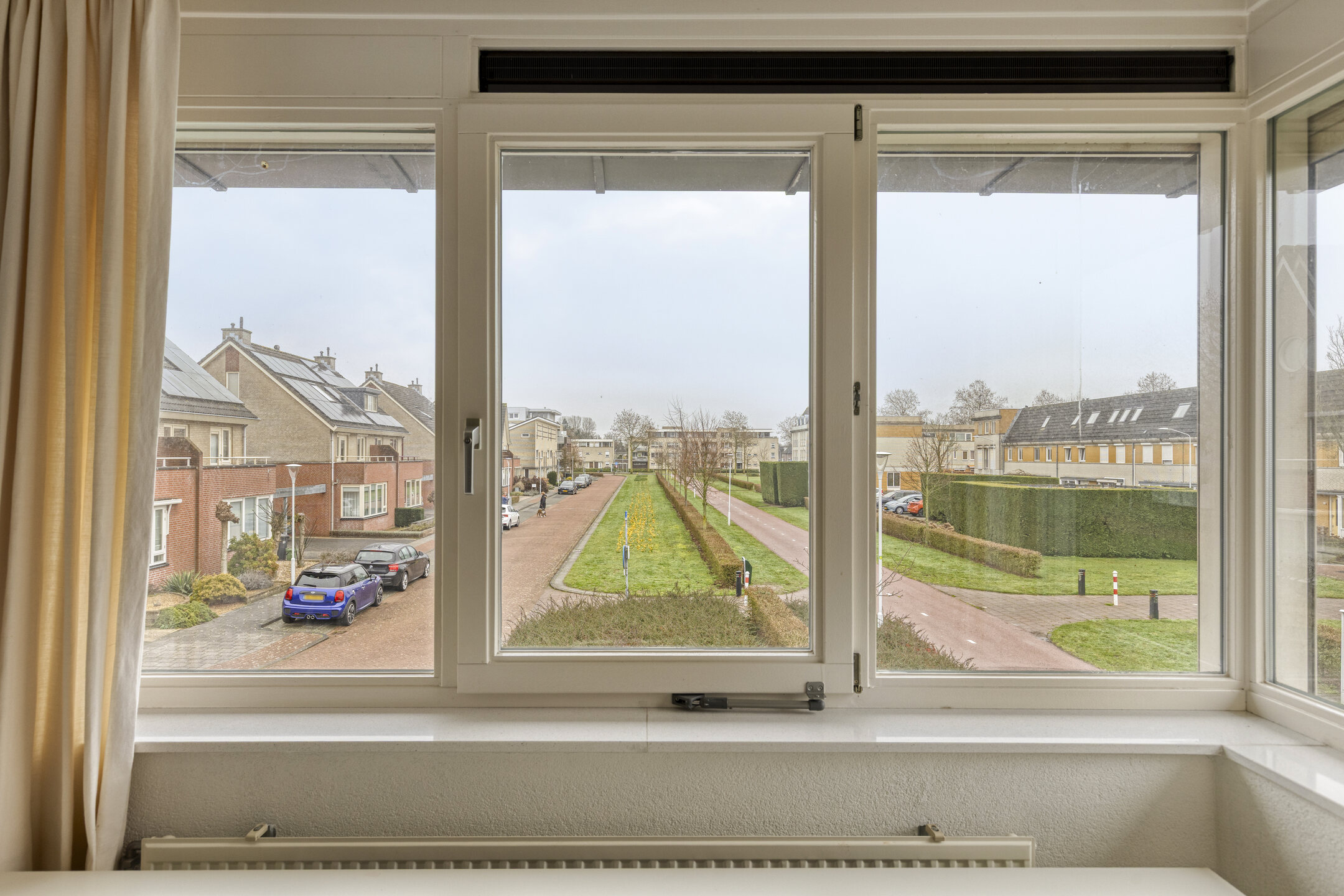 Via de open trap kom je op de overloop van de eerste verdieping. Hier bevinden zich in totaal twee slaapkamers. Eén slaapkamer beschikt over een vaste wastafel. De andere is in gebruik als hobby-/kantoorruimte. Beide kamers hebben prettige lichtinval en uitzicht op het groen in de wijk. De verdieping is voorzien van vloerbedekking en elektrische rolluiken.