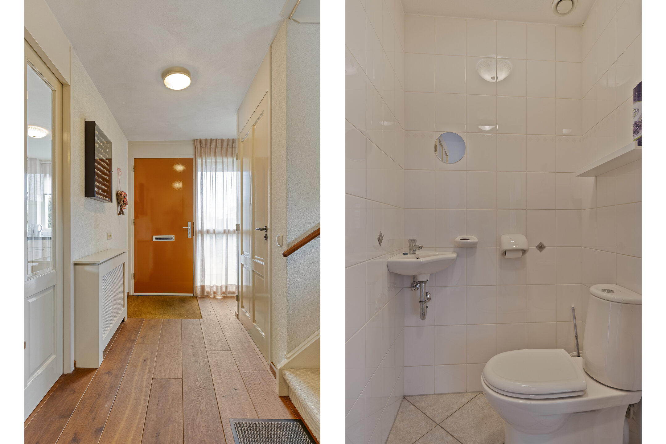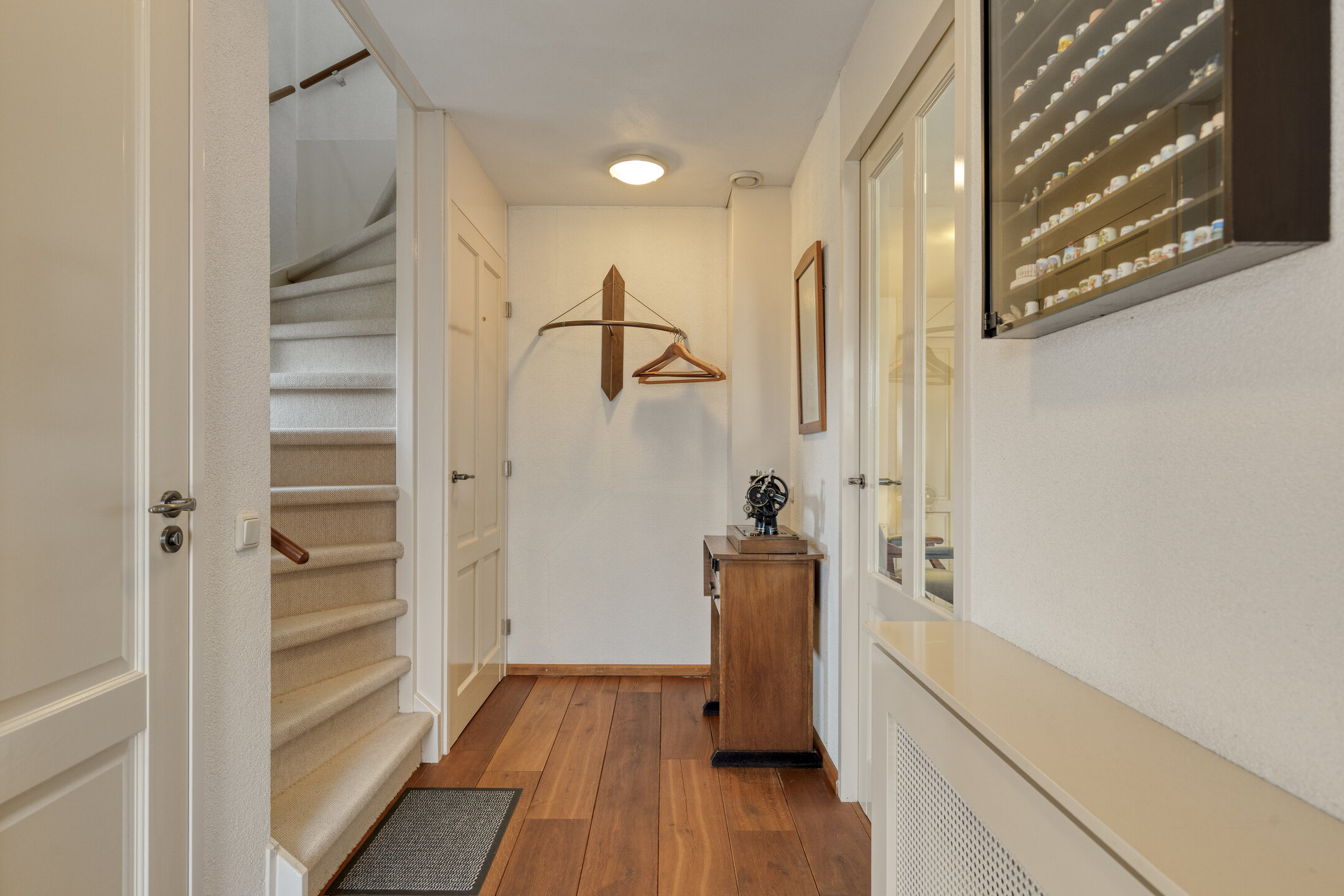Je komt binnen in de hal met de meterkast en toiletruimte aan de linkerzijde, een open trap leidt je naar de eerste verdieping. Onder de trap is een ruime trapkast met voldoende opbergruimte. Aan de rechterzijde van de hal bevindt zich de doorgang naar de woonkamer.