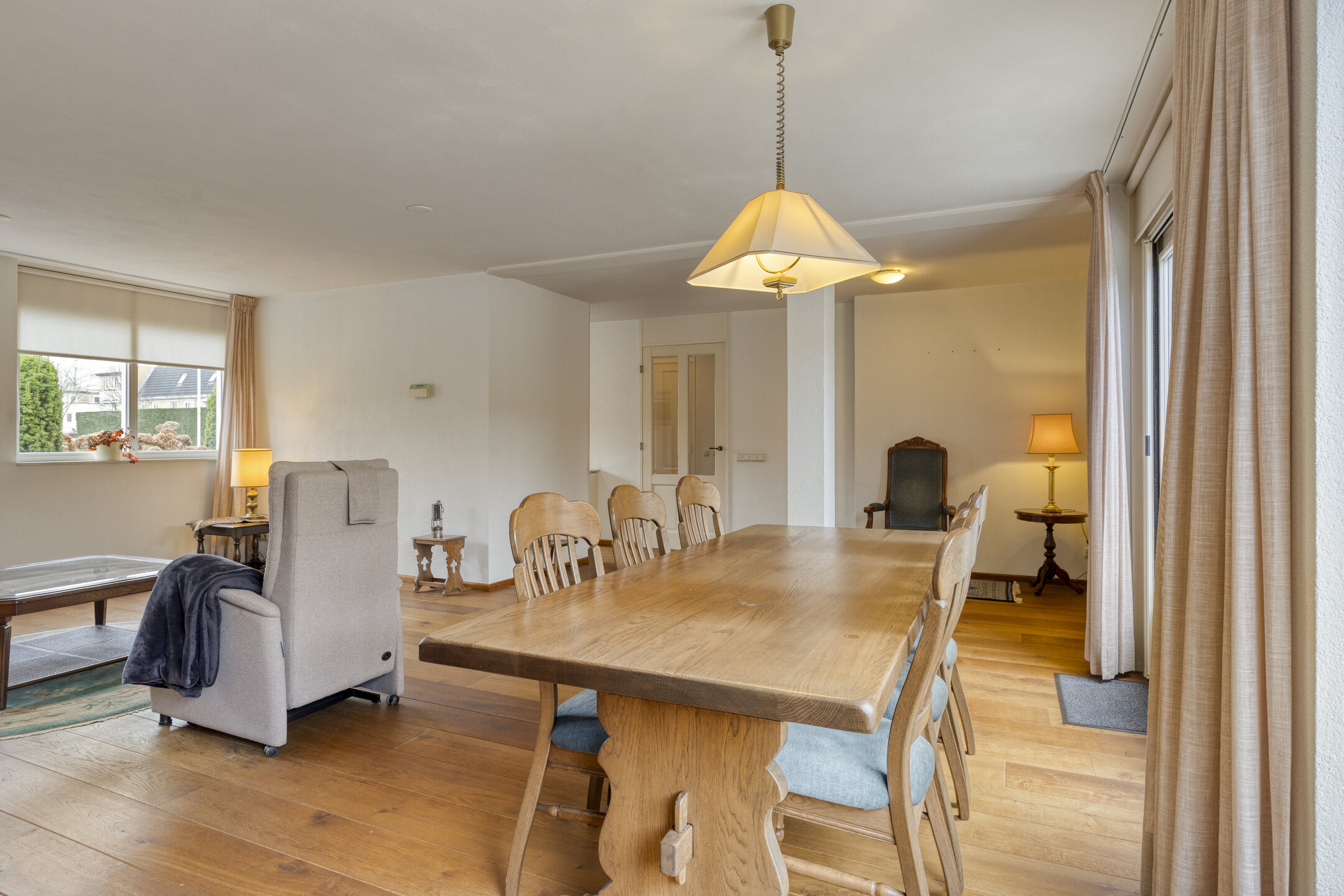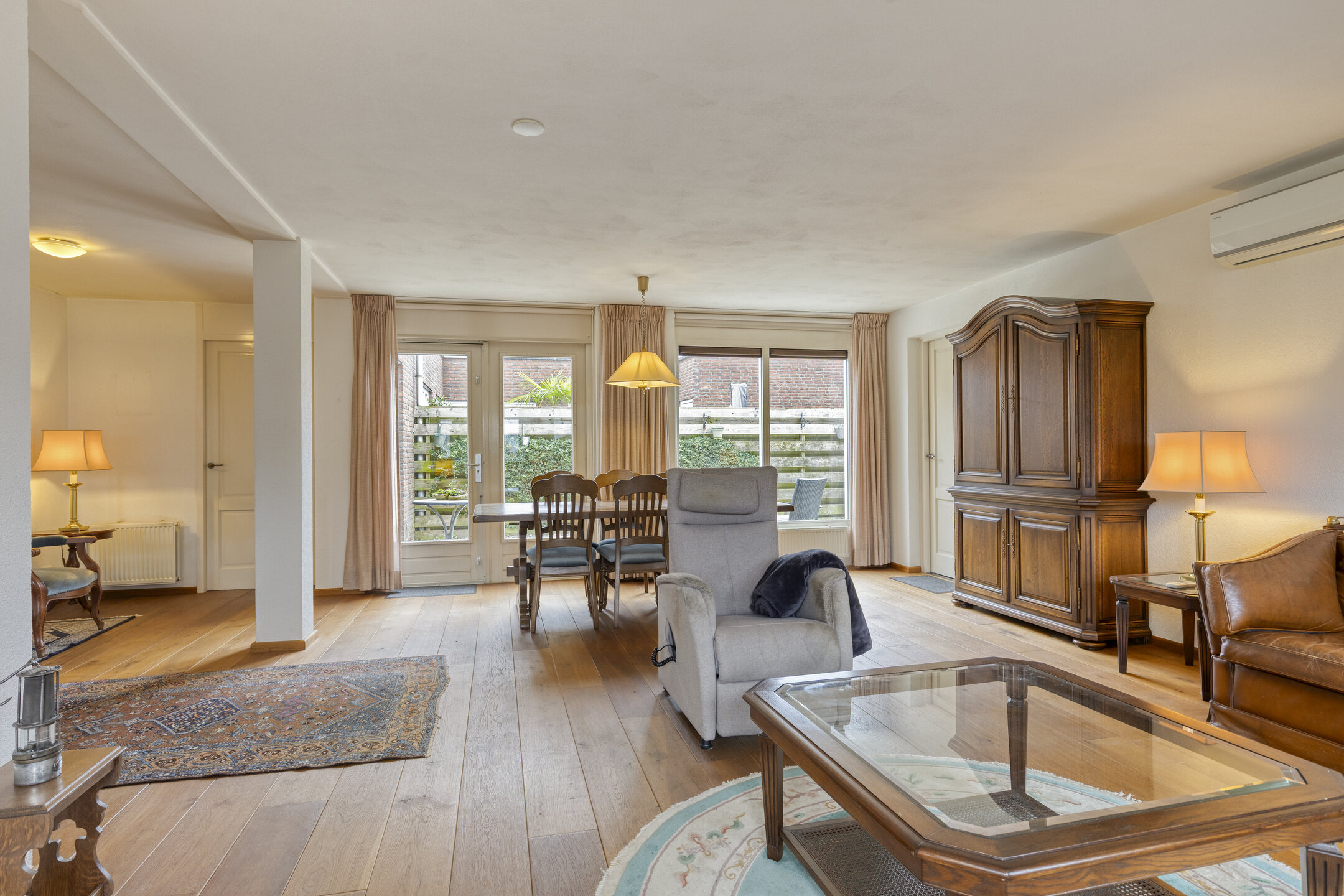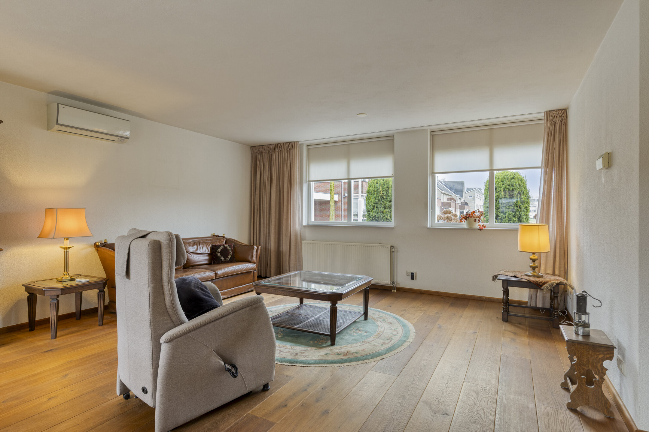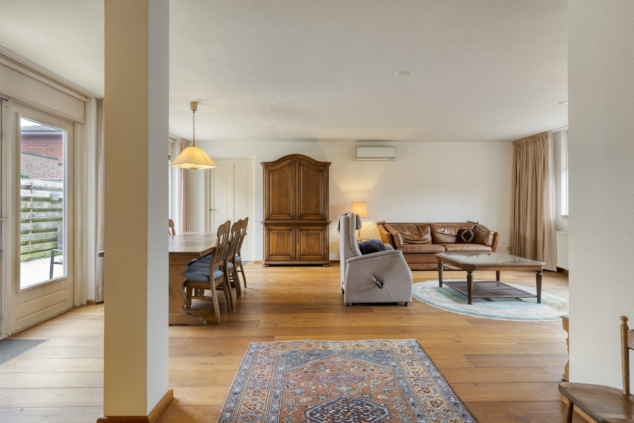 De woonkamer en het eetgedeelte vormen samen één open leefruimte met lichtinval aan beide zijden van de woning. Aan de voorzijde kijk je vrij de groene wijk in, wat zorgt voor een prettige en rustige sfeer. De eikenhouten vloer op de begane grond geeft volop sfeer. Vanaf de woonkamer is de patio aan de achterzijde bereikbaar. Deze ruimte is voorzien van airconditioning die zowel koelt als verwarmt.