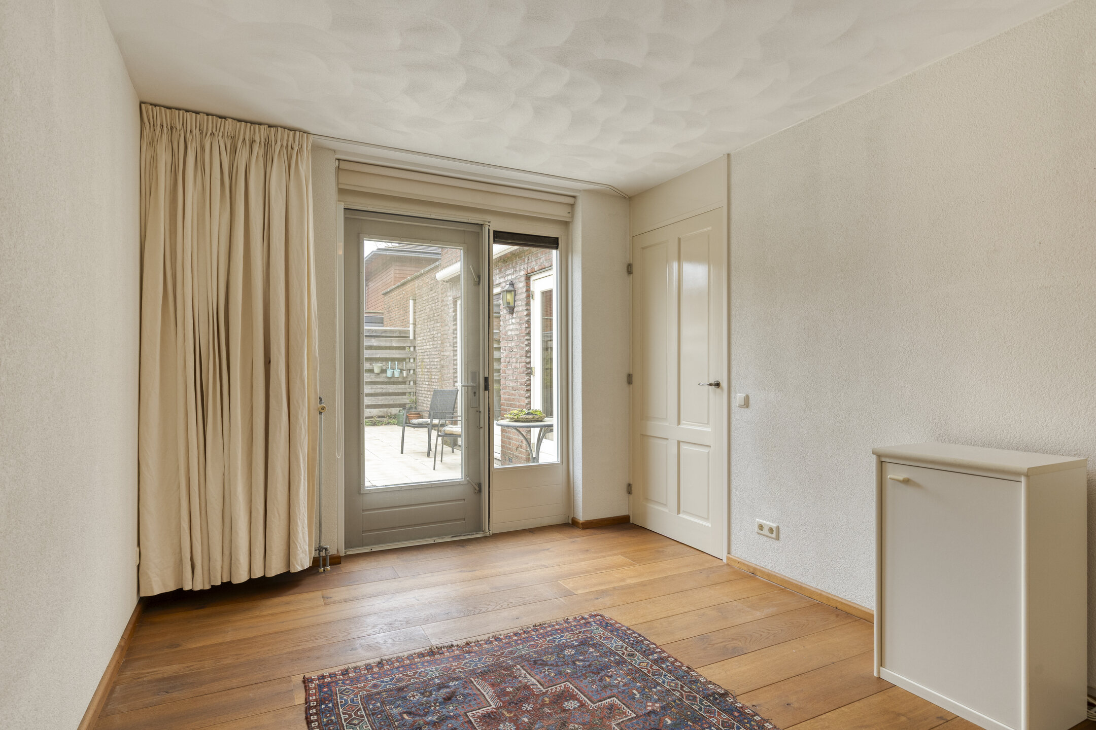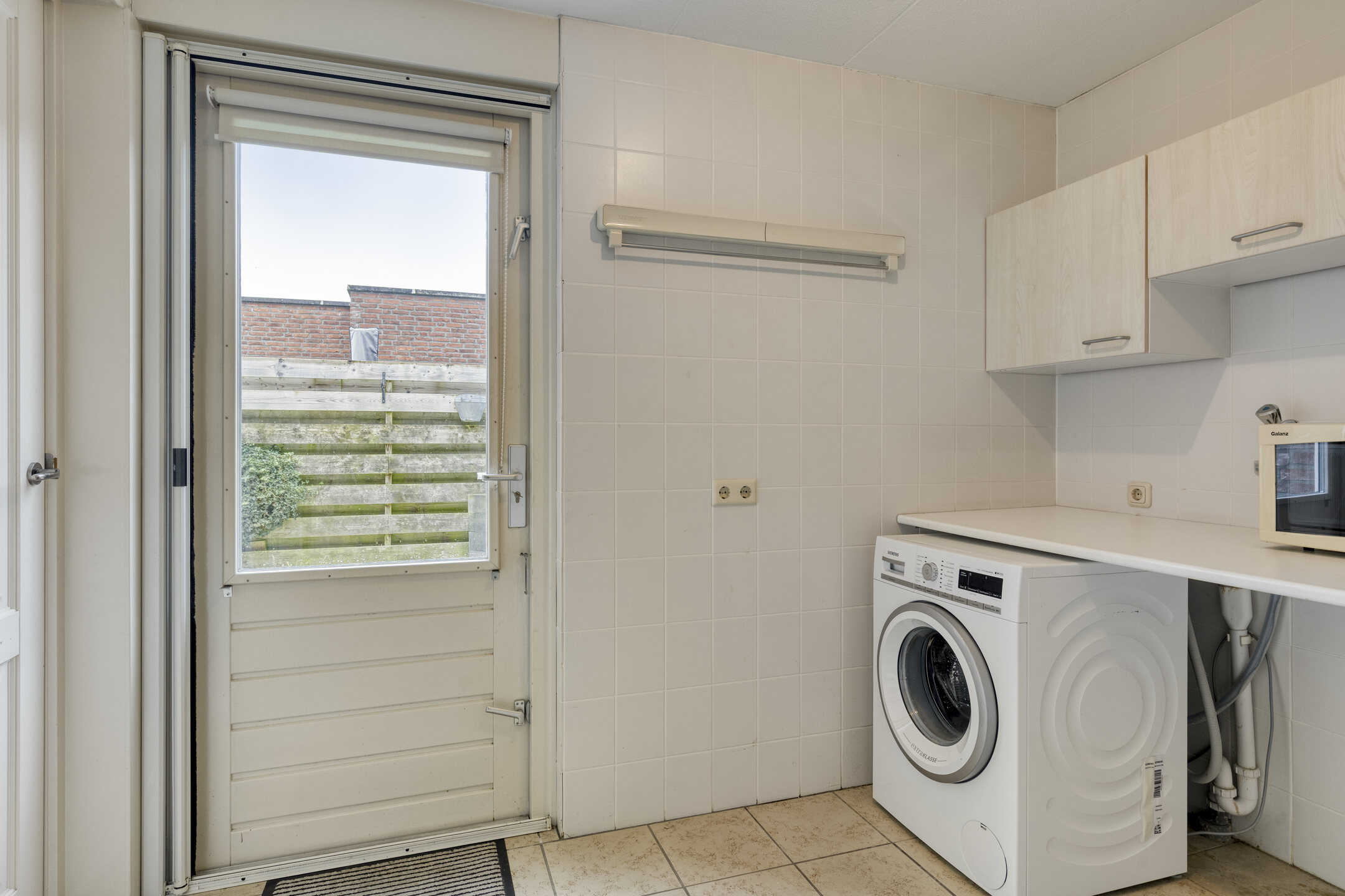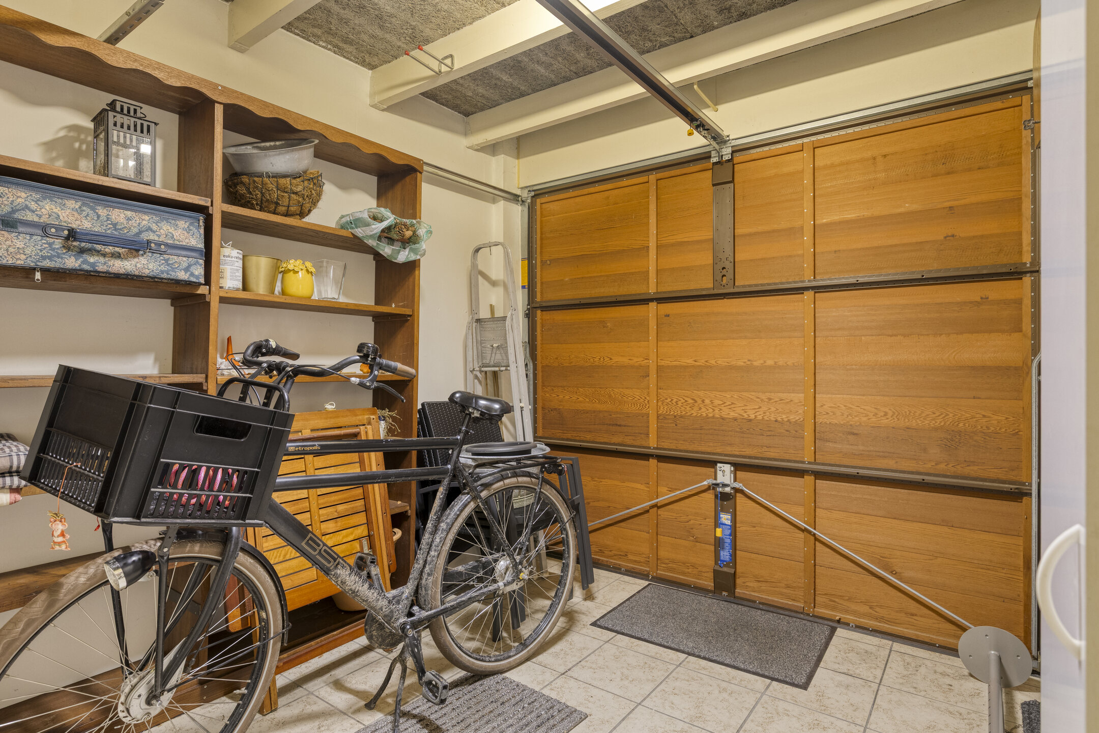 Aansluitend op de woonkamer ligt een praktische bijkeuken met aansluitingen voor wasmachine en droger en extra opslagruimte. Vanuit hier bereik je de aangebouwde garage, die ideaal is als berging of voor het stallen van fietsen. De oorspronkelijke grootte van de garage is eenvoudig te herstellen, door het verwijderen van de muur tussen de bijkeuken en de garage. De garage heeft een elektrische deur. Voor de garage is parkeergelegenheid op een eigen oprit.