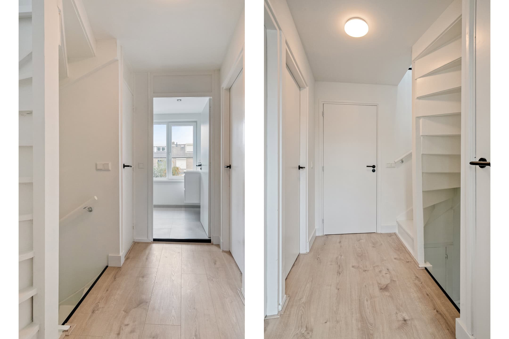 De hal biedt toegang tot de vernieuwde meterkast en een praktische trapkast voor extra bergruimte. De luxe toiletruimte is afgewerkt met moderne tegels en voorzien van een wandcloset en fonteintje.