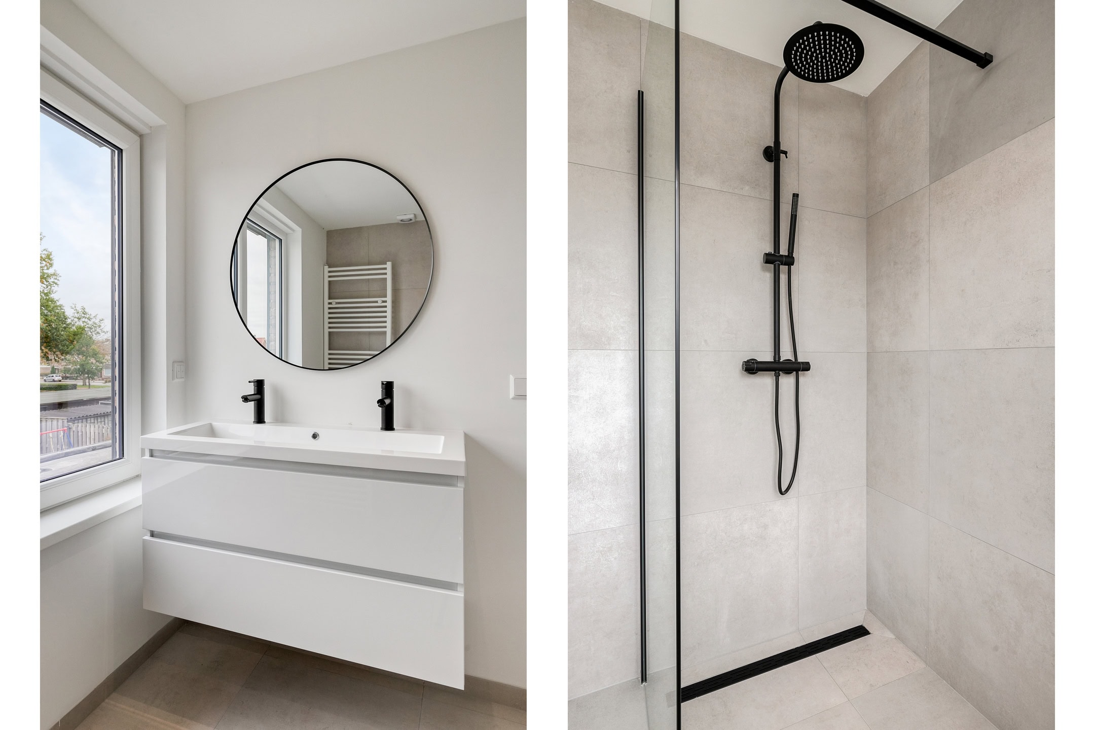 De luxe badkamer is stijlvol betegeld en voorzien van een ruime inloopdouche, designradiator en een wastafelmeubel met dubbele wastafel en bijpassende spiegel. De afwerking en indeling zorgen voor een frisse, rustige uitstraling.