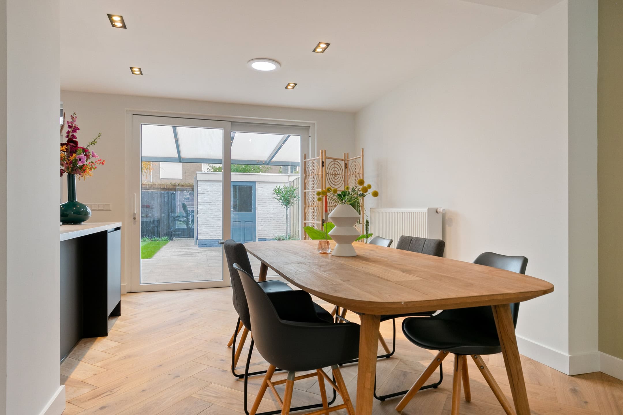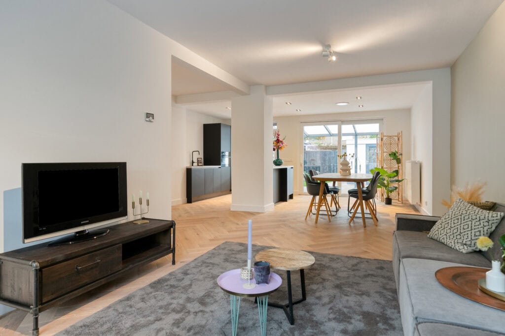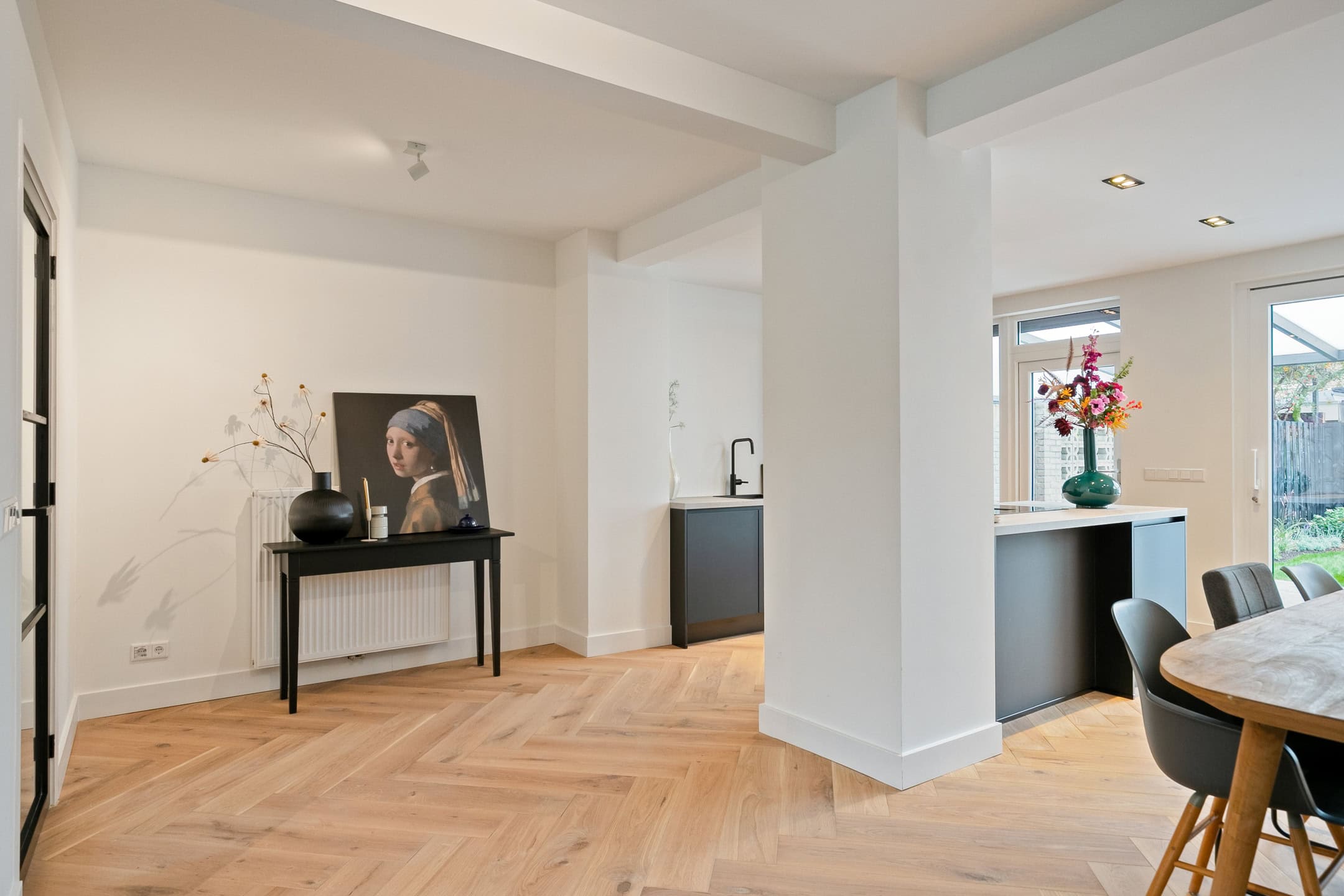 Bij binnenkomst valt direct de fijne sfeer op. De visgraatvloer van lamelparket loopt drempelloos door over de gehele begane grond en zorgt voor een warme uitstraling. De uitgebouwde woonkamer biedt volop ruimte voor een royale zithoek en een grote eettafel. Grote ramen en twee Solatubes zorgen voor veel daglicht. Via de schuifpui en de aparte loopdeur is het overdekte terras bereikbaar – ideaal om binnen en buiten met elkaar te verbinden.