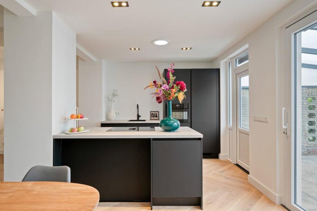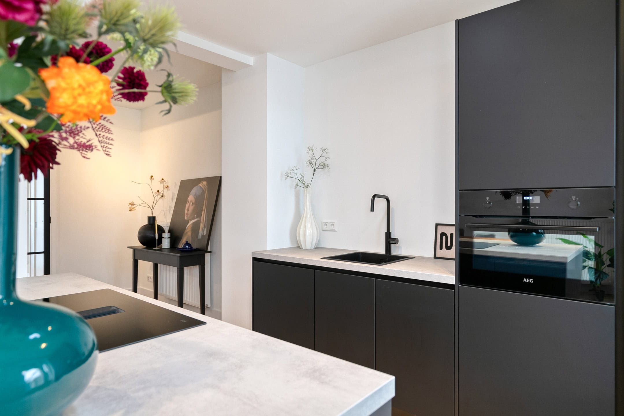 De luxe open keuken is een echte blikvanger. Het kookeiland vormt het hart van de ruimte en is voorzien van een moderne inductiekookplaat met geïntegreerde afzuiging. Verder beschikt de keuken over een koel-vriescombinatie, combi-oven/magnetron en vaatwasser. De afwerking is strak en eigentijds, met voldoende werk- en kastruimte. Hier is koken een plezier en samenzijn vanzelfsprekend.