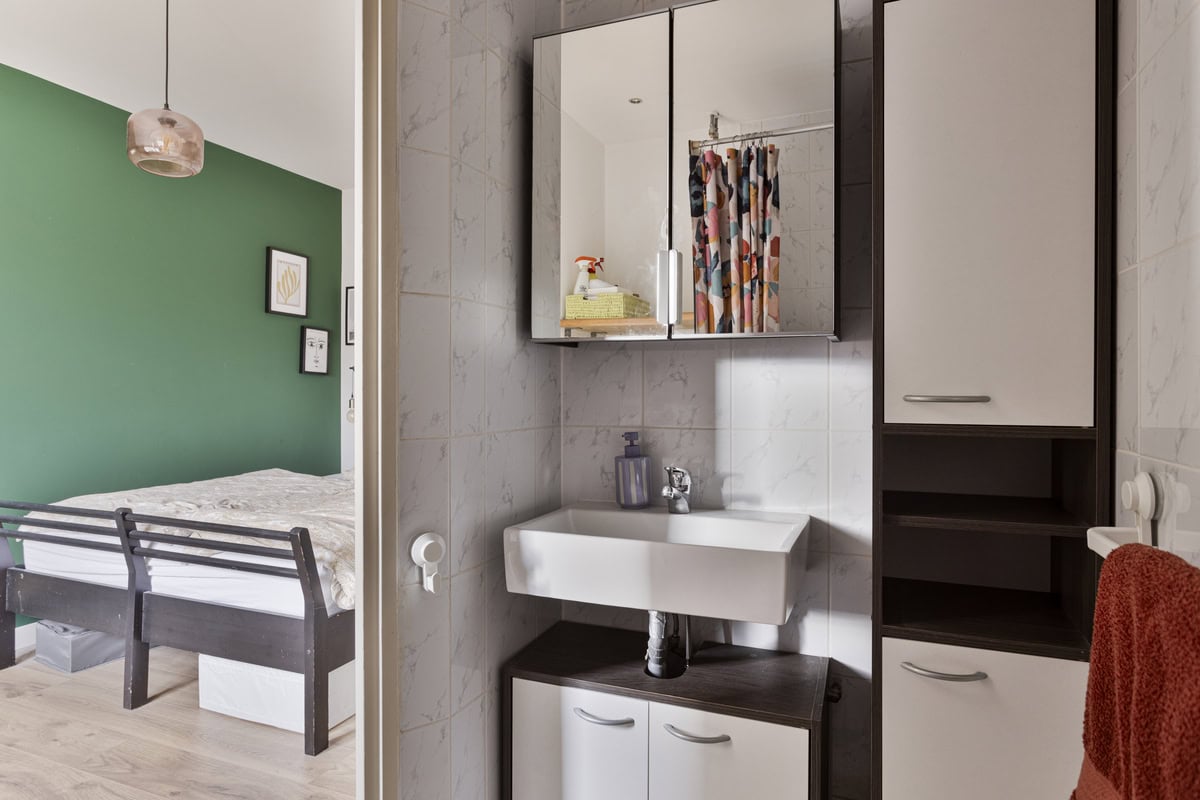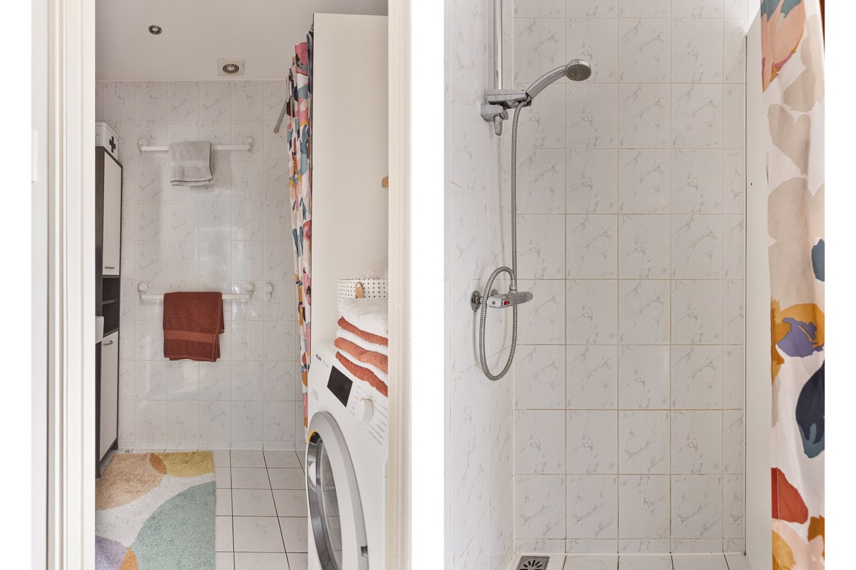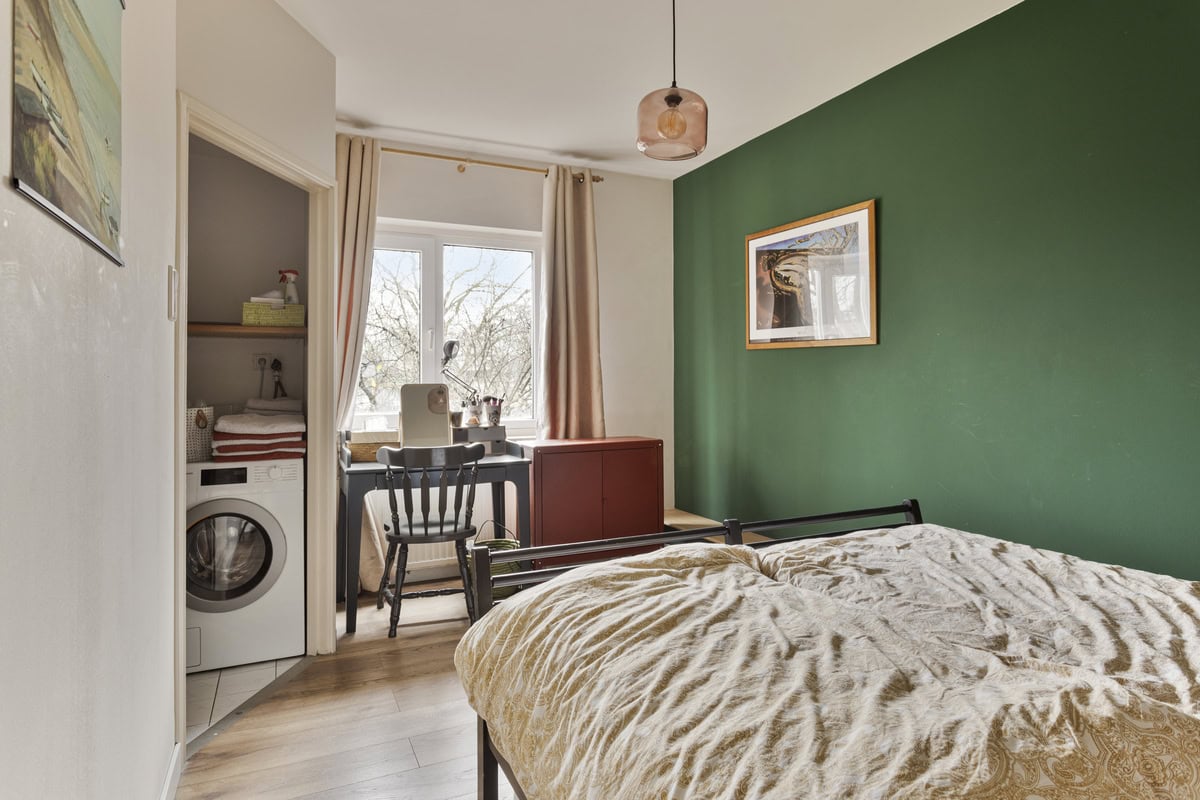 De eerste kamer kan dienen als kledingkamer, bergruimte of tweede slaapkamer. De tweede slaapkamer is iets groter en geschikt als hoofdslaapkamer. Vanuit deze kamer heeft u toegang tot de badkamer, die voorzien is van een tegelvloer, douche, wastafel met meubel en kast, en een aansluiting voor de wasmachine.