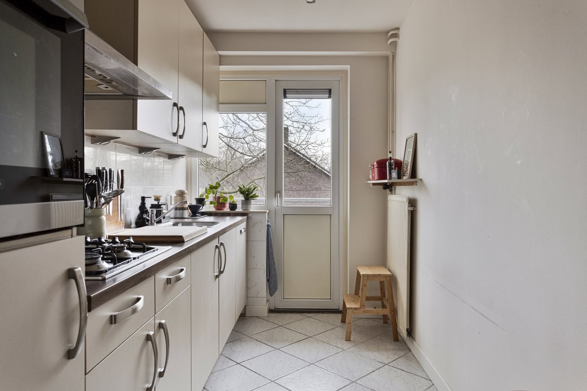 De gesloten betegelde keuken is opgesteld met een wandopstelling, voorzien van boven- en onderkasten. De keuken is uitgerust met een gasfornuis, oven, koelkast en vaatwasser. Vanuit de keuken heeft u toegang tot het balkon aan de achterzijde van de woning.