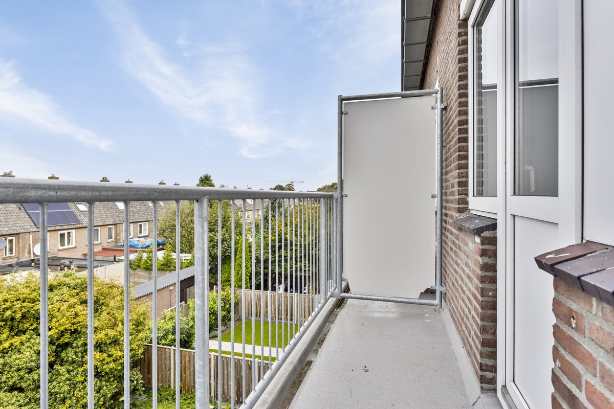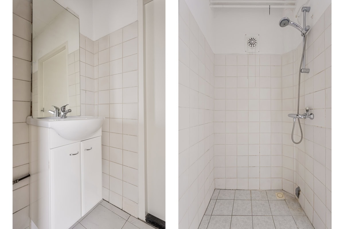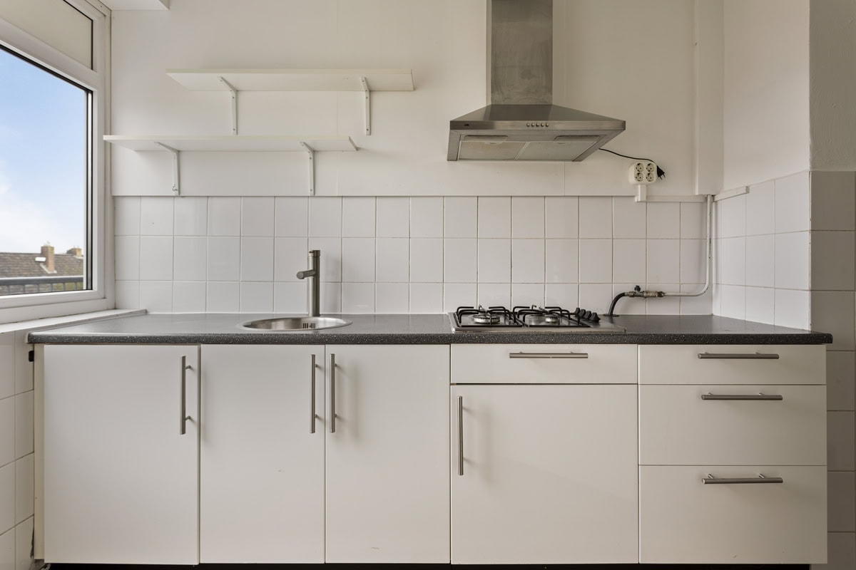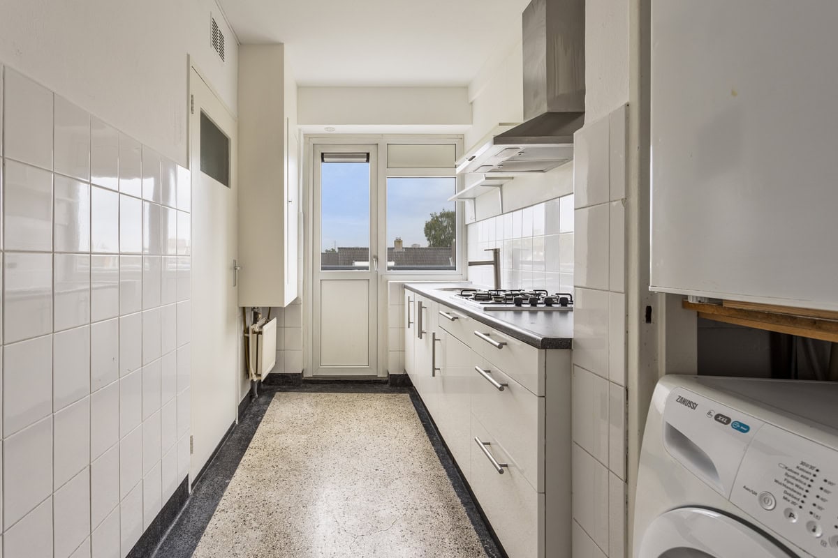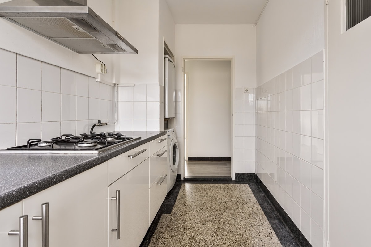 De gesloten keuken beschikt over een nette wandopstelling met een gaskookplaat, afzuigkap, en ruimte voor een losstaande koelkast en wasmachine. In de CV-kast bevindt zich een zuinige Intergas HR-combiketel (2013). De eerste slaapkamer, gelegen aan de achterzijde, heeft toegang tot het tweede balkon. De tweede slaapkamer biedt toegang tot de eenvoudige badkamer met douche en wastafelmeubel. Deze badkamer is tevens vanuit de keuken bereikbaar.
