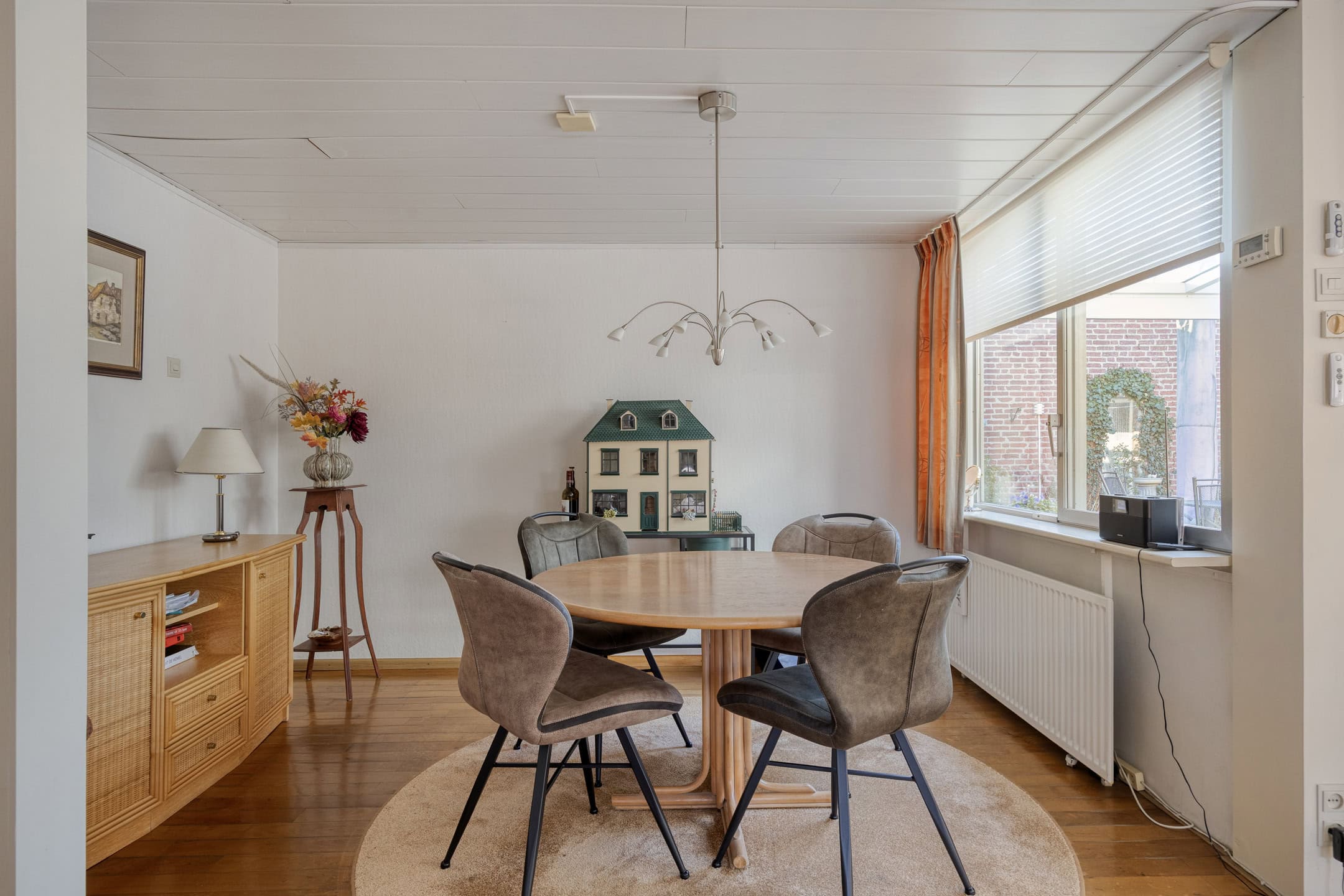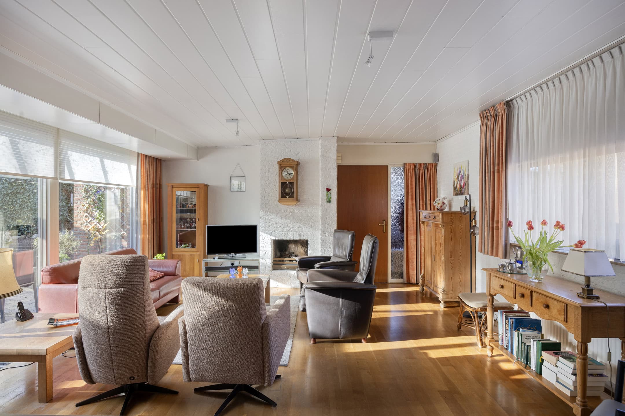 De woonkamer vormt het warme hart van de woning en voelt direct ruim en licht aan. Grote raampartijen bieden een mooi zicht op de patio en zorgen voor een prettige, natuurlijke lichtinval. De praktische indeling biedt volop ruimte voor een royale zithoek, waarbij de open haard bijdraagt aan een gezellige en huiselijke sfeer. Via de schuifpui staat de woonkamer in directe verbinding met de patio, waardoor binnen en buiten op een natuurlijke manier in elkaar overlopen. Aansluitend is er een fijne eethoek met voldoende ruimte voor een grote eettafel.