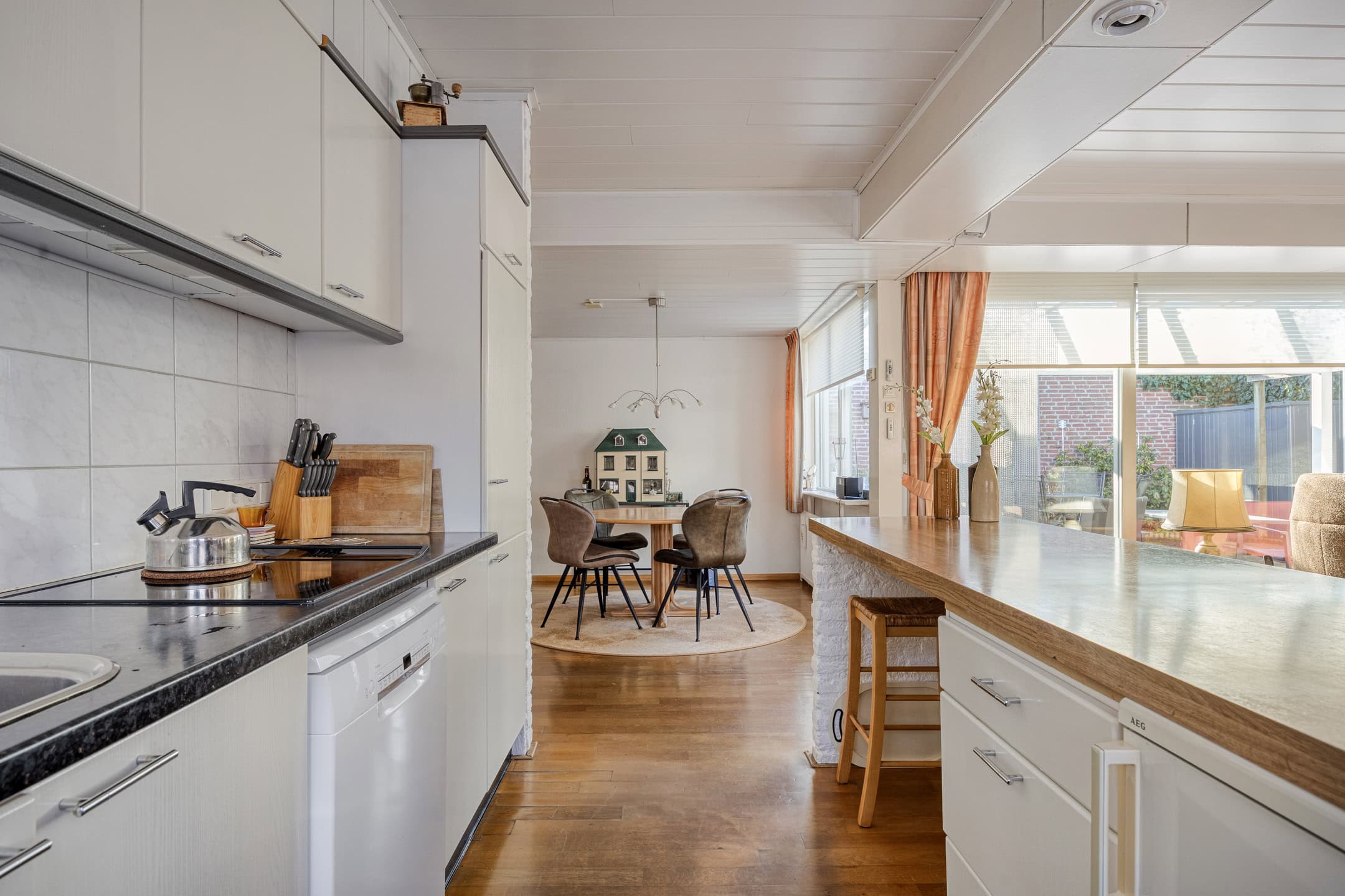 De keuken staat in open verbinding met zowel de woonkamer als de eethoek, wat zorgt voor een open en sociale leefruimte. De opstelling is functioneel en biedt voldoende werk- en bergruimte. Dankzij de zijramen komt ook hier veel daglicht binnen, wat de keuken tot een prettige plek maakt om te koken. De keuken is verzorgd, maar biedt mogelijkheden voor modernisering en aanpassing aan hedendaagse woonwensen.