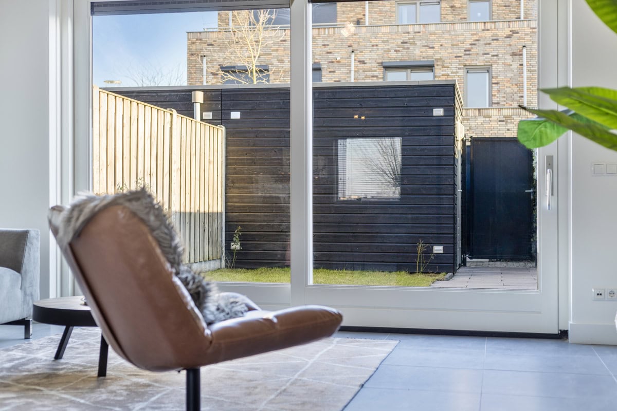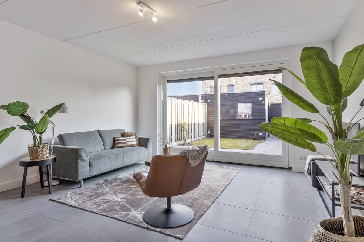 De uitgebouwde woonkamer heeft grote raampartijen die zorgen voor veel natuurlijk licht. De ruimte is afgewerkt met een strakke tegelvloer met vloerverwarming. De woonkamer is praktisch ingedeeld en biedt voldoende ruimte voor een comfortabele zithoek en eethoek. Via de grote schuifdeuren aan de achterzijde is de tuin bereikbaar.