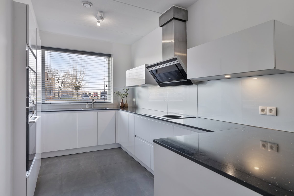 De moderne, open keuken in U-opstelling is voorzien van diverse hoogwaardige inbouwapparatuur, waaronder een koelkast, inductiekookplaat, inbouwoven, magnetron en een vaatwasser. De inbouwspots zorgen voor prettige verlichting en het werkblad biedt voldoende ruimte om comfortabel te koken. Een gezellig barretje zorgt voor de finishing touch.