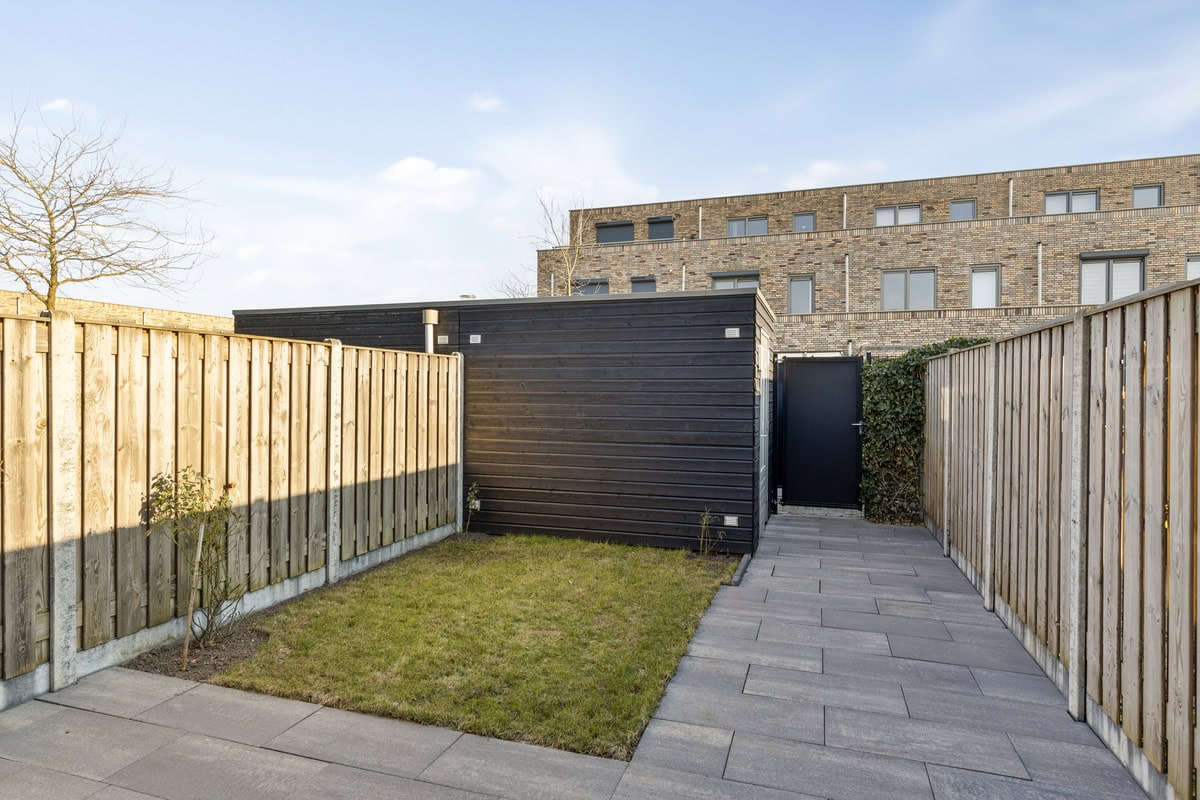 De achtertuin is is netjes onderhouden en beschikt over een grasveldje, siertegels en een achterom. De vrijstaande houten berging is voorzien van elektra en biedt ruimte voor de opslag van fietsen en het tuingereedschap.