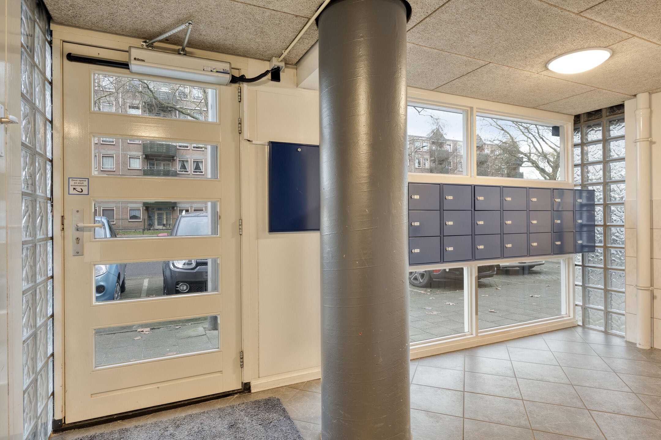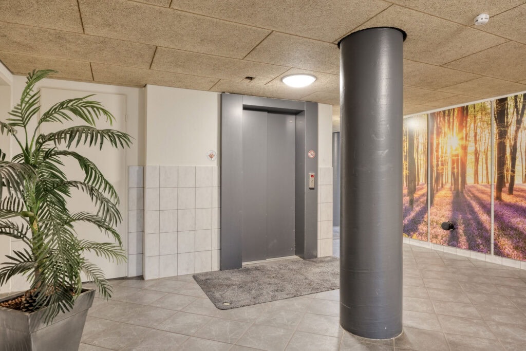 Bij binnenkomst via de centrale entree op de begane grond treft u de brievenbussen, intercominstallatie, toegang tot het trappenhuis, de lift en de individuele bergingen.