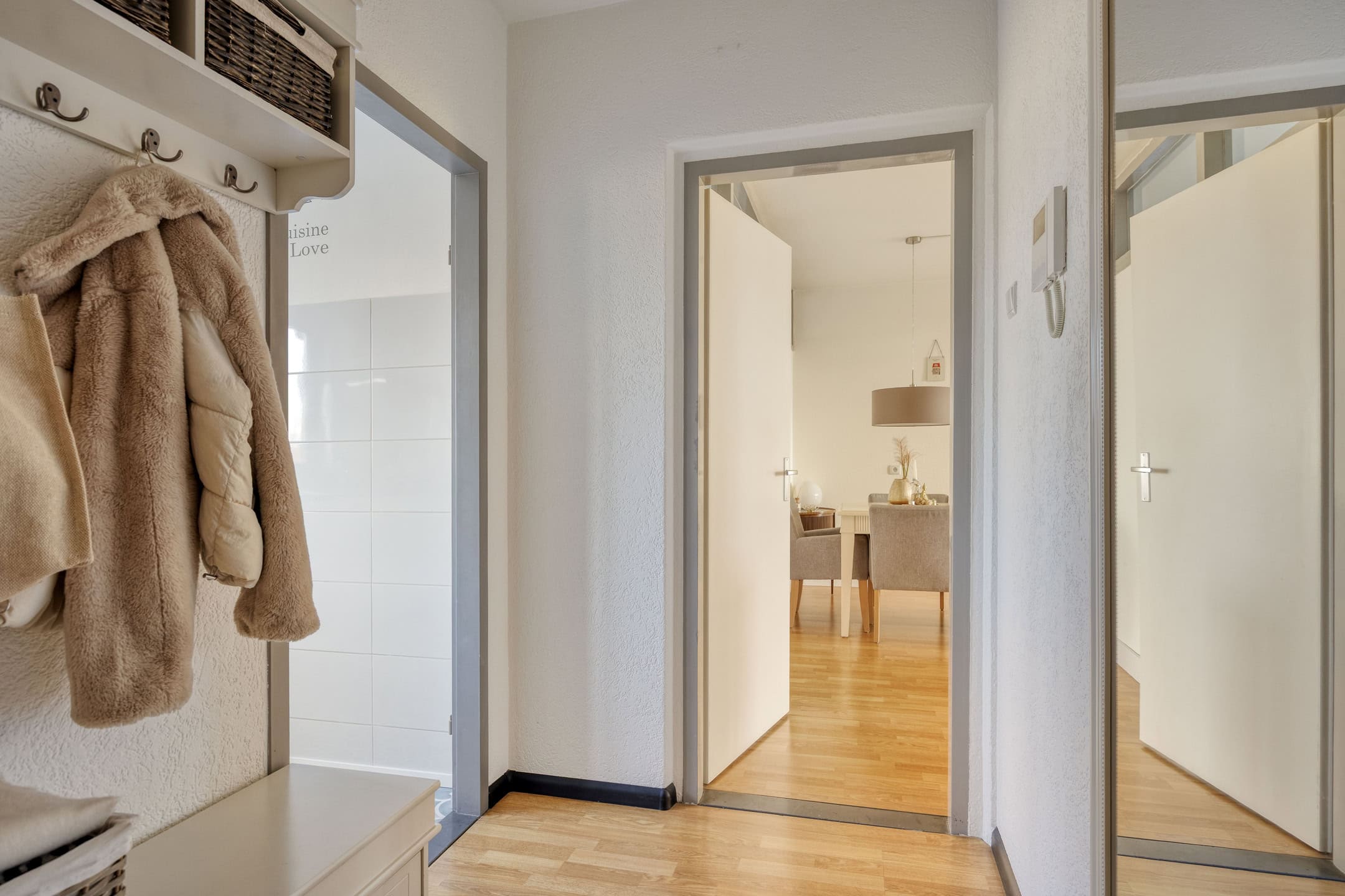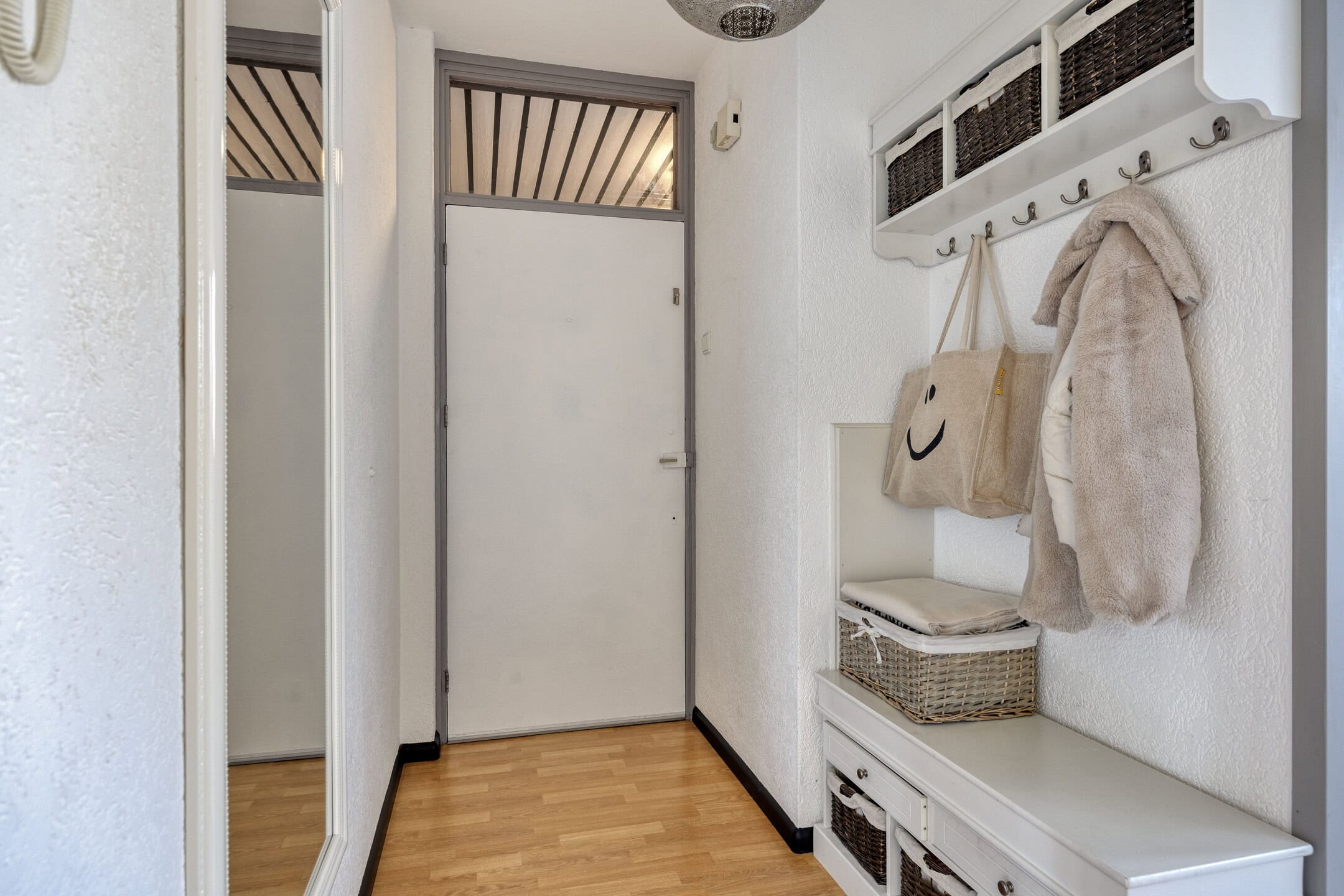Je komt binnen in de ruime hal, waar er toegang is tot de keuken en de woonkamer.