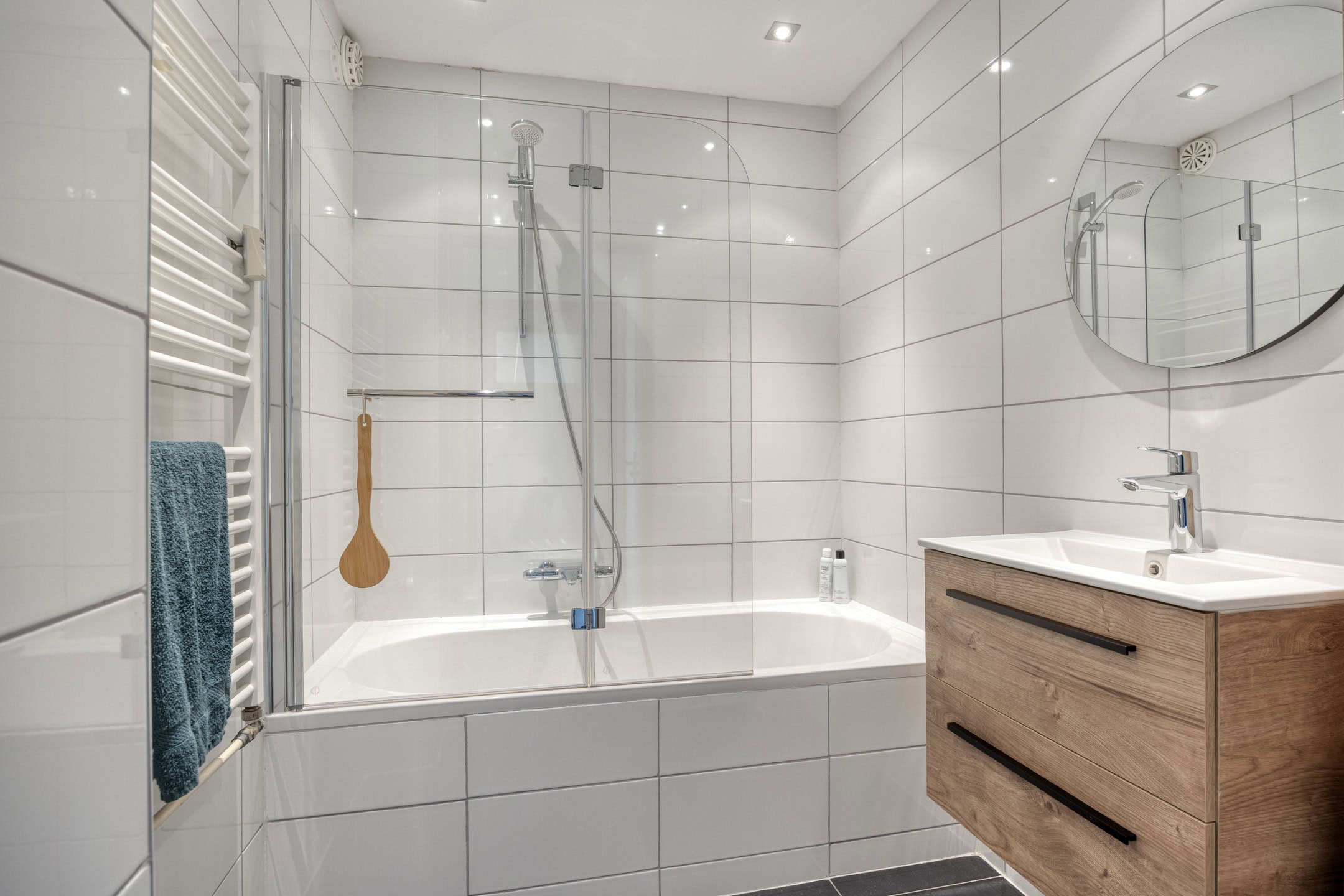De badkamer is modern ingericht en voorzien van een tegelvloer, ligbad met douche, een wastafel met ladekast, een extra losse kast en een radiator. De ruimte is praktisch en onderhoudsvriendelijk afgewerkt.