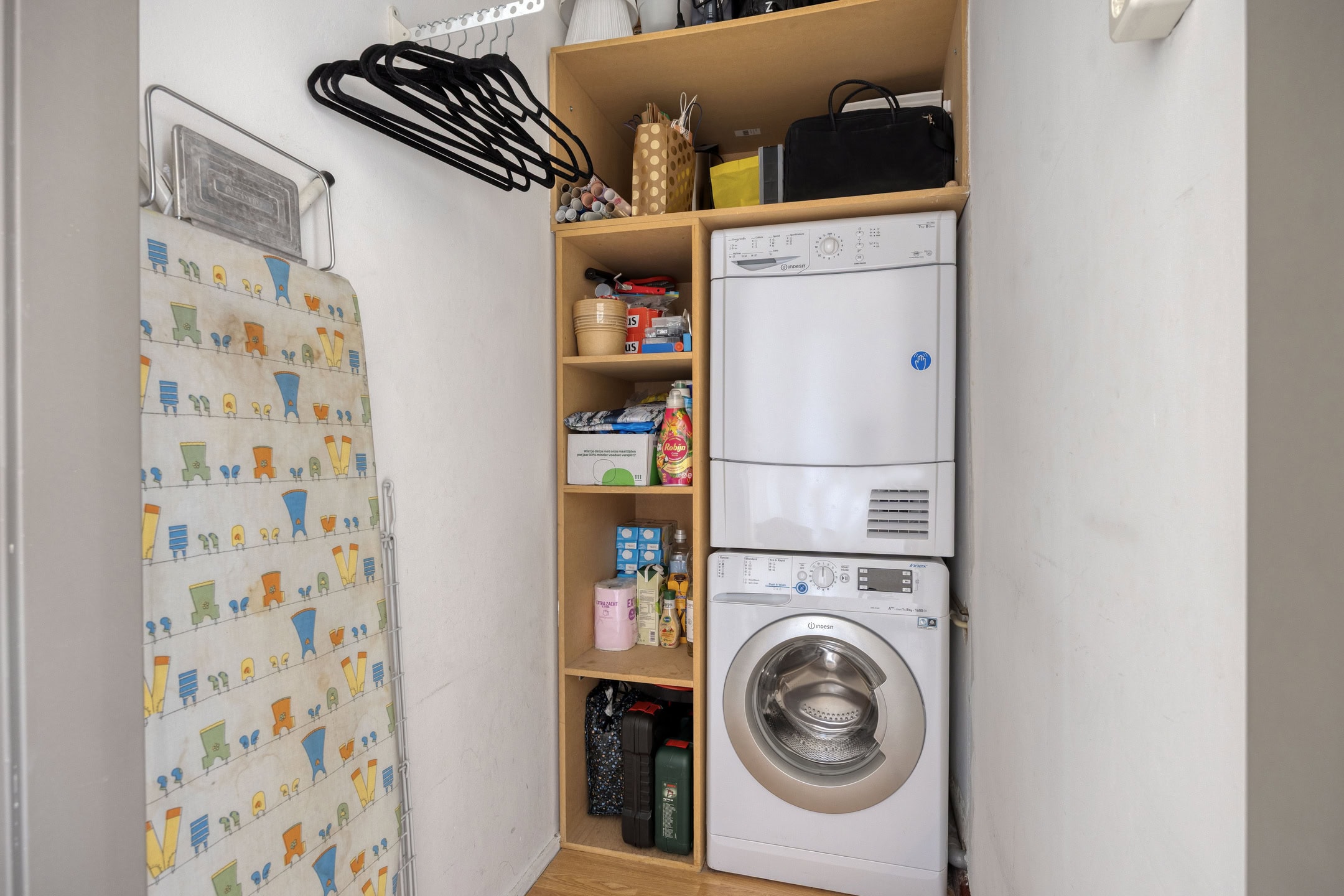 Een aparte wasruimte biedt plaats aan de wasmachine en droger, wat zorgt voor extra gemak en rust in de overige vertrekken.