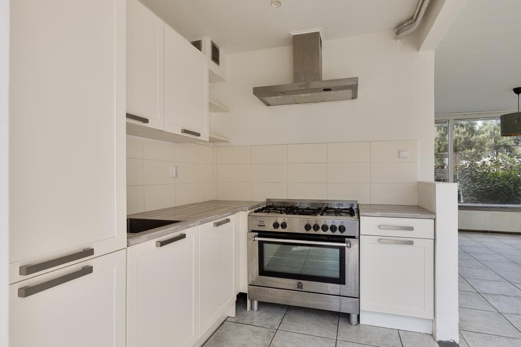 De open keuken (2018) is gelegen aan de achterzijde en opgesteld in een hoekopstelling met diverse boven- en onderkasten en een kunststof werkblad. De volgende apparatuur is aanwezig: koelkast, vriezer, vaatwasser, afzuigkap, 5-pits gasfornuis met oven. Vanuit de keuken is er toegang tot de achtertuin.