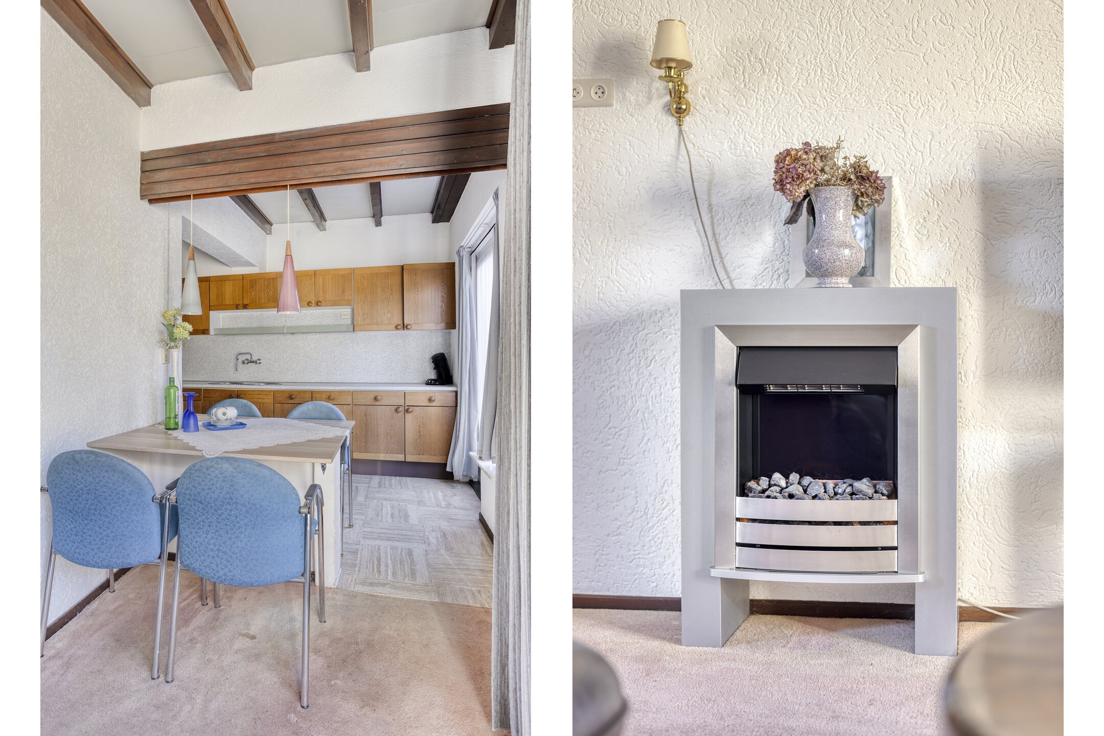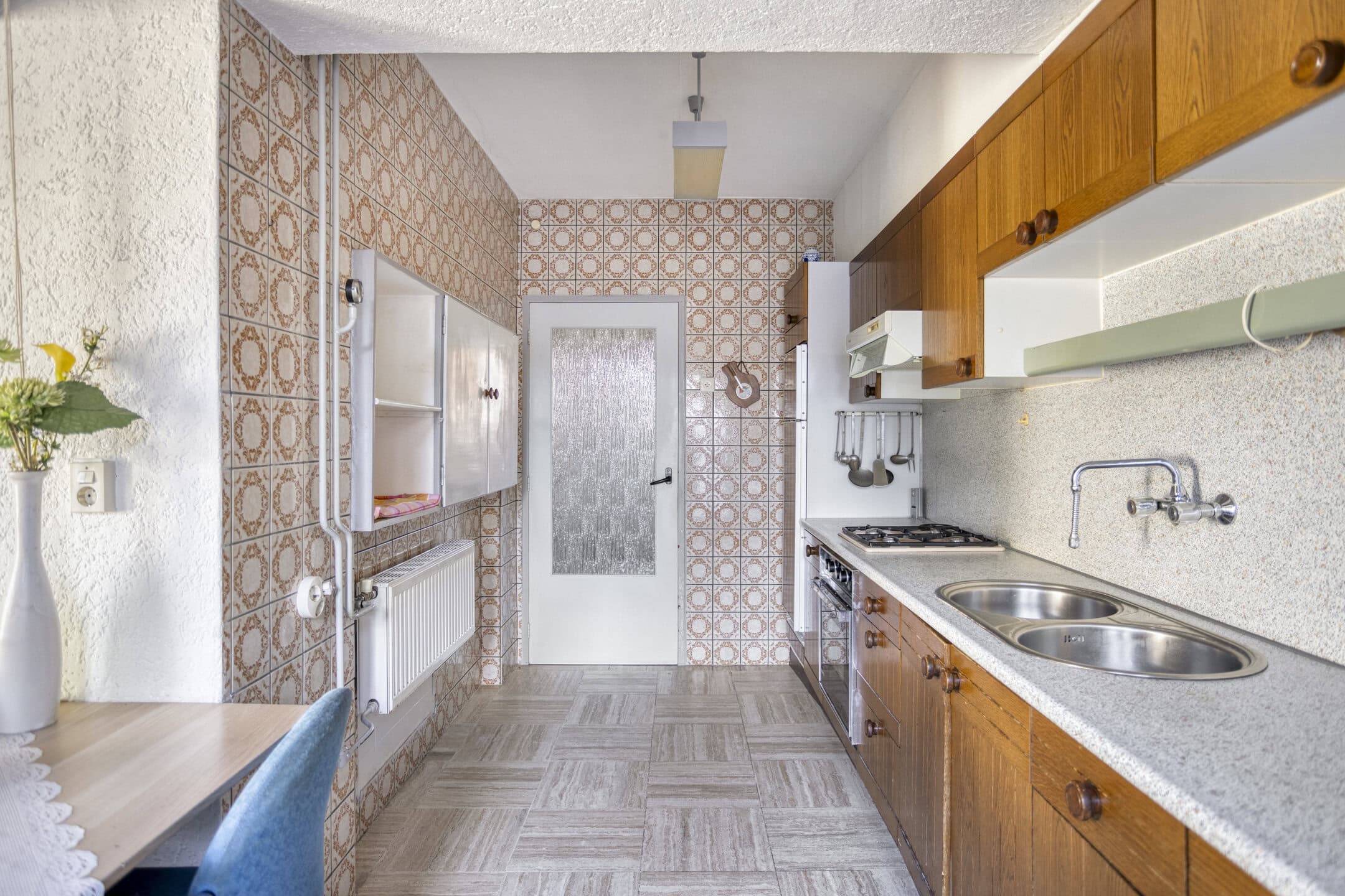 De halfopen keuken is functioneel ingedeeld en voorzien van een wandopstelling met kunststof werkblad, dubbele rvs-spoelbak, gaskookplaat, afzuigkap, koelkast en elektrische oven. Hoewel eenvoudig van uitvoering, vormt dit een goede basis om geheel naar eigen wens te moderniseren.