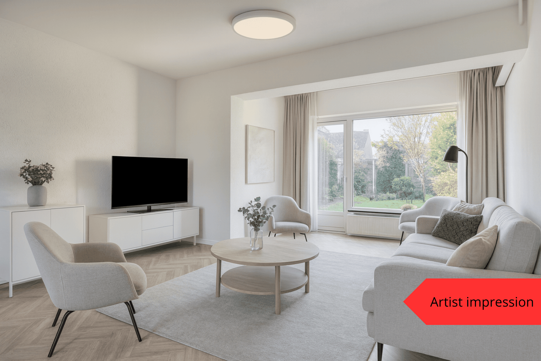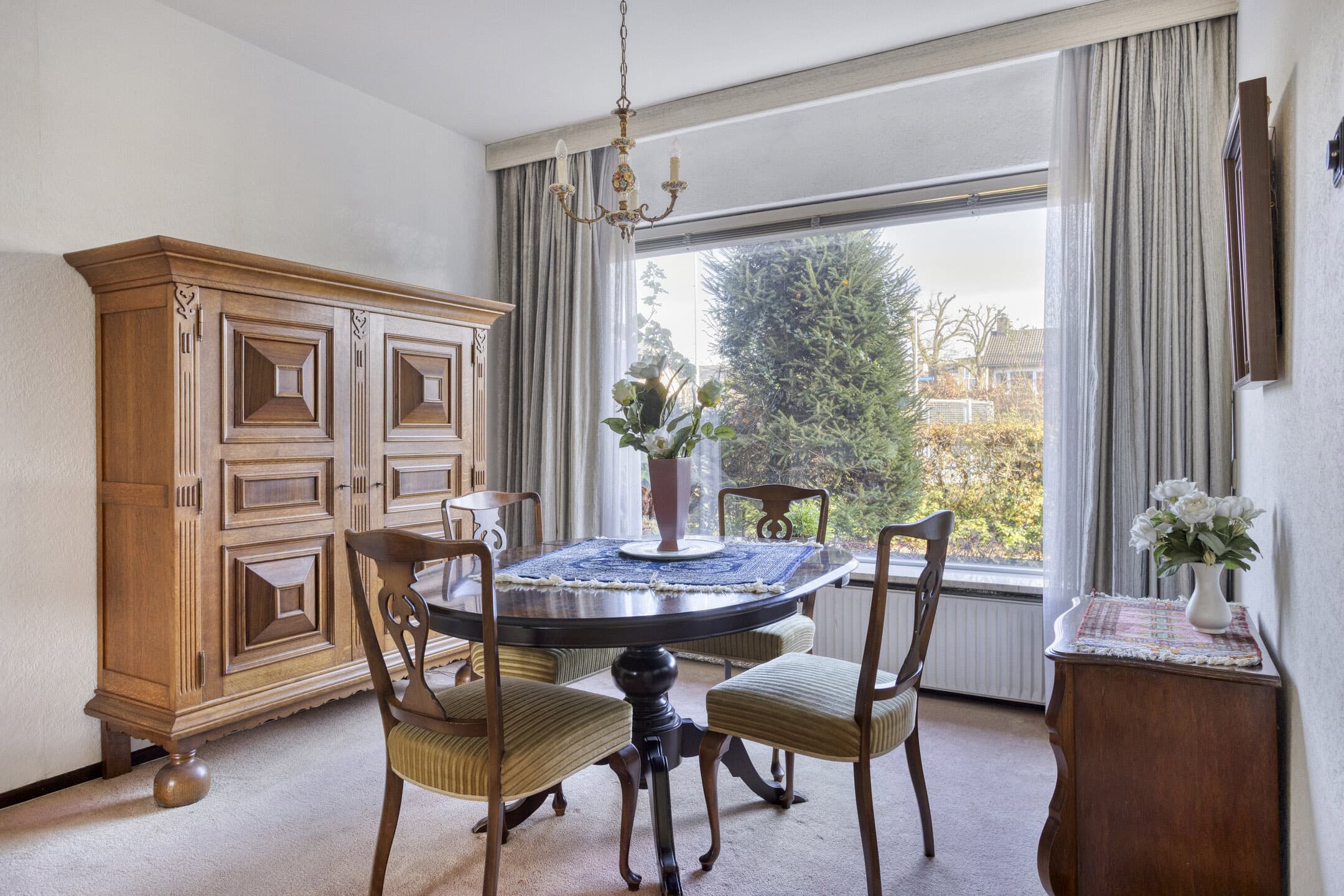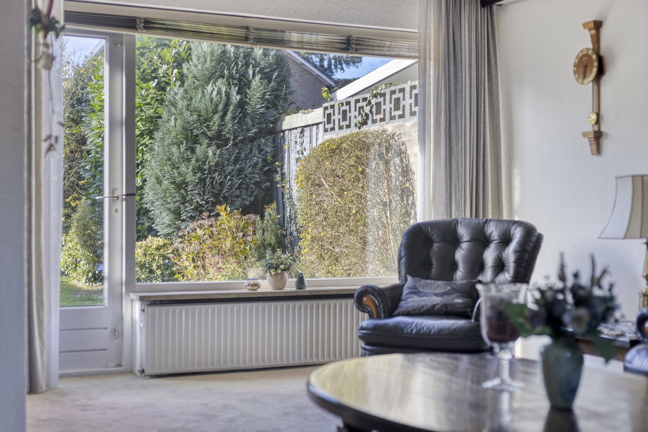 De opvallend brede woonkamer is aan de achterzijde uitgebouwd, waardoor een heerlijk ruime leefruimte is ontstaan. Grote raampartijen zorgen voor een fijne lichtinval en een prettig uitzicht op de achtertuin. Via de tuindeur stap je zo het terras op – ideaal voor zomerse dagen of een kop koffie in de ochtendzon. De travertin tegelvloer loopt deels door naar de hal en keuken, wat zorgt voor een rustige, natuurlijke uitstraling.