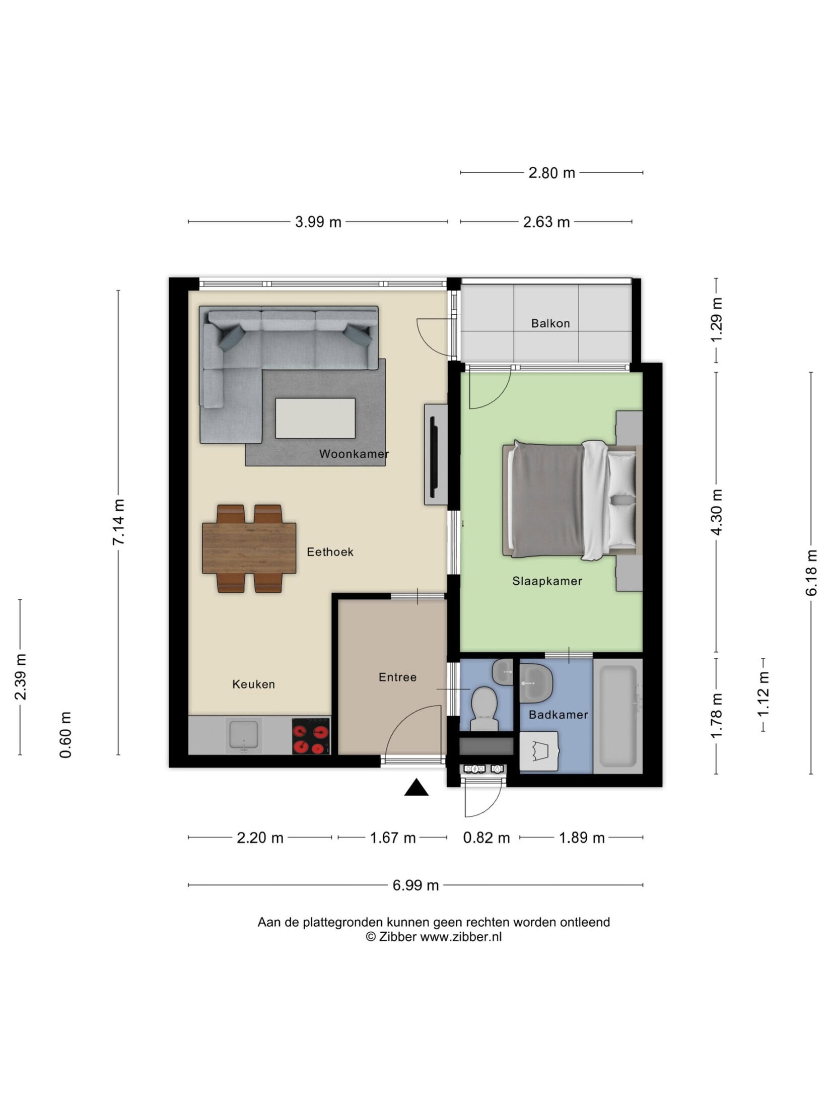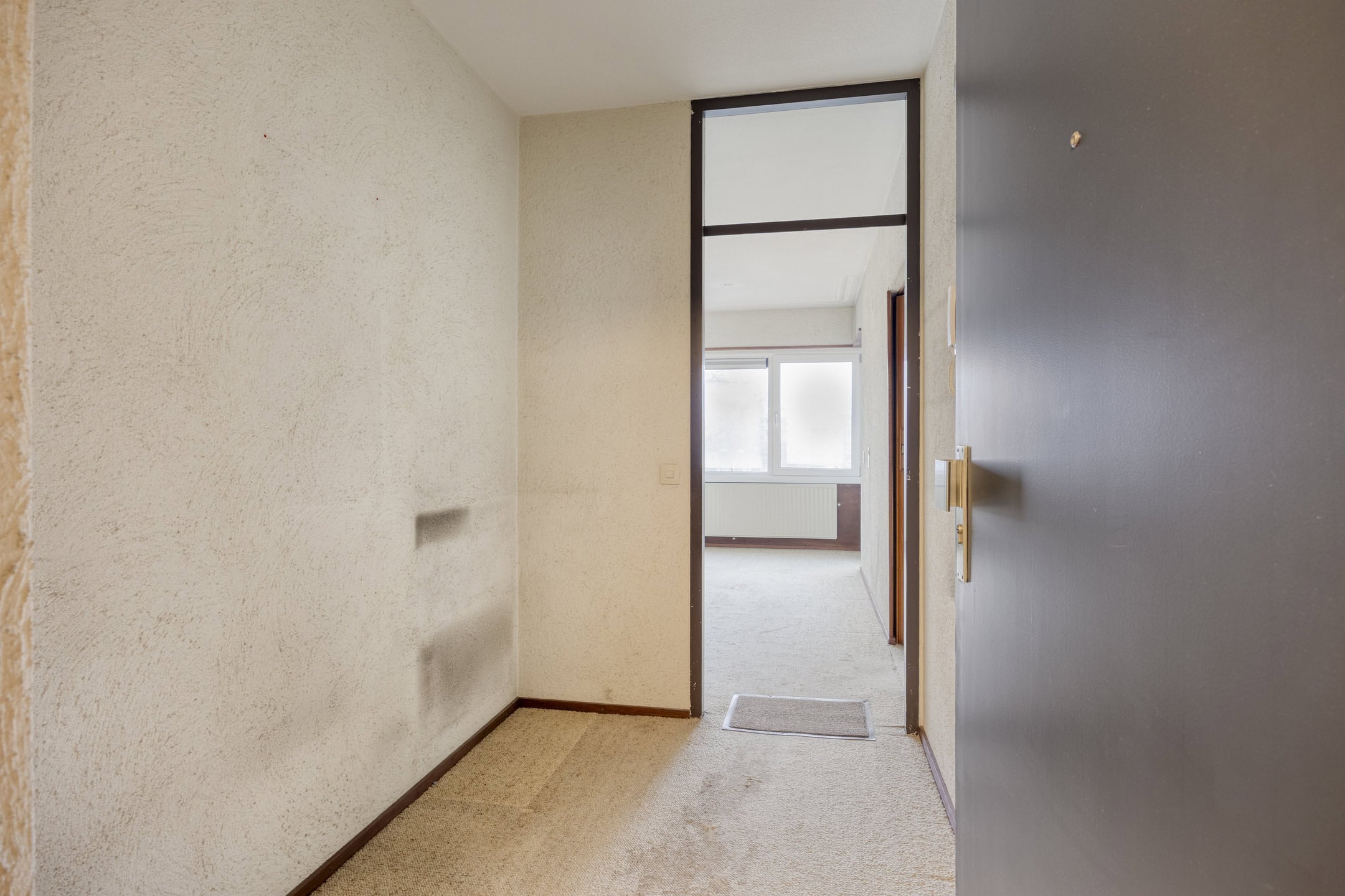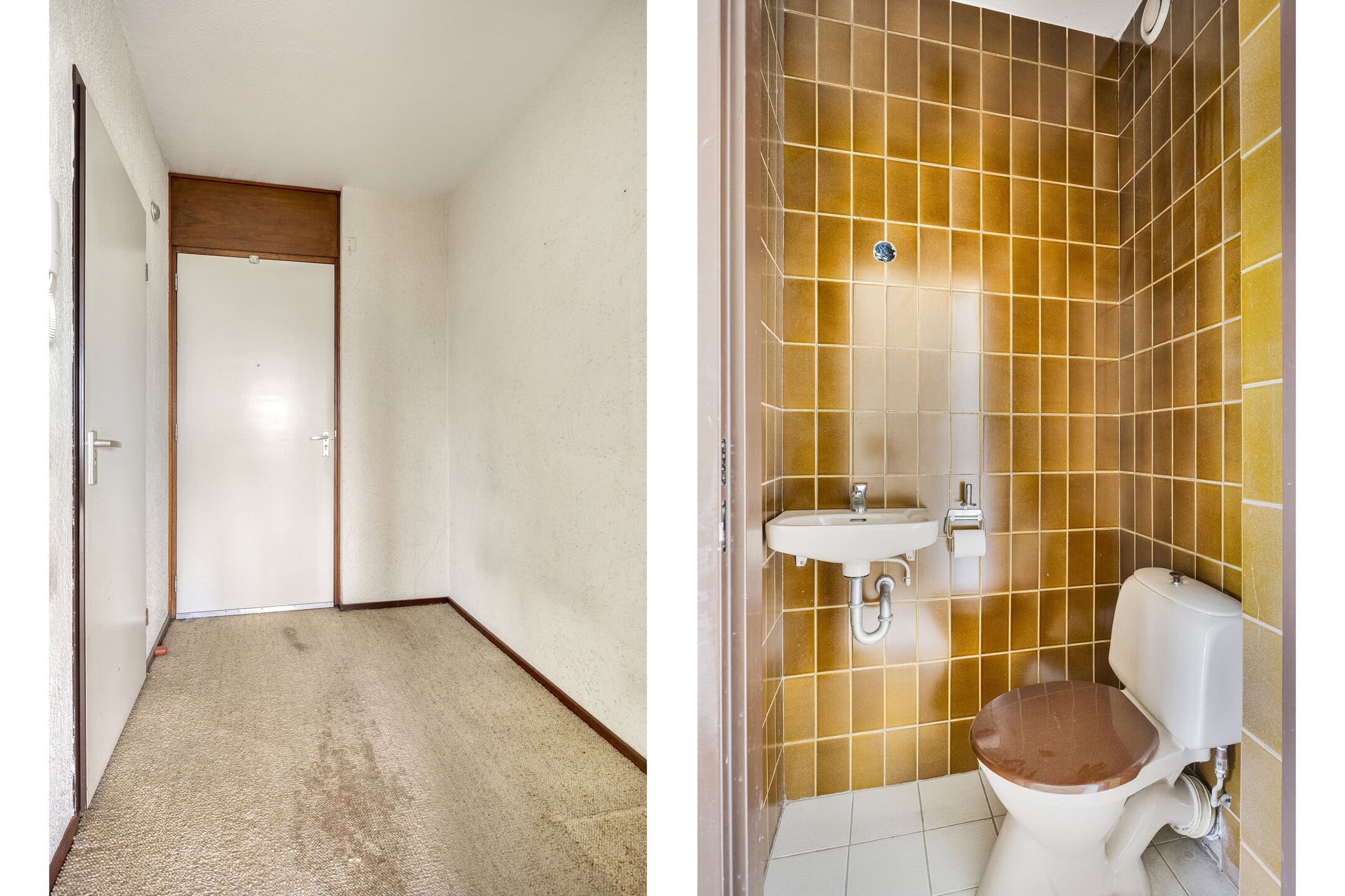 Je komt binnen in een praktische hal met telefoon, toiletruimte en plek voor garderobe of een garderobekast. Vanuit hier zijn de woonkamer, slaapkamer en badkamer bereikbaar.