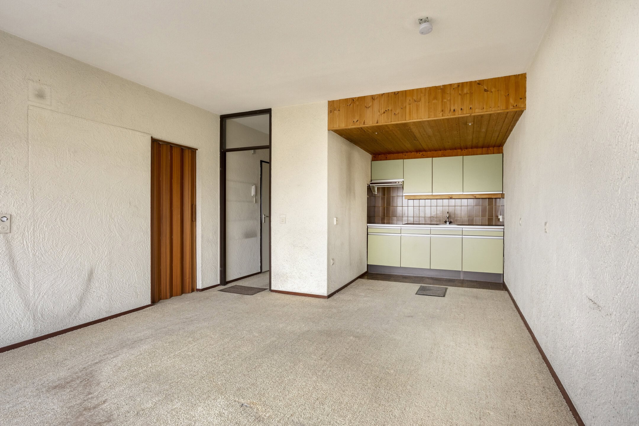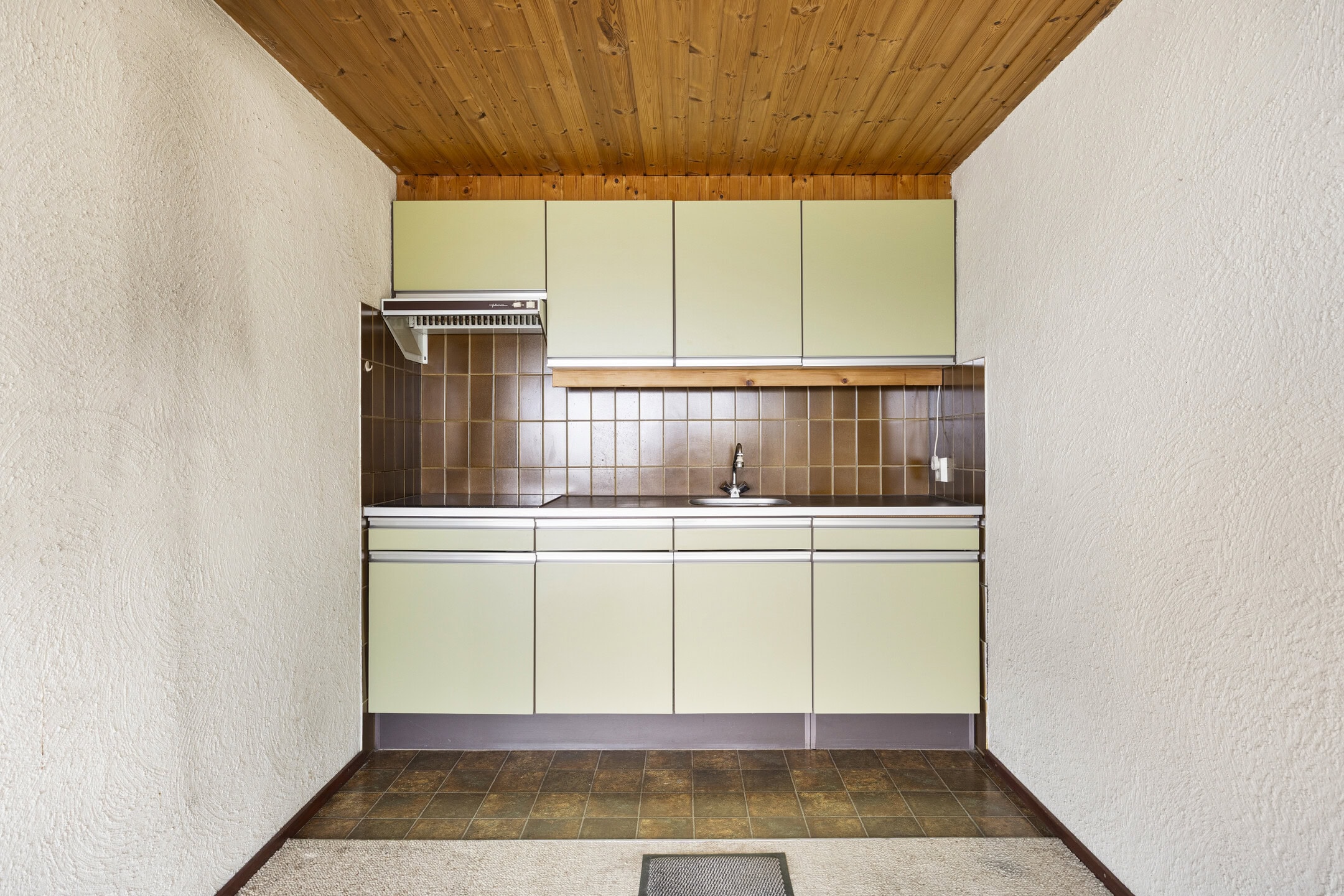 De open keuken heeft een eenvoudige wandopstelling met inductiekookplaat en afzuigkap. De basis is functioneel en biedt volop kansen om te moderniseren met extra werk- en kastruimte, een nieuwe frontafwerking of inbouwapparatuur naar wens.
