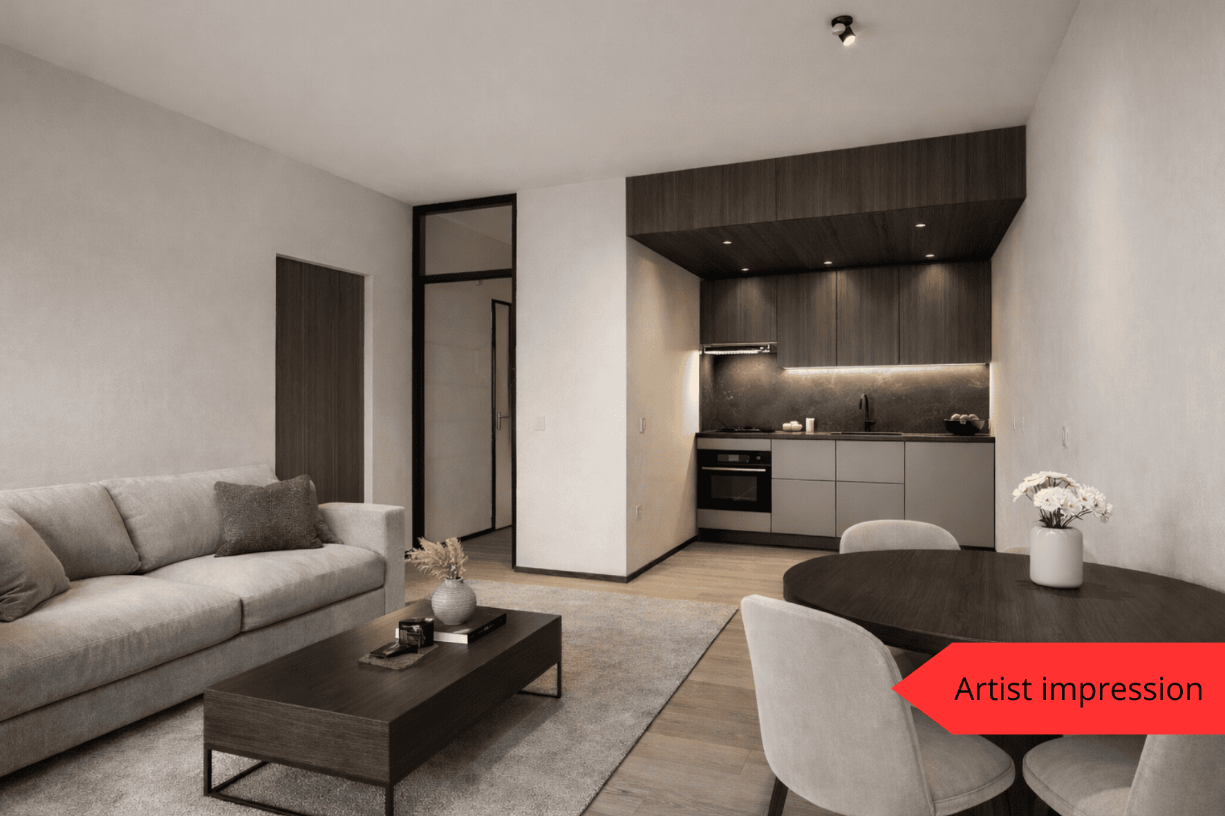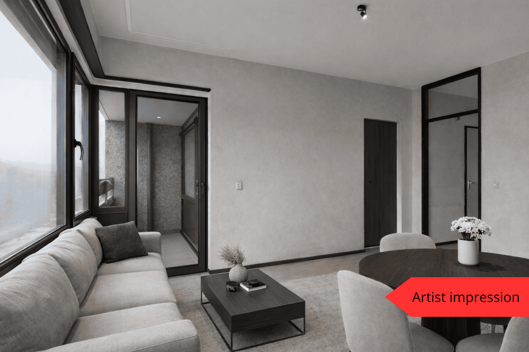 De woonkamer is royaal en geniet van veel daglicht dankzij de brede raampartijen met HR+++ glas. De kunststofkozijnen zijn voorzien van een ventilatierooster. De rechthoekige indeling maakt het inrichten eenvoudig: plaats een comfortabele zithoek bij het raam en creëer aan de keukenzijde ruimte voor een eettafel. De verbinding met het balkon verlengt het leefgebied op zonnige dagen.