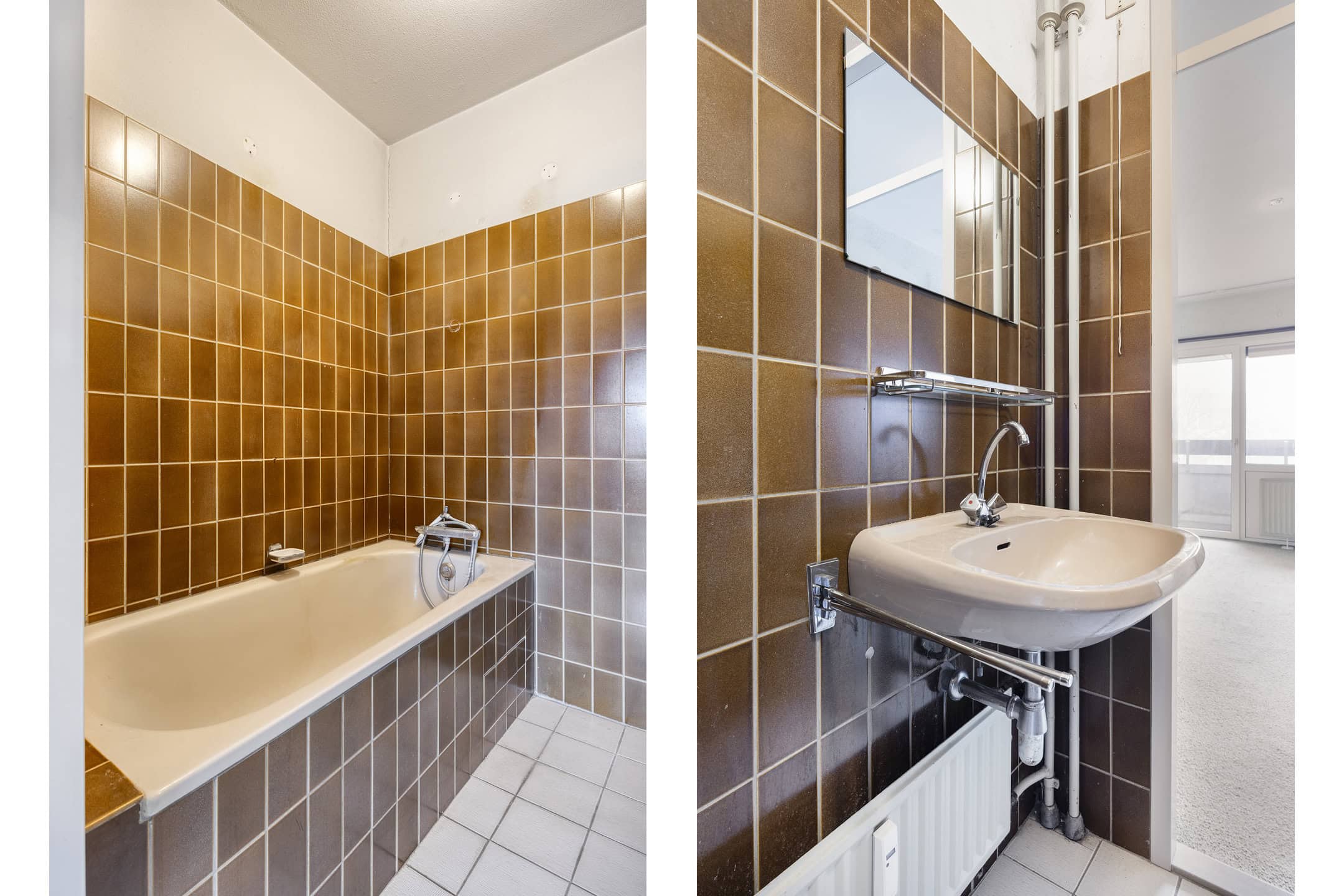 De badkamer is in originele staat en ingericht met een ligbad, vaste wastafel en de witgoedaansluitingen. Wie wil, kan hier relatief eenvoudig een tijdloze ruimte van maken met bijvoorbeeld een inloopdouche, nieuw tegelwerk en extra opbergruimte.