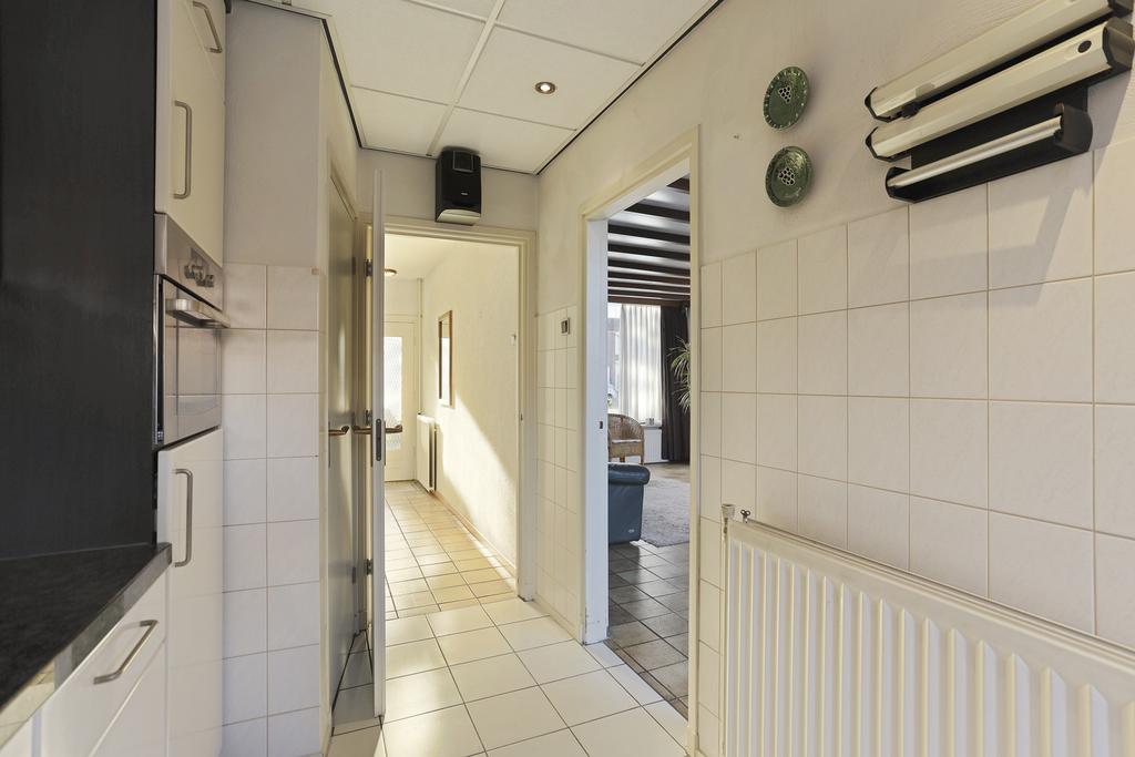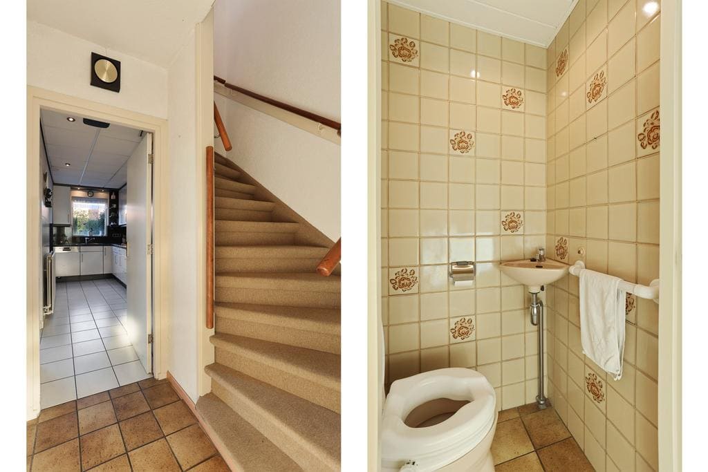 De hal geeft toegang tot de garderoberuimte, meterkast, toilet, trapopgang naar de eerste verdieping en de deur naar de keuken. De toiletruimte is volledig betegeld en voorzien van wastafel.