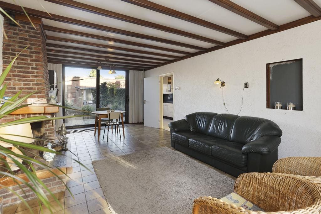 Op de grond ligt een plavuizen vloer en de wanden zijn voorzien van stucwerk. De open haard maakt het tot een sfeervol geheel.