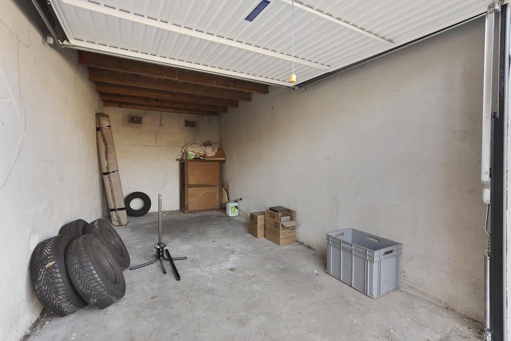 De garage beschikt over een betonvloer en een nieuwe kanteldeur.