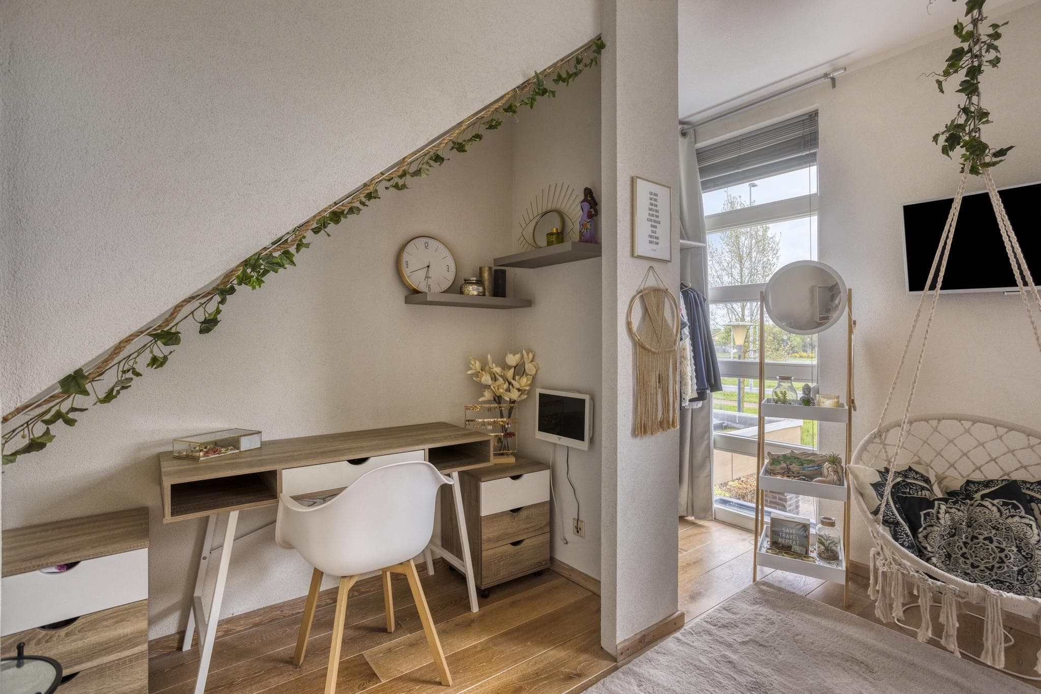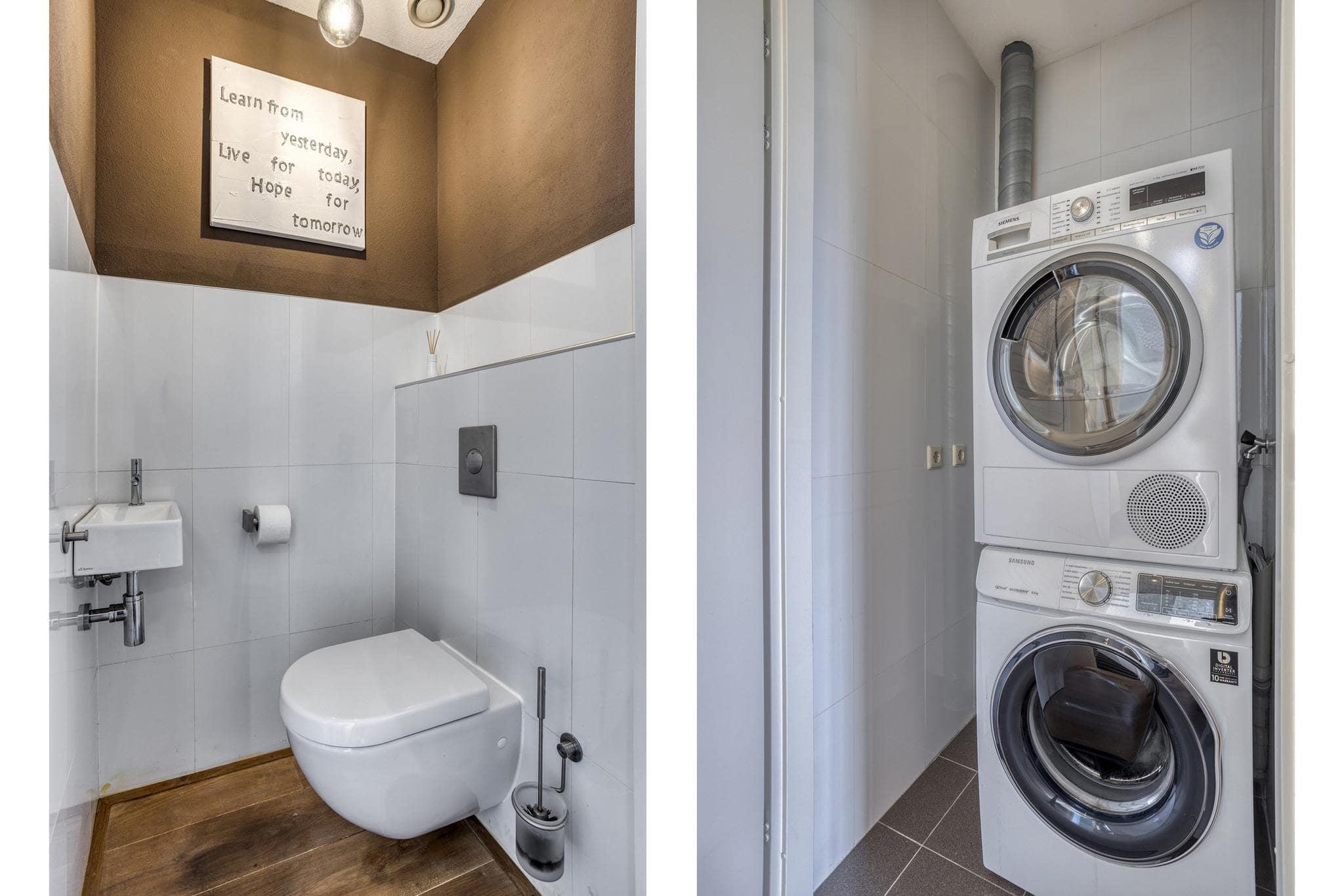 Slaapkamer 1 ligt aan de achterzijde en beschikt over een ruime inloopgarderobe en airconditioning. Slaapkamer 2 aan de voorzijde is eveneens voorzien van airco en heeft een handige werk- of studieruimte onder de trap. Daarnaast is er een betegelde wasruimte met aansluitingen voor wasmachine en droger.