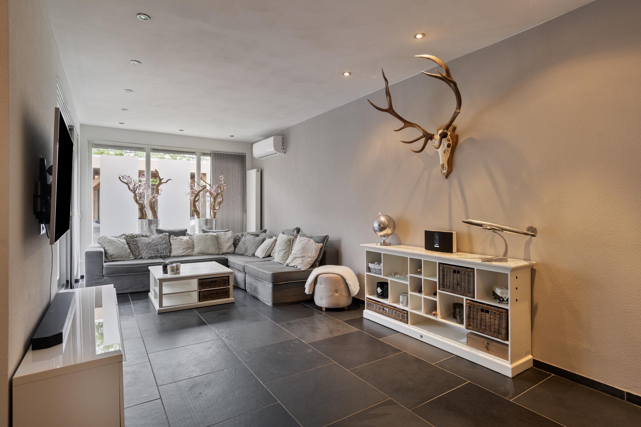 De gehele begane grond (m.u.v. de garage) is voorzien van een natuurlijke Braziliaanse leistenen vloer met vloerverwarming als hoofdverwarming. De woning is aan de zijkant enorm uitgebouwd, waardoor een zeer ruime living is ontstaan met veel daglicht, een trapkast en dubbele tuindeuren naar het overdekte terras.