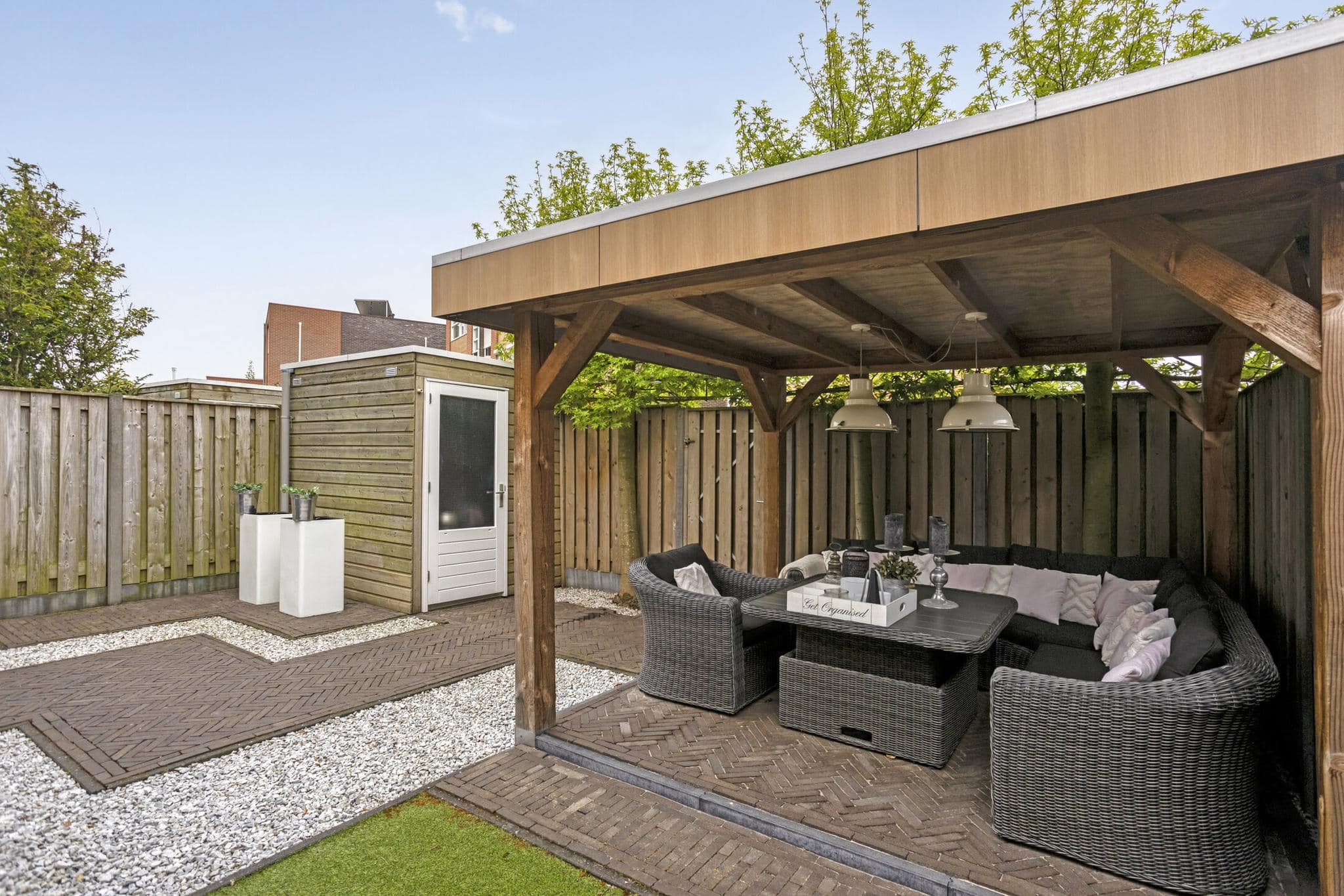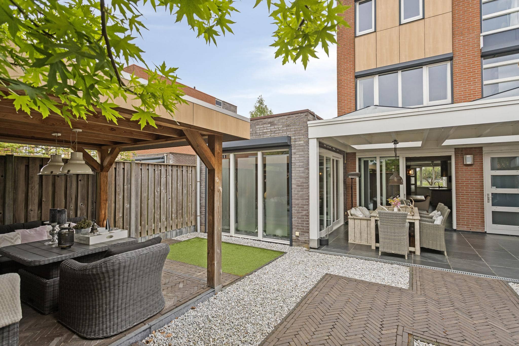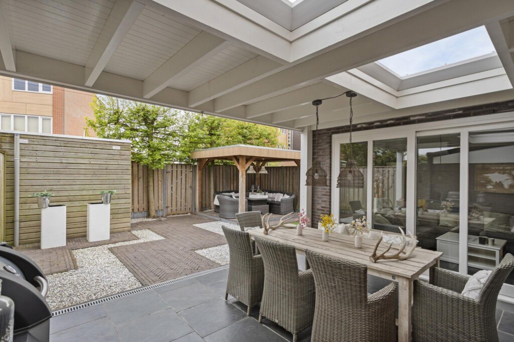 De achtertuin is in 2022 volledig opnieuw aangelegd en biedt veel privacy. Een combinatie van groen, sierbestrating en twee overdekt terrassen maakt het een fijne plek om te ontspannen. De extra tuindeuren van de zij-uitbouw bieden samen met de tuindeuren van de woning praktische en flexibele toegang tot de tuin en overkapping. Met het openen van alle tuindeuren haal je de tuin naar binnen en wordt het overdekt betegeld terras, met lichtstraat, een verlengstuk van de woonkamer.