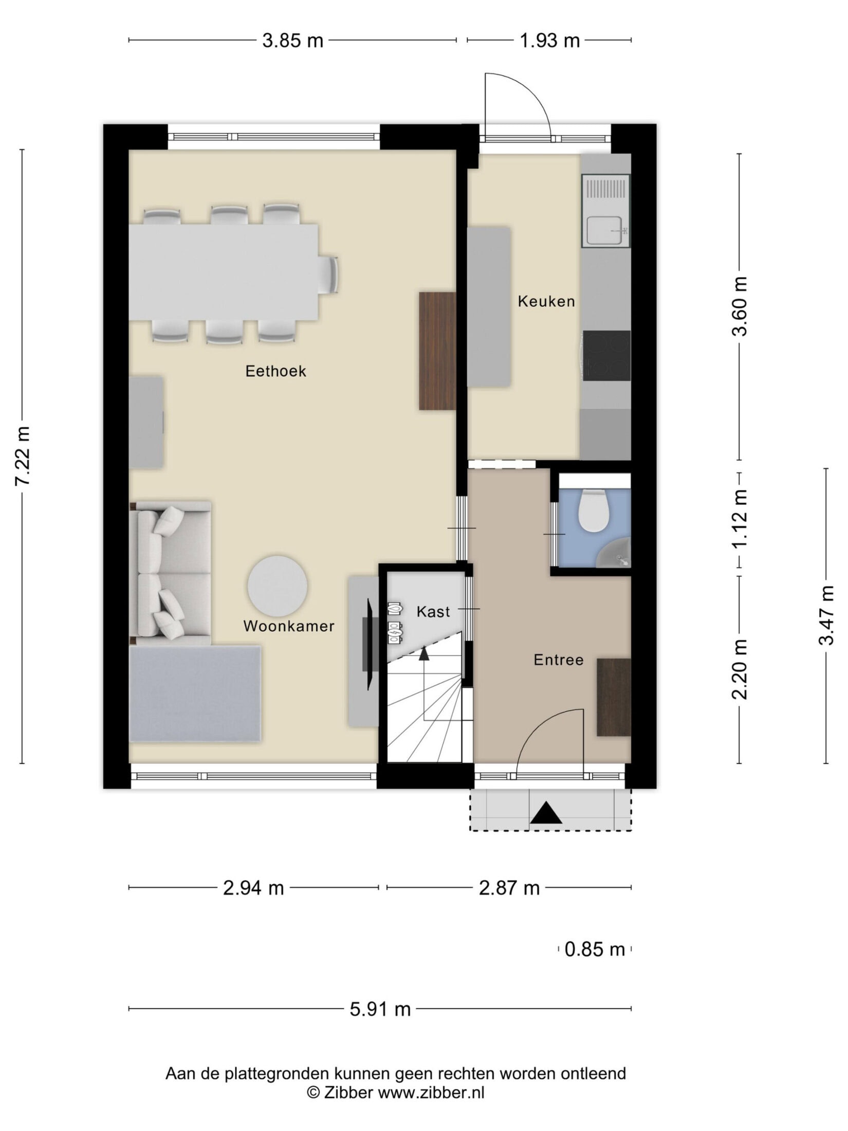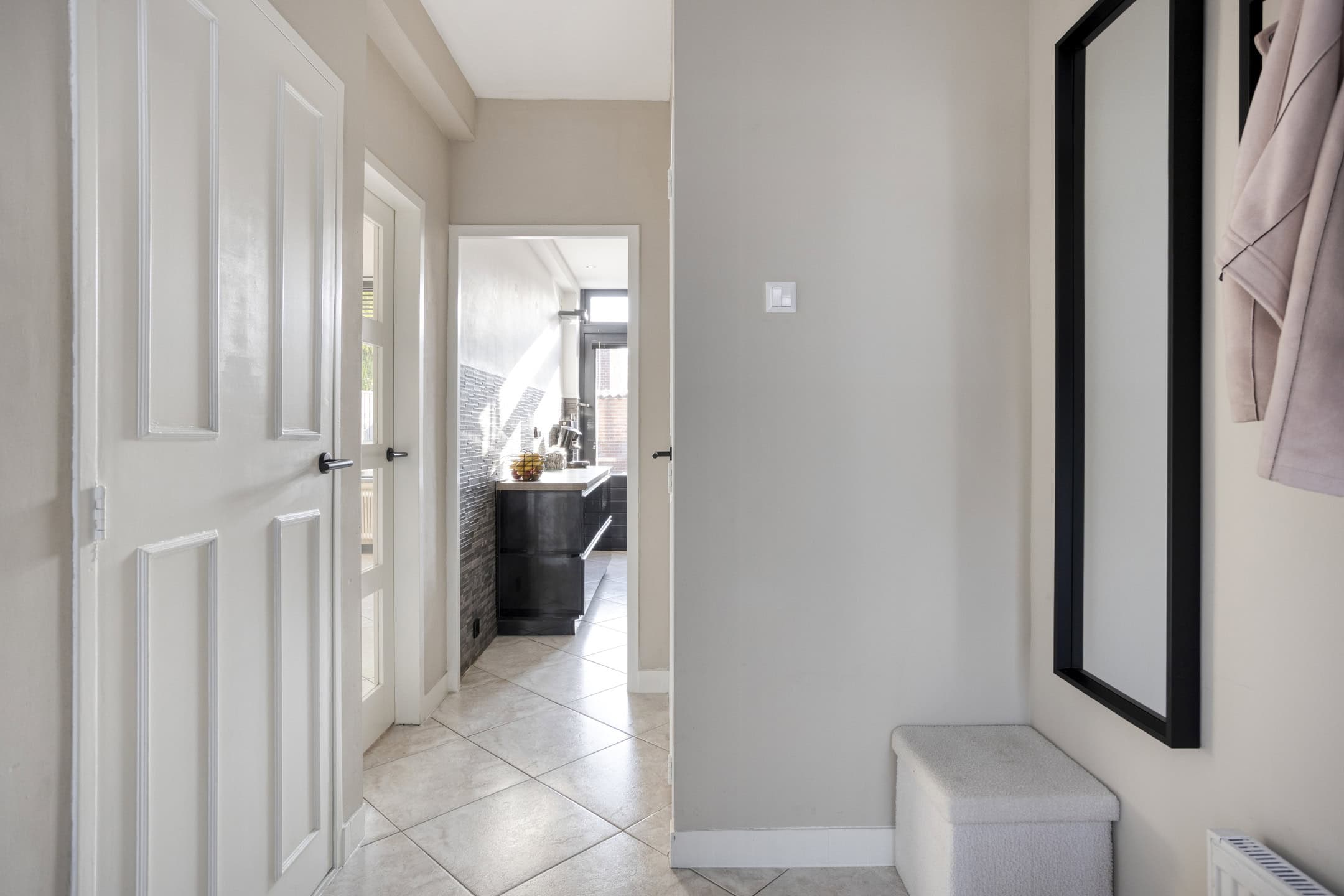Bij binnenkomst in de lichte hal vindt u direct de garderobe, de meterkast, een praktische trapkast met extra bergruimte en de betegelde toiletruimte met wandcloset en fonteintje. Via de hal bereikt u de trapopgang naar de eerste verdieping en de ruime, sfeervolle woonkamer.