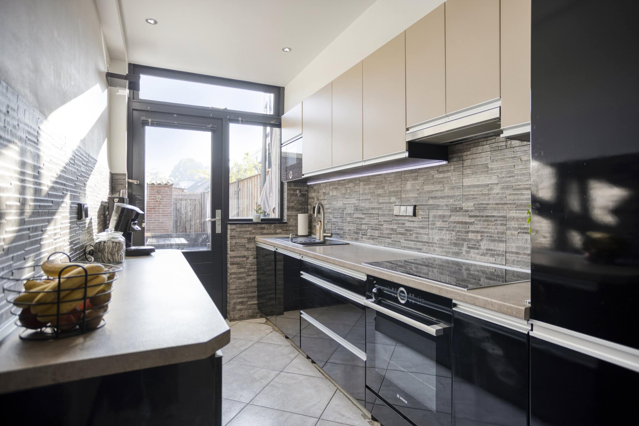 De moderne keuken sluit hier naadloos op aan en is uitgerust met diverse inbouwapparaten: een inductiekookplaat, afzuigkap, koelkast, oven, magnetron en vaatwasser. De praktische boven- en onderkasten zorgen voor veel opbergruimte. Vanuit de keuken leidt een loopdeur direct naar de zonnige achtertuin, waardoor koken en buitengenieten moeiteloos in elkaar overlopen.