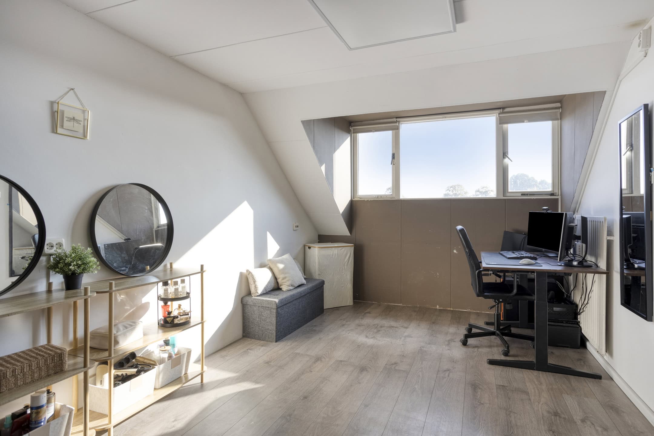De vierde slaapkamer is verrassend ruim dankzij de geplaatste dakkapel en wordt hierdoor heerlijk licht en luchtig. Deze ruimte kan uitstekend dienstdoen als extra slaapkamer, werkplek of logeerkamer. Onder de schuine kanten is bovendien veel bergruimte gecreëerd.