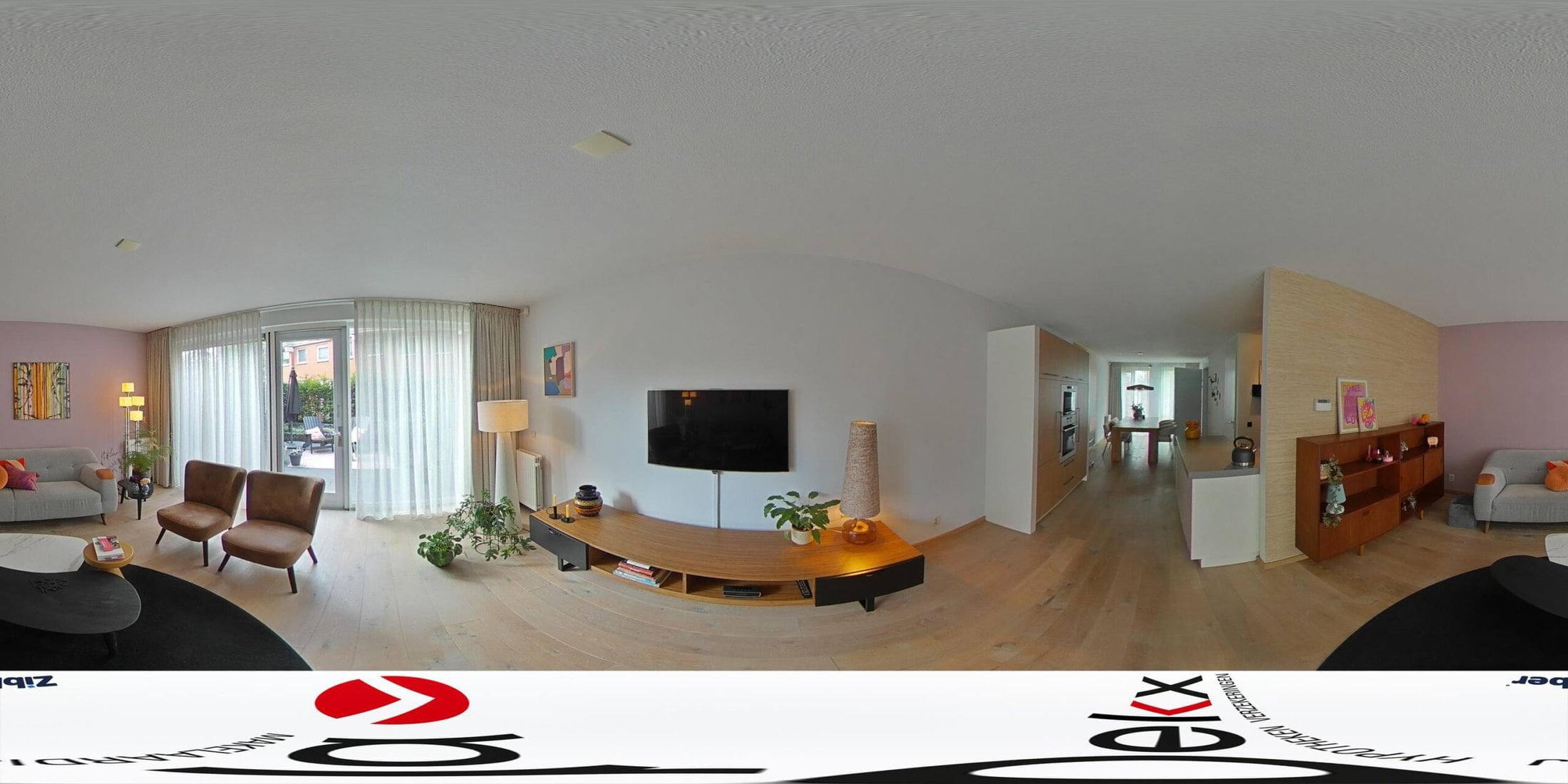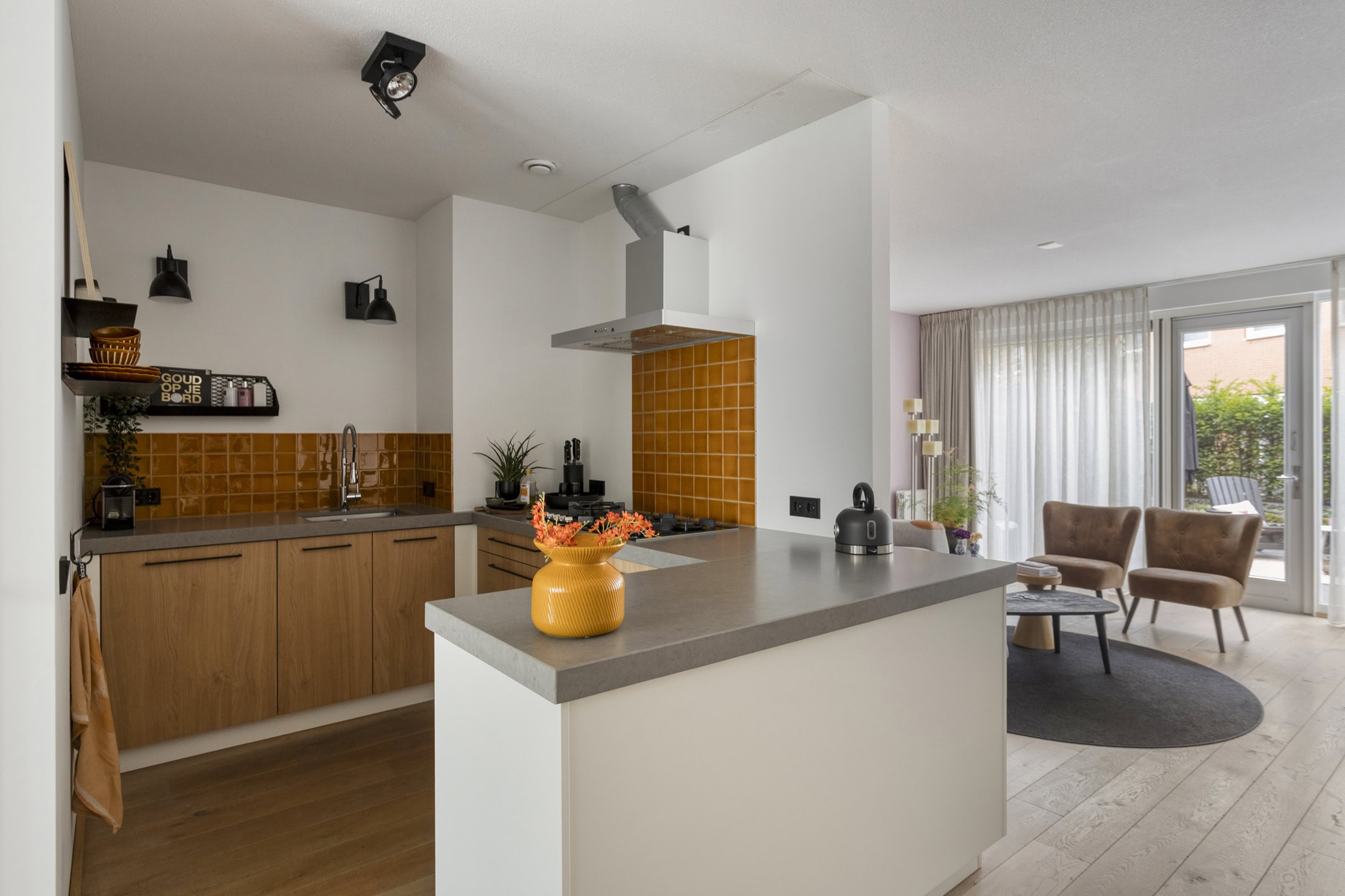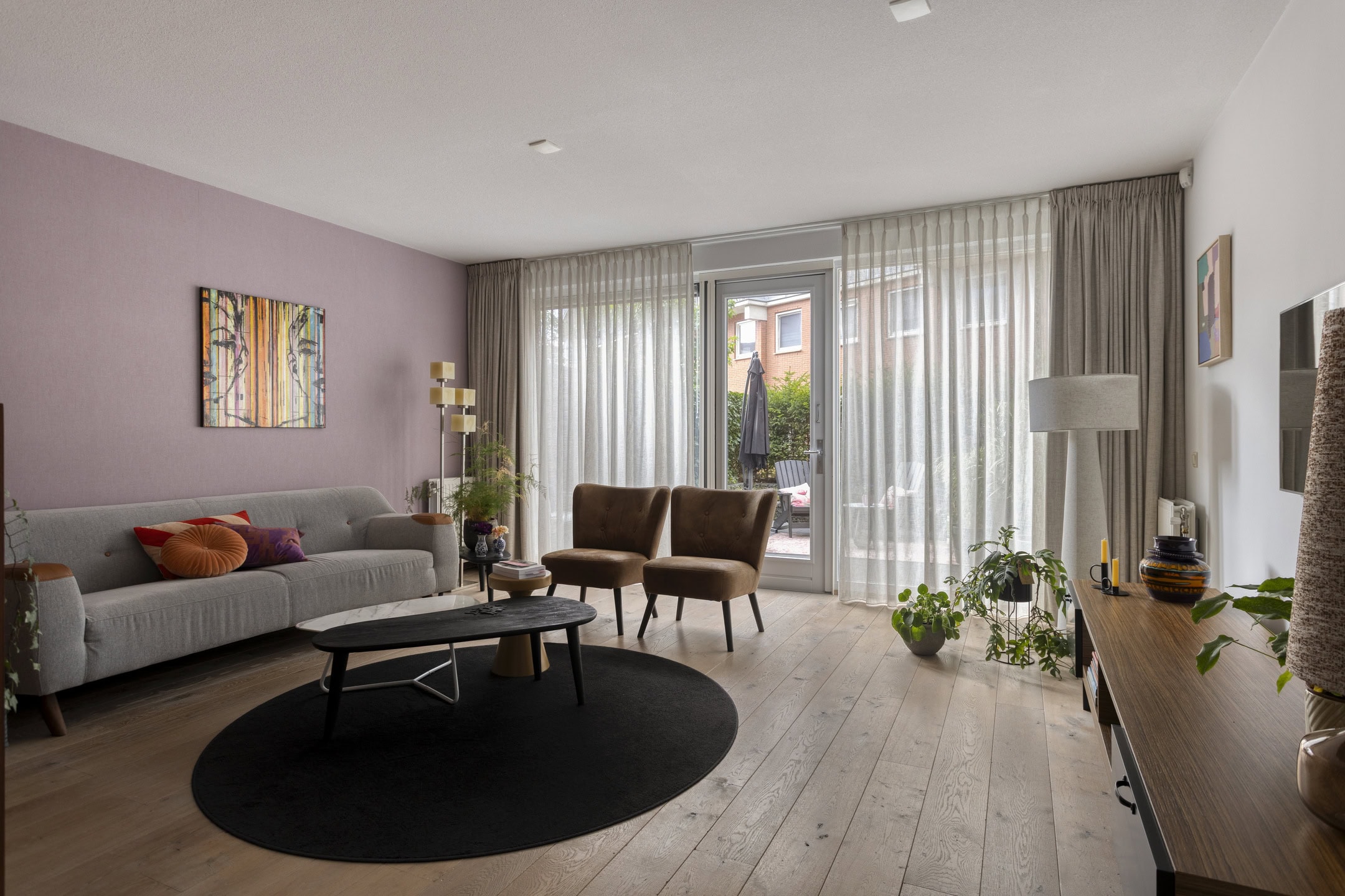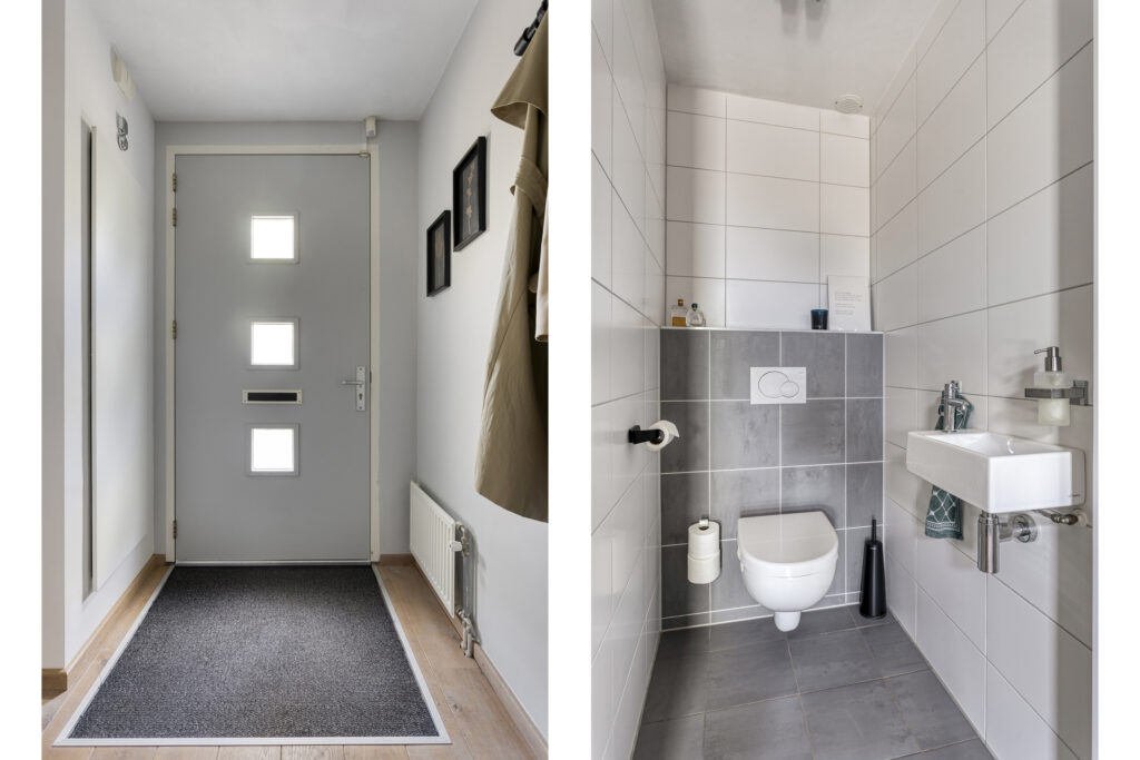 Je komt binnen via je eigen voordeur. In de hal vind je de meterkast en een modern toilet. Daarna stap je de woonkamer in: een prettige, tuingerichte leefruimte waar binnen en buiten makkelijk in elkaar overlopen. De grote ramen zorgen voor veel daglicht en een fijne zithoek. De plankenvloer geeft de ruimte een warme, rustige basis.