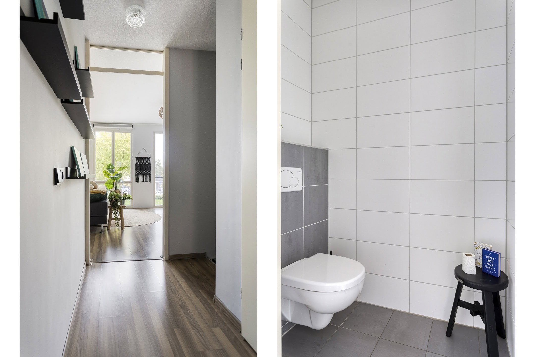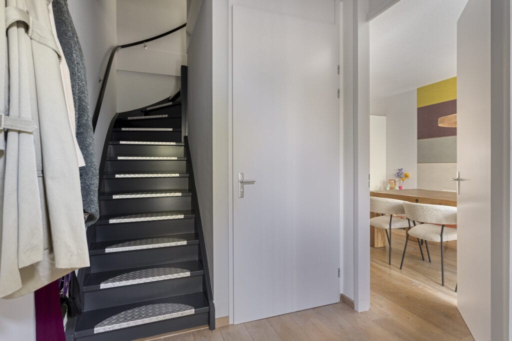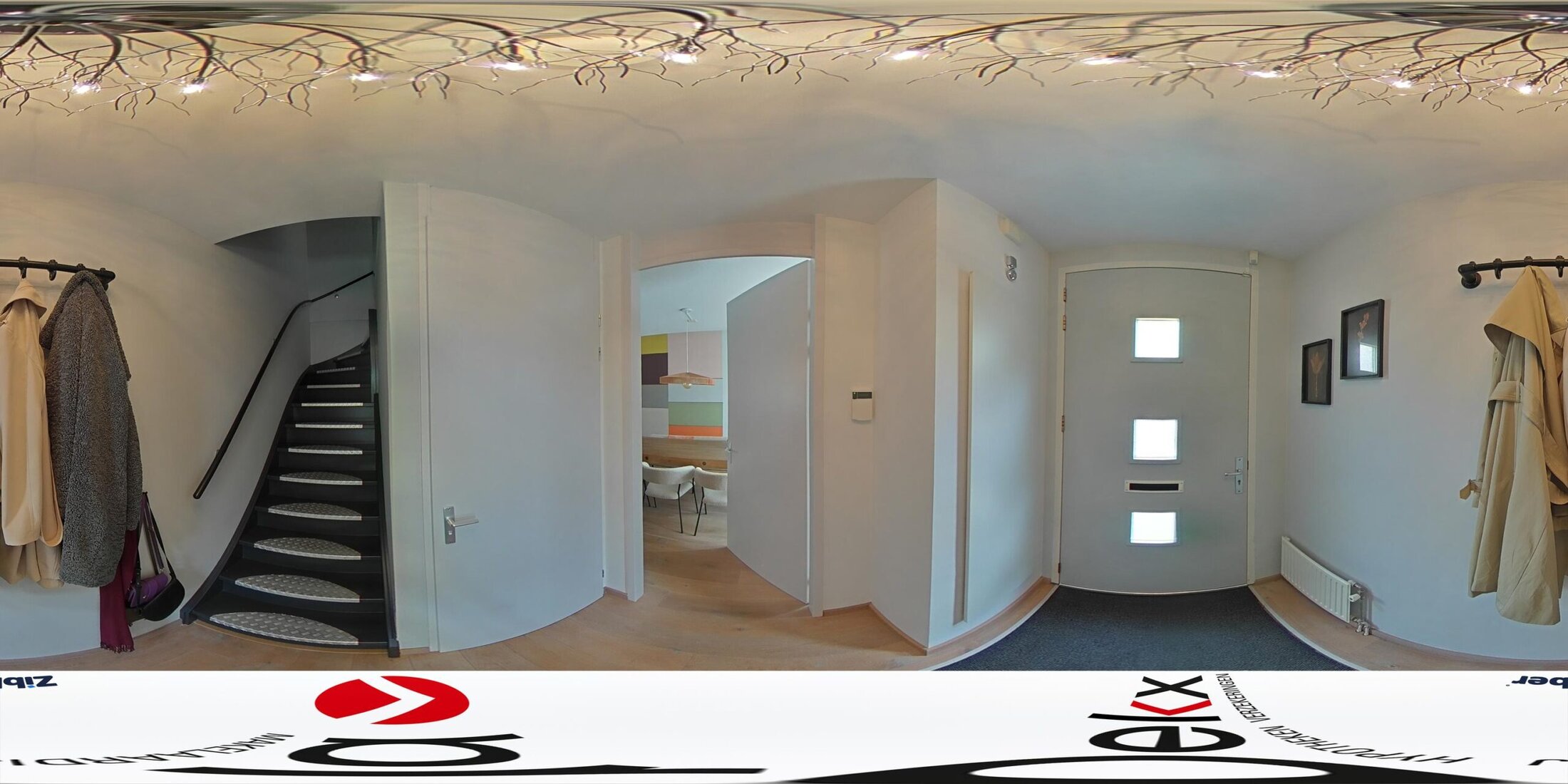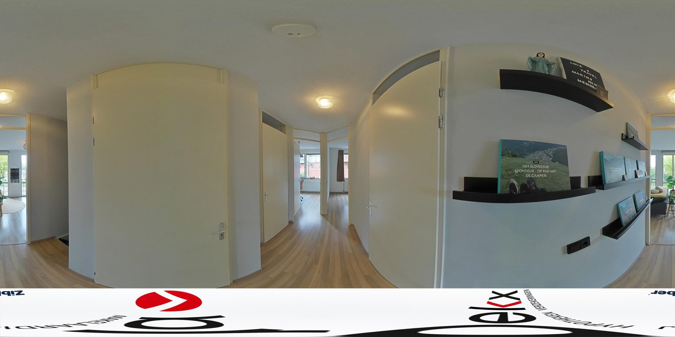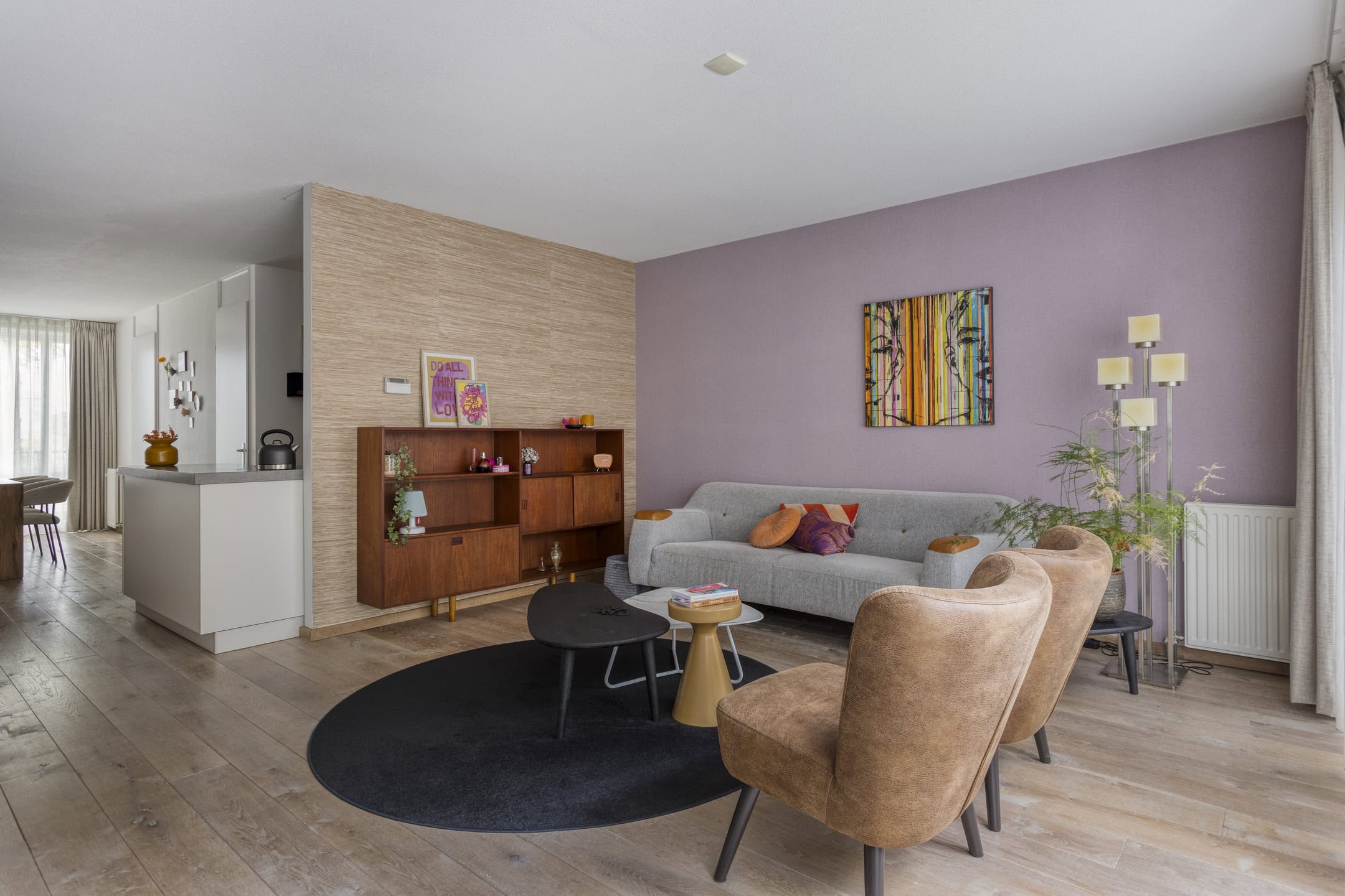 Je komt binnen via je eigen voordeur. In de hal vind je de meterkast en een modern toilet. Daarna stap je de woonkamer in: een prettige, tuingerichte leefruimte waar binnen en buiten makkelijk in elkaar overlopen. De grote ramen zorgen voor veel daglicht en een fijne zithoek. De plankenvloer geeft de ruimte een warme, rustige basis.