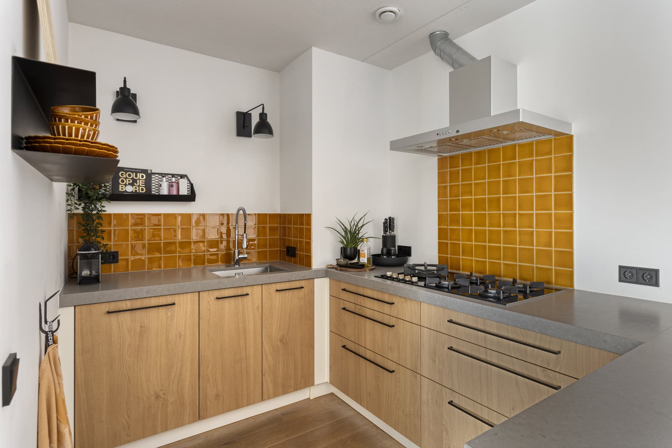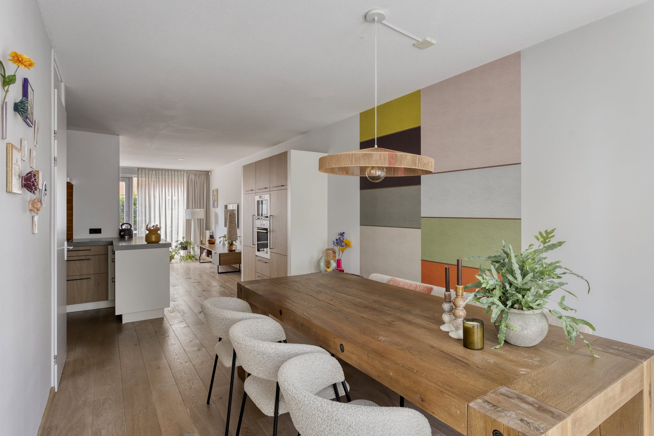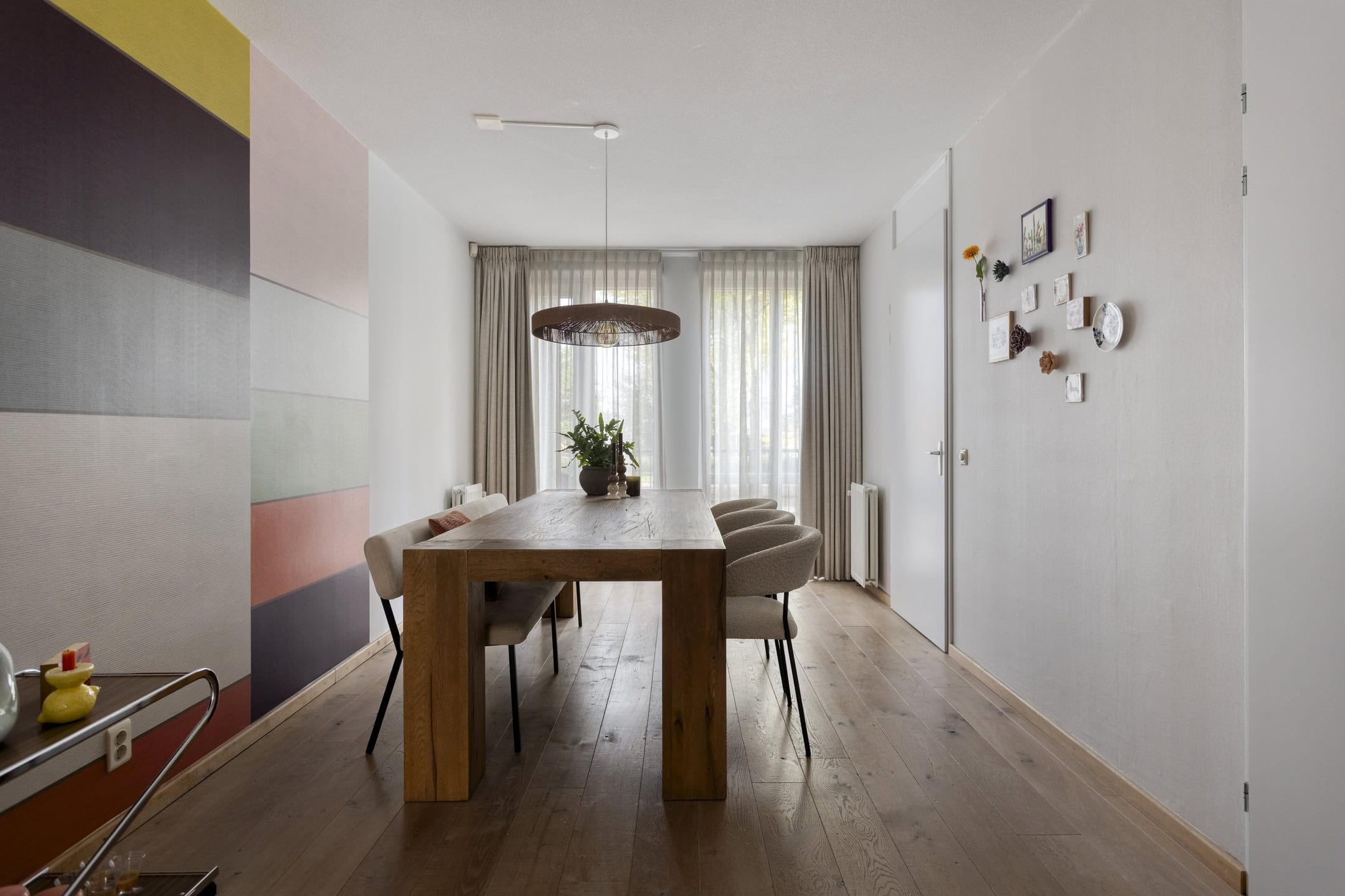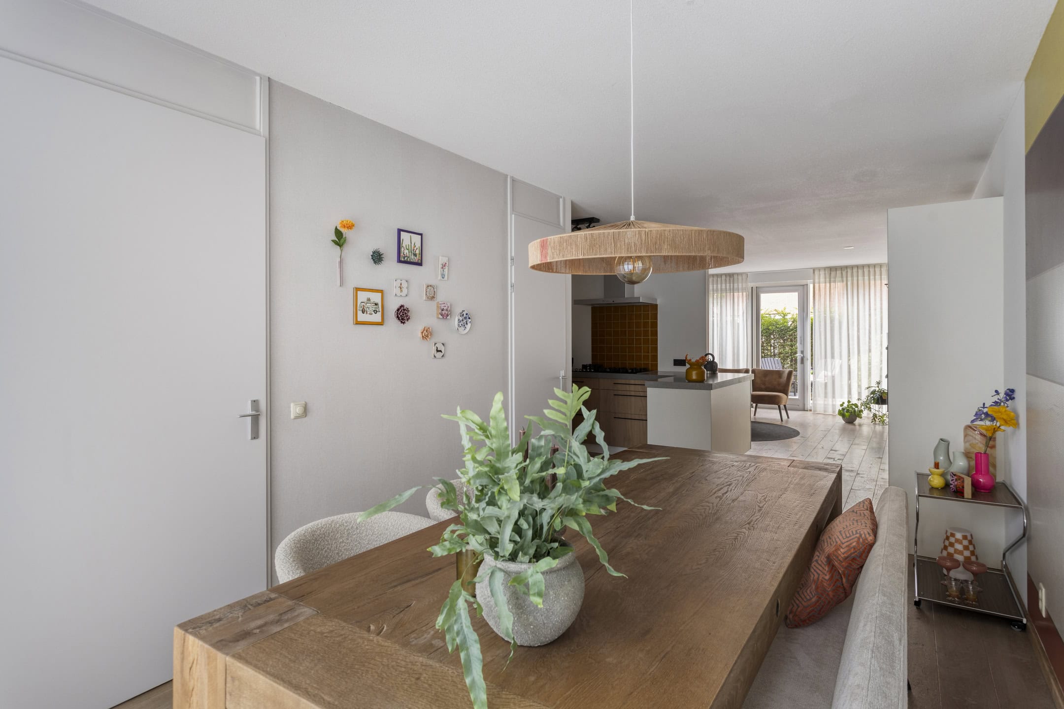 Aan de voorzijde ligt de eetkamer en keuken, het hart van het huis. De keuken is compleet uitgerust met gaskookplaat, afzuigkap, koelkast, vriezer, oven, magnetron en vaatwasser. Er is voldoende werk- en kastruimte en je kijkt gezellig uit op de straat. De open verbinding met de eethoek maakt dit een fijne plek voor dagelijks koken en etentjes met vrienden.