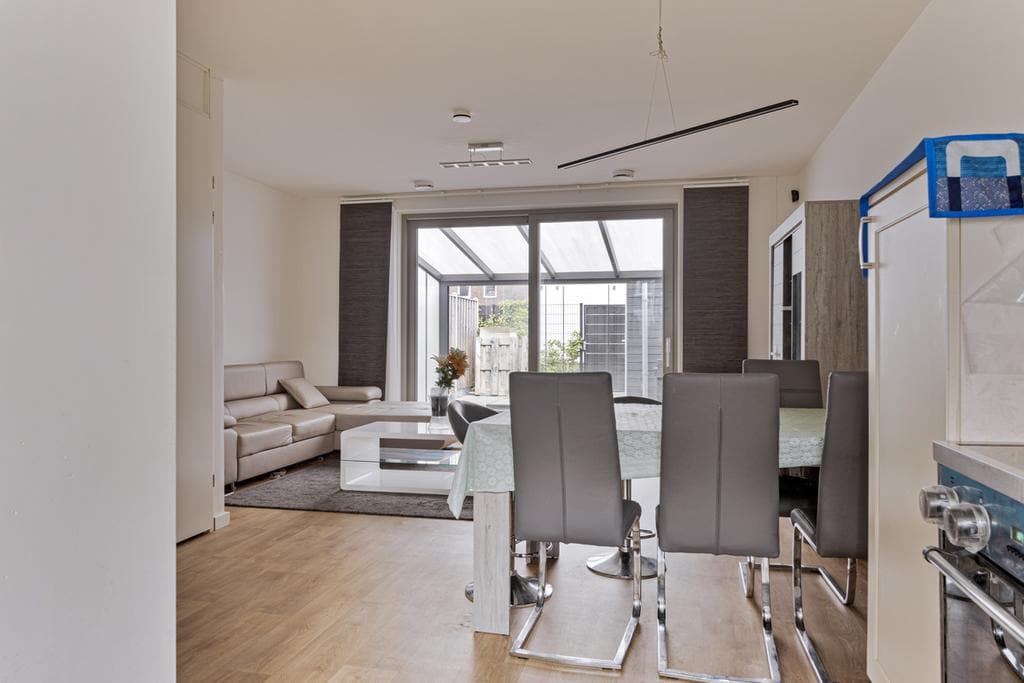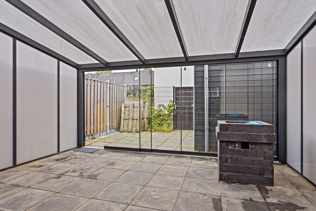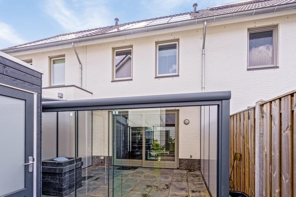 De serre, met glazen schuifpuien, biedt toegang tot de licht betegelde tuin. Hier vindt u een schuur en een handige achterom. De serre zorgt ervoor dat u het hele jaar door kunt genieten van een binnen-buiten gevoel.