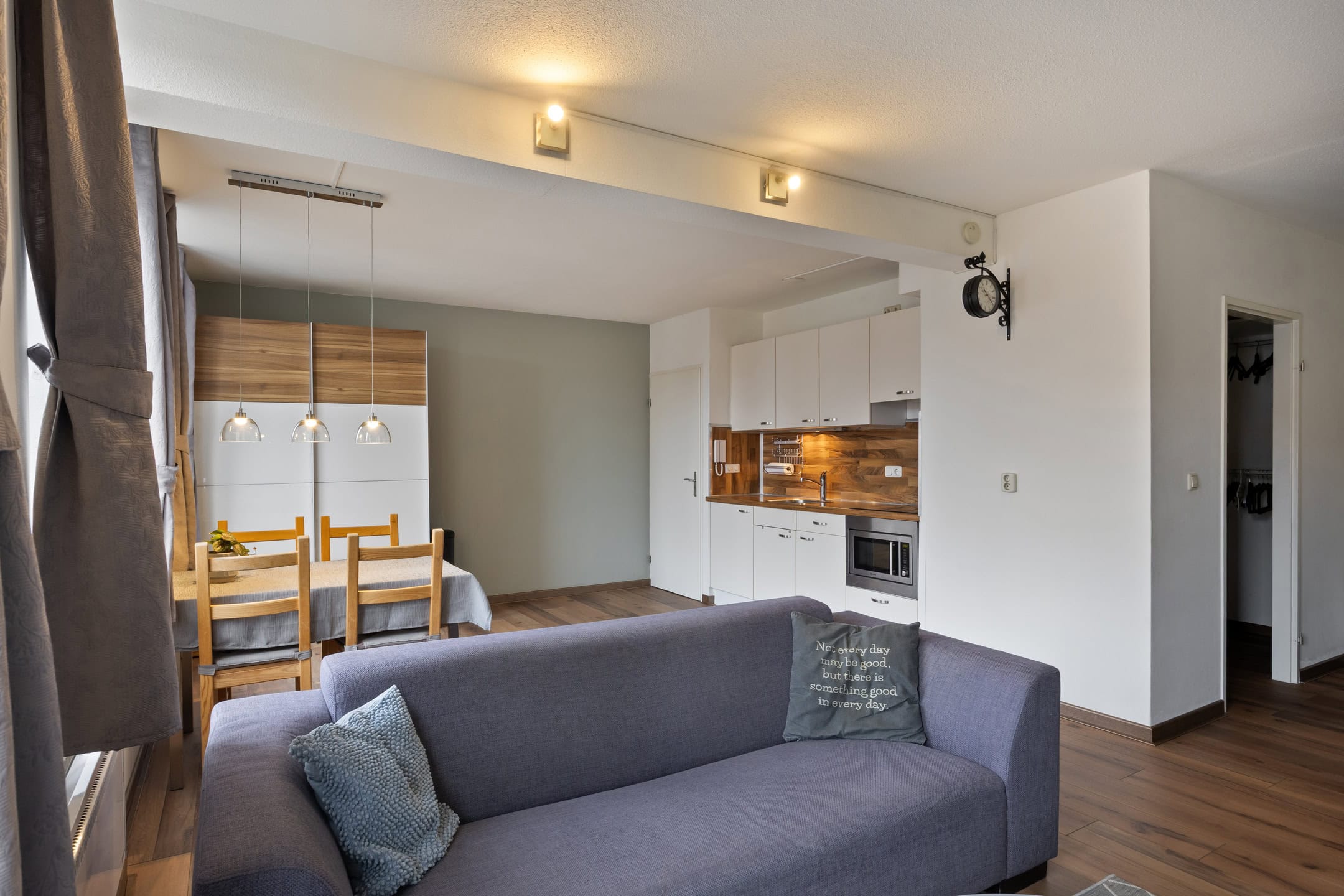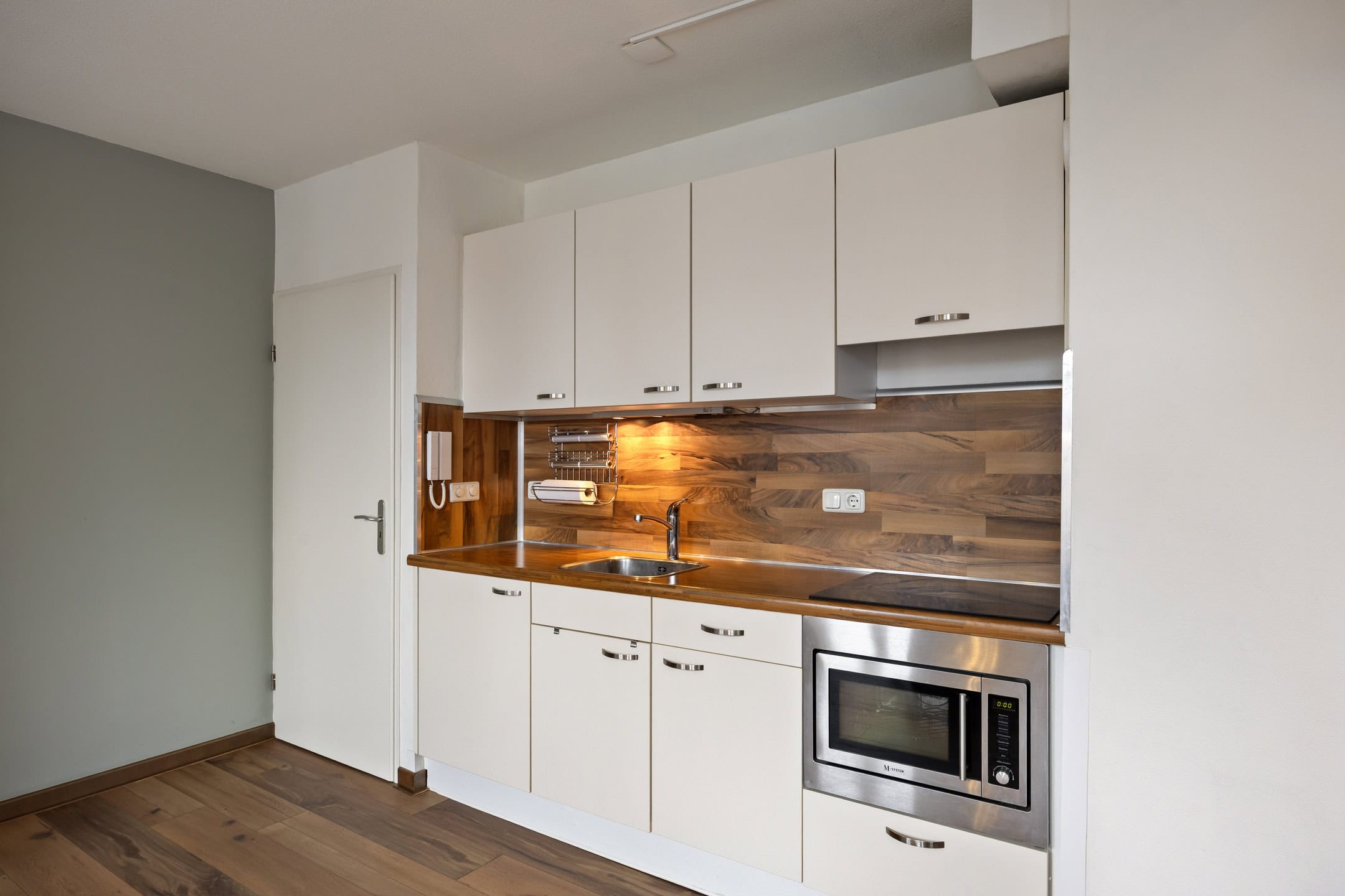 De nette, open keuken in wandopstelling uitgevoerd is uitgerust met een koelkast, inductie kookplaat met afzuiging, combi oven/magnetron en diverse boven- en onderkastjes. Het aanrechtblad met mengkraan en spoelbak biedt voldoende werkruimte voor het bereiden van uw maaltijden.