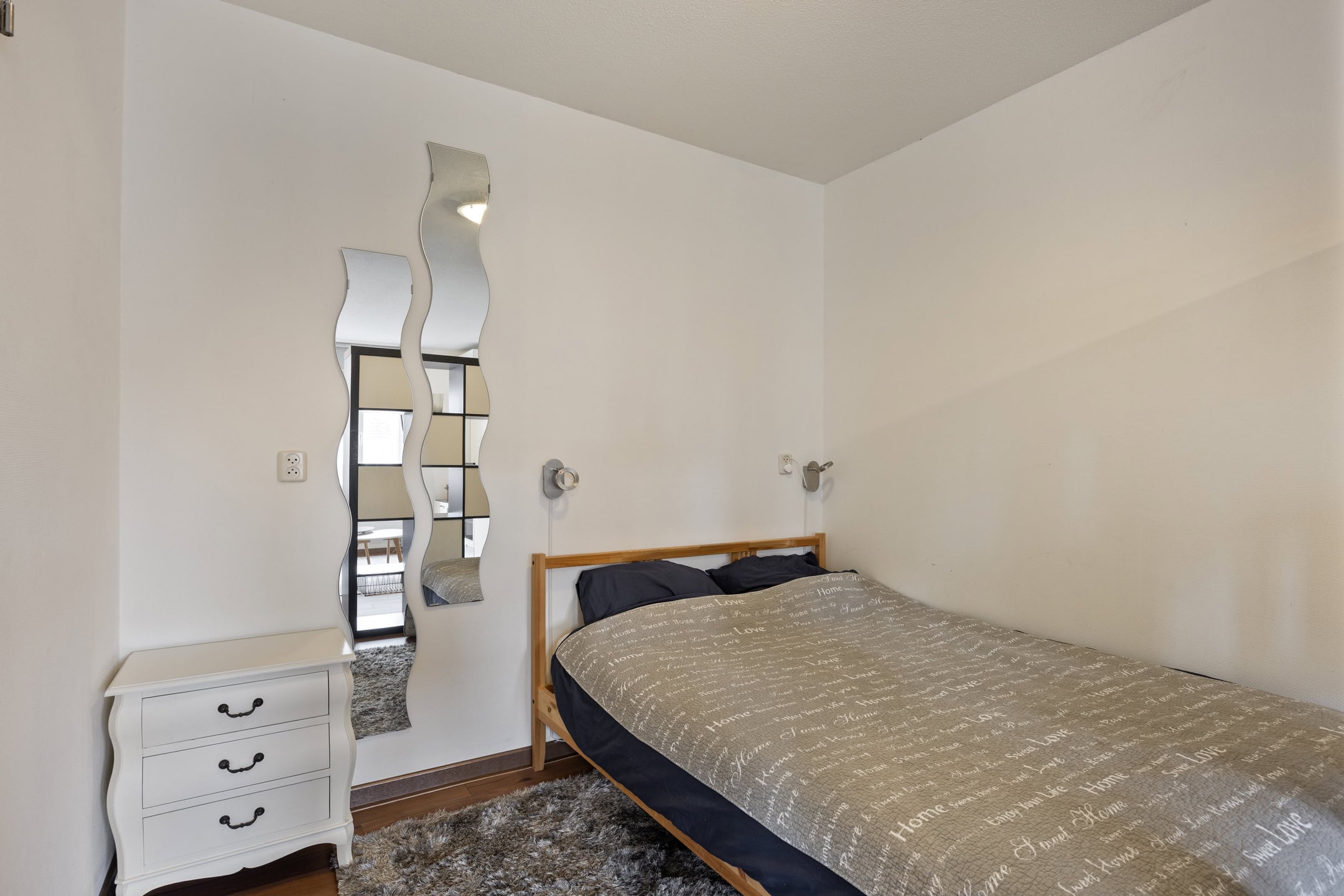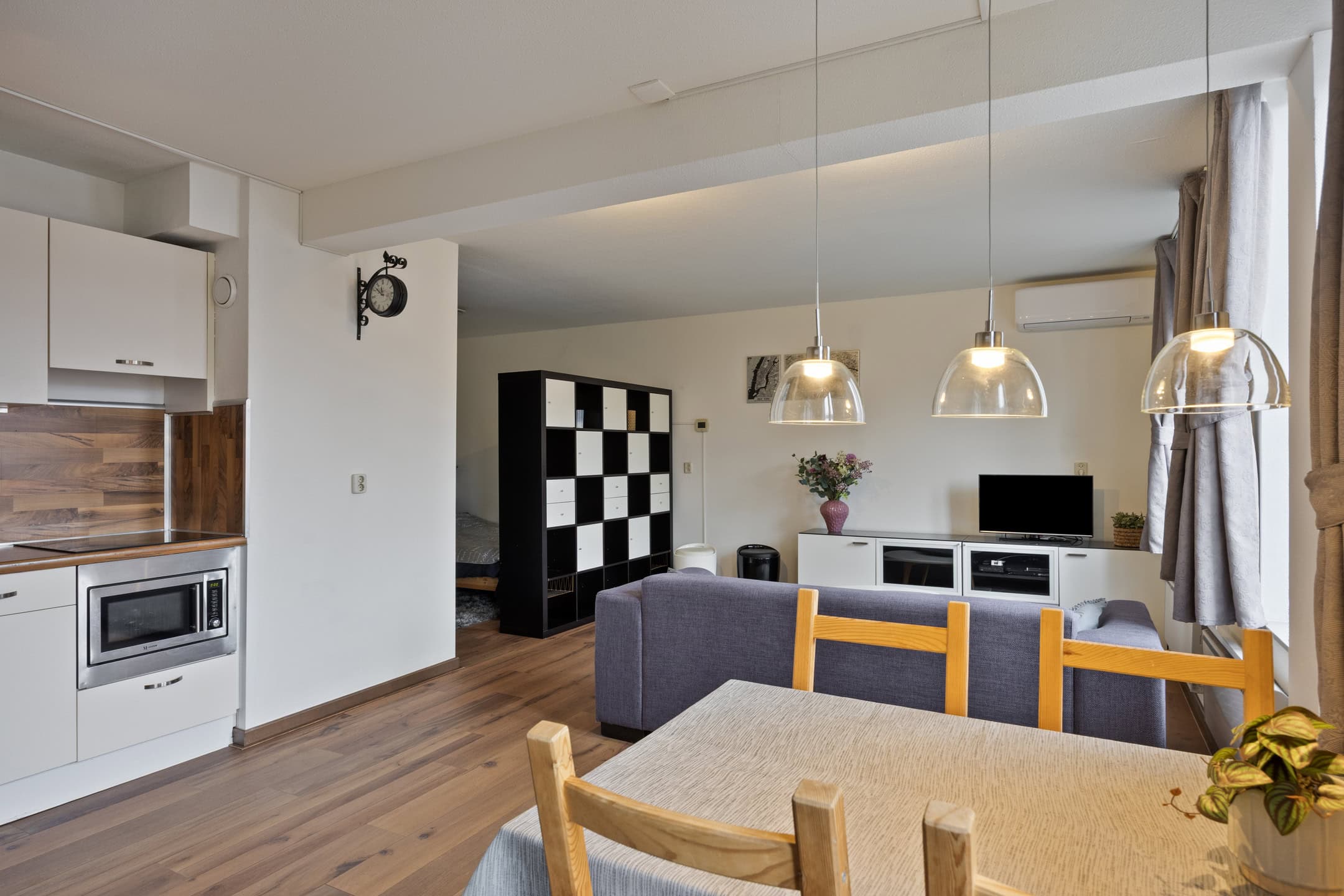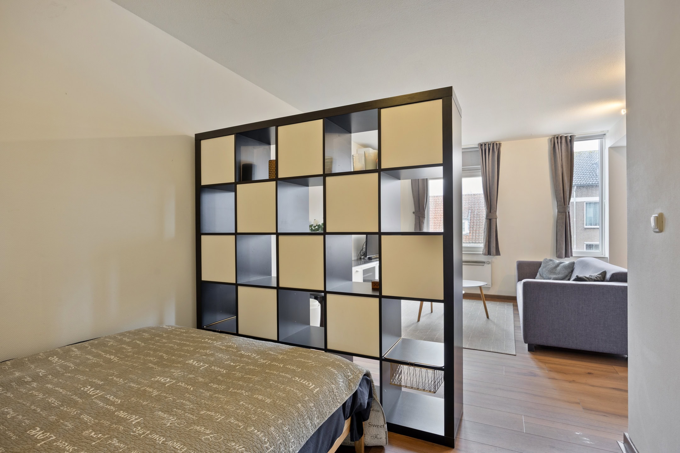 Het slaapgedeelte is door middel van een praktische roomdivider met opbergmogelijkheden afgescheiden van de woonkamer. Daarnaast is er een royale kledingkast voor extra kastruimte aanwezig.