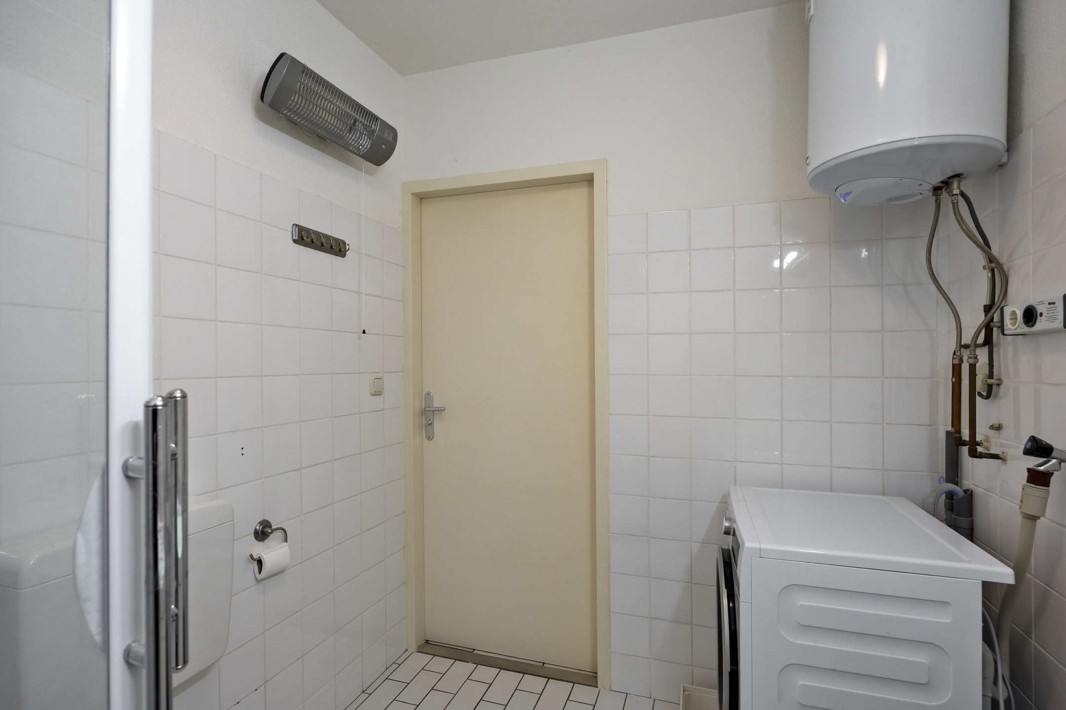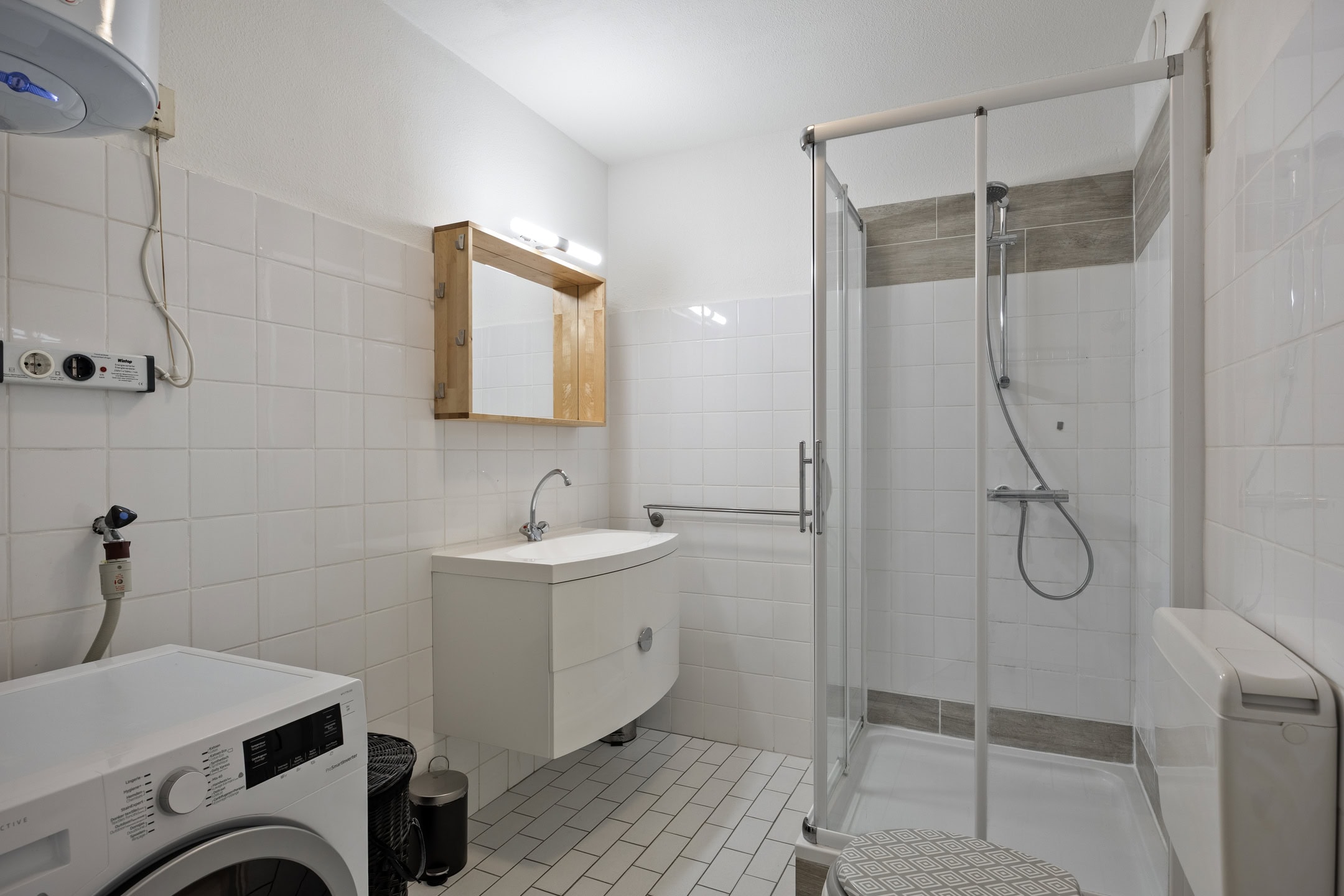 De keurige badkamer is gedeeltelijk betegeld, in lichte kleuren uitgevoerd en voorzien van een douchecabine, toilet, wastafel met wastafelmeubel en spiegel. Tevens zijn hier een elektrische boiler en de aansluitingen voor wasapparatuur te vinden.