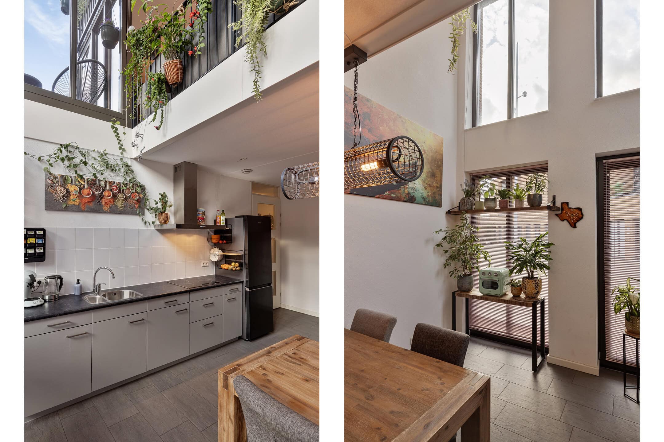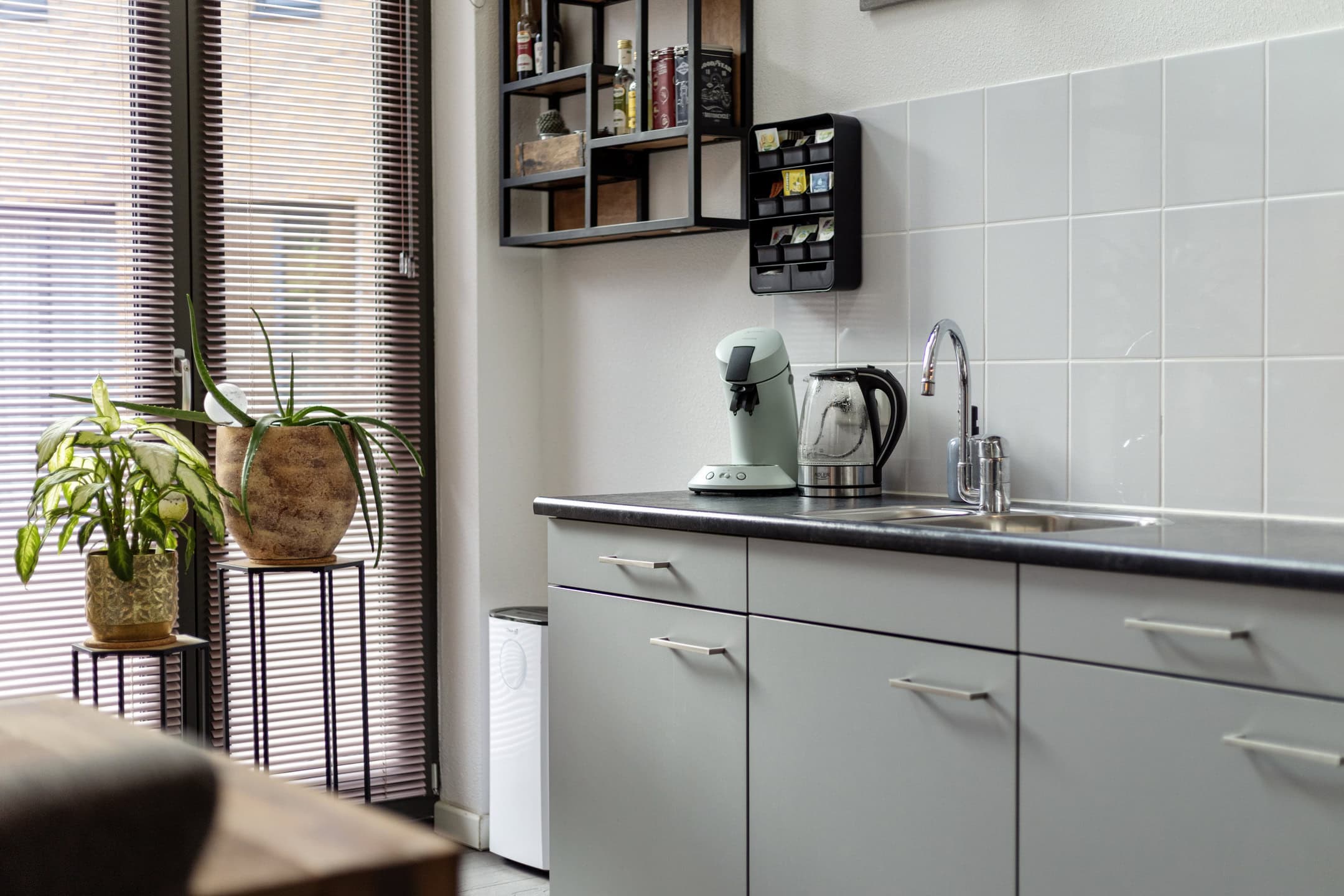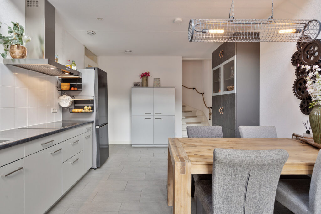 De moderne keuken is praktisch ingericht met diverse onderkasten, een aanrechtblad met geïntegreerde 1,5 spoelbak, een keramische kookplaat en een afzuigschouw. Dankzij de openslaande deuren naar de straatzijde is er prettig contact met buiten en valt er veel natuurlijk licht binnen. Een fijne plek om te koken, tafelen en gasten te ontvangen.